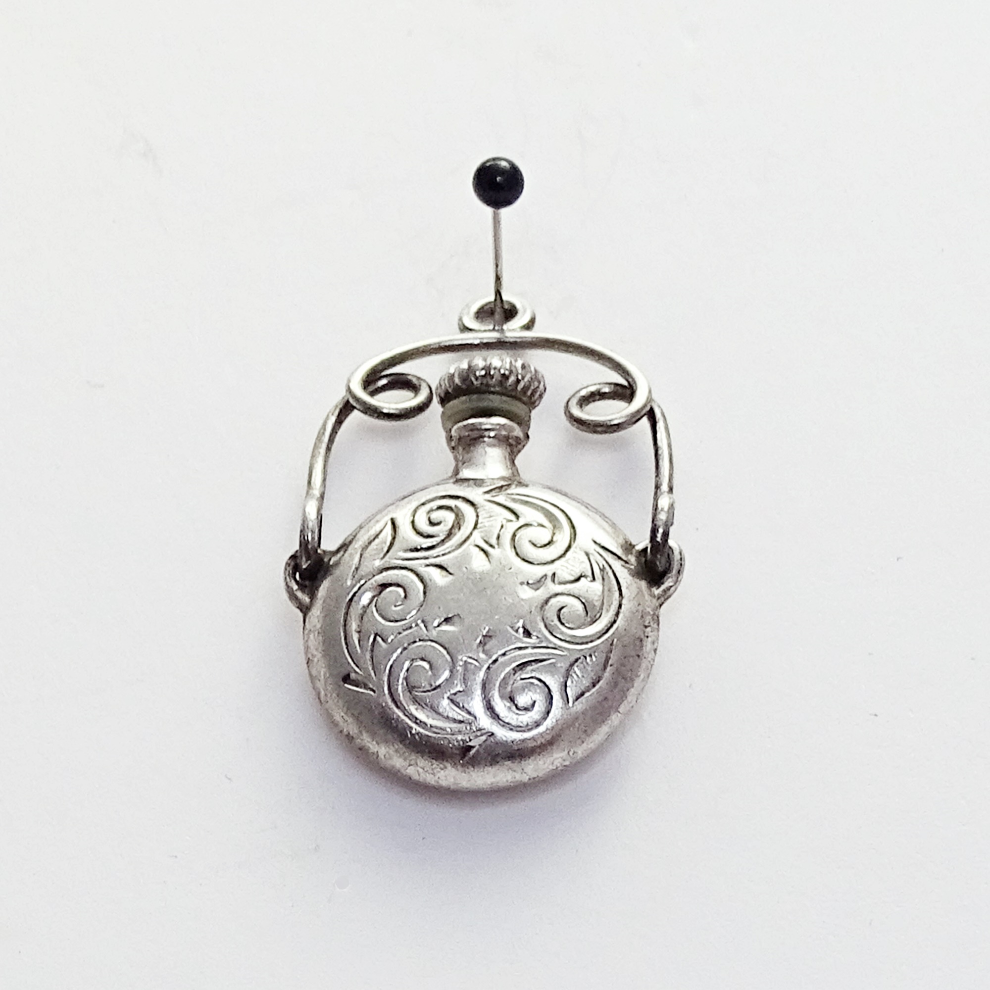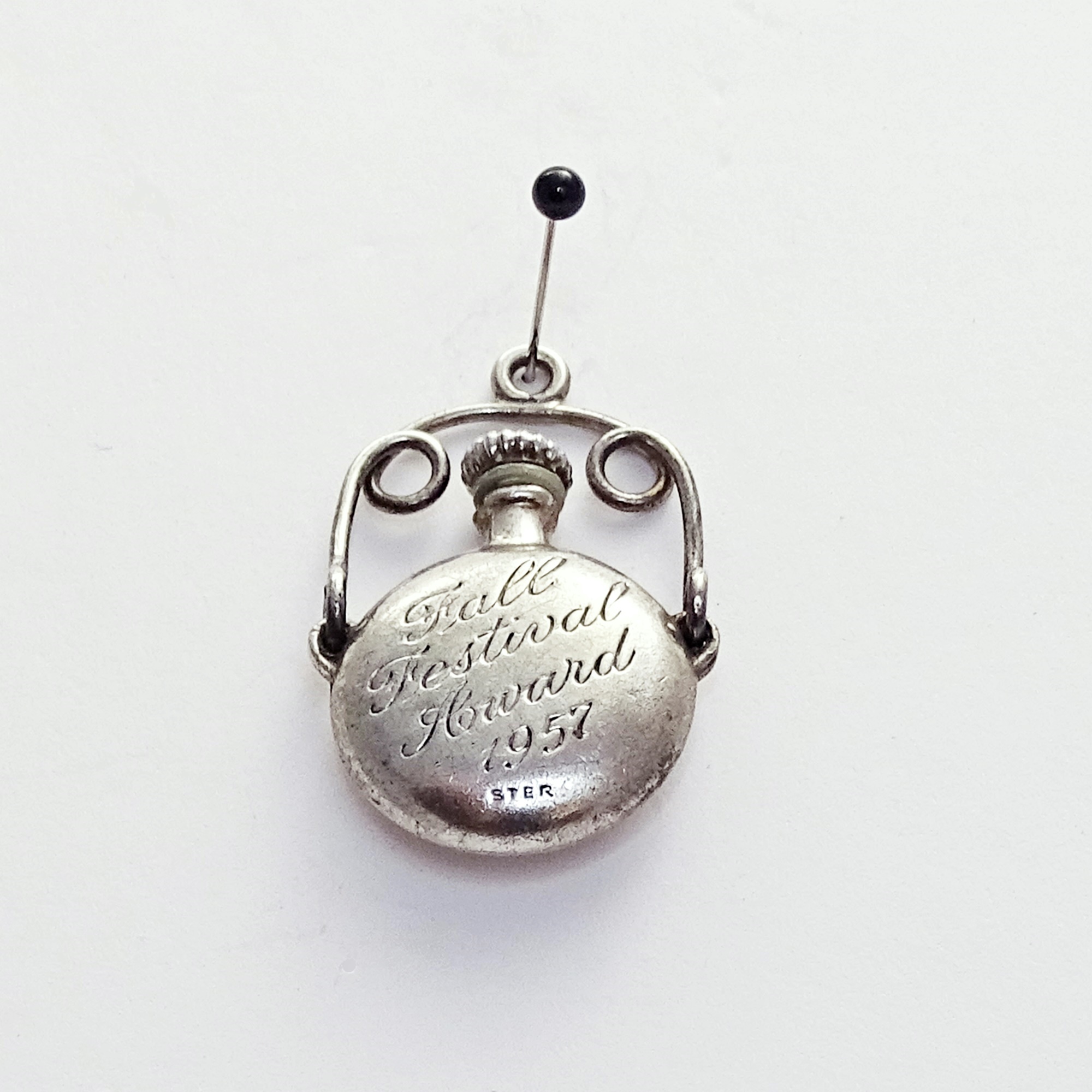 Flat round scent bottle with moving hinged handle to wear like a tiny pendant. The silver is embossed with a wave motif on the front. On the back the words “Fall Festival Award 1957” and STER.
