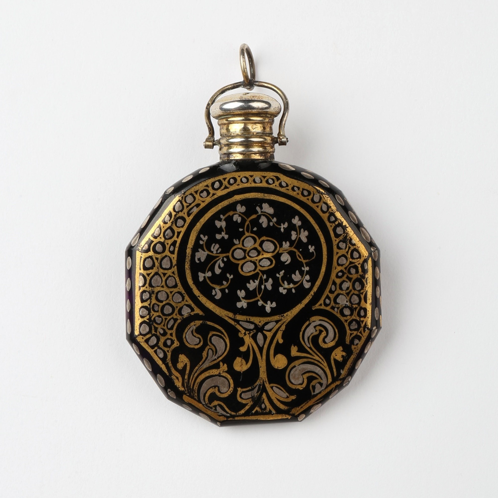 Flattened dodecagon-shaped scent bottle in black glass with a rich formal pattern in enamelled gold on both sides. Screw vermeil cap with tiny silver mark and little sospension ring. Inner glass stopper, .