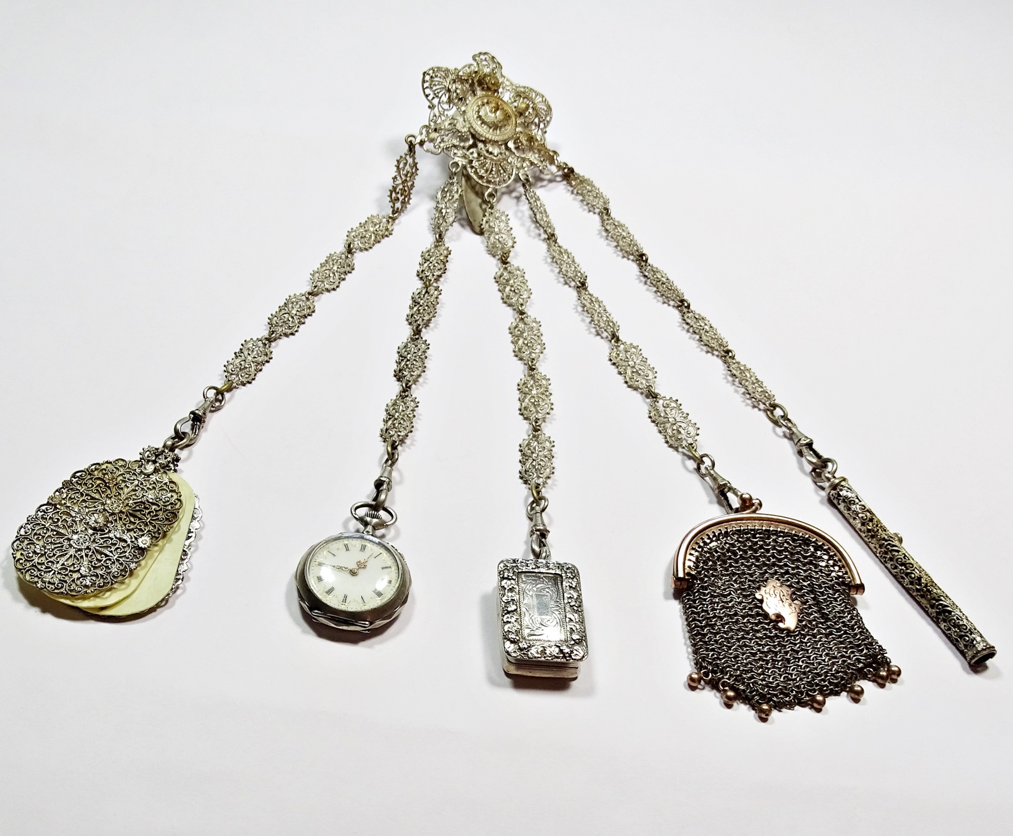 Flower-shaped belt chatelain in German silver with five items in different styles and periods