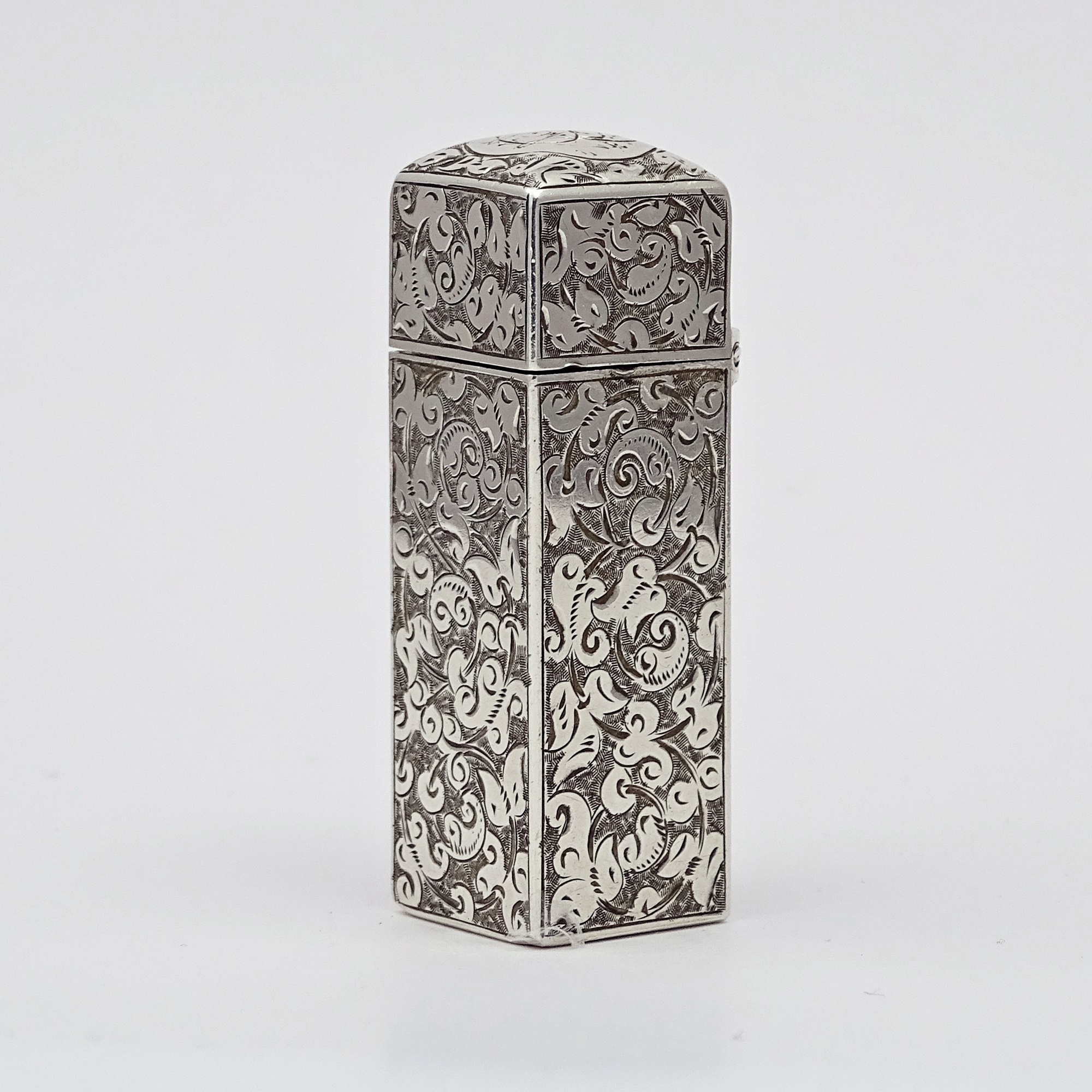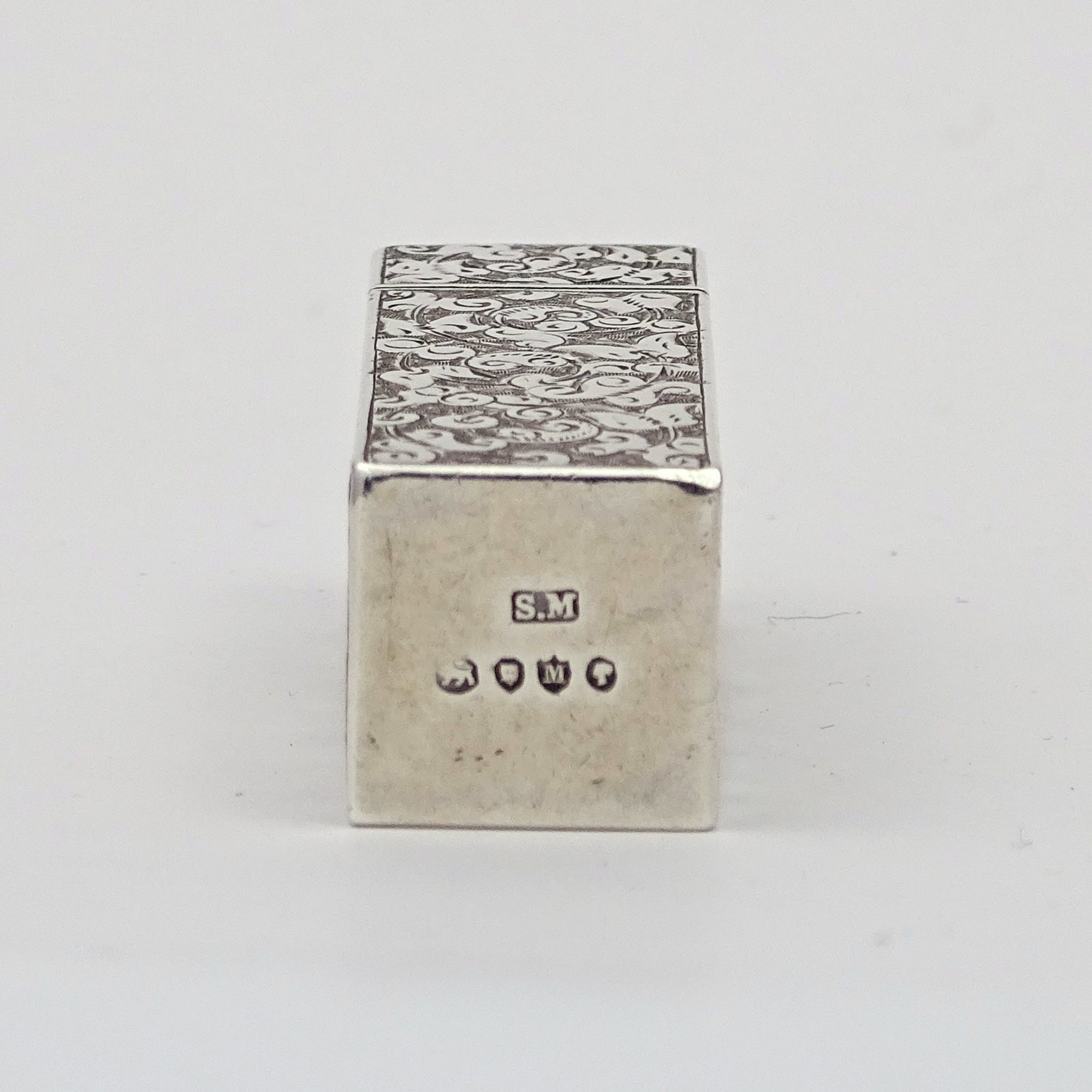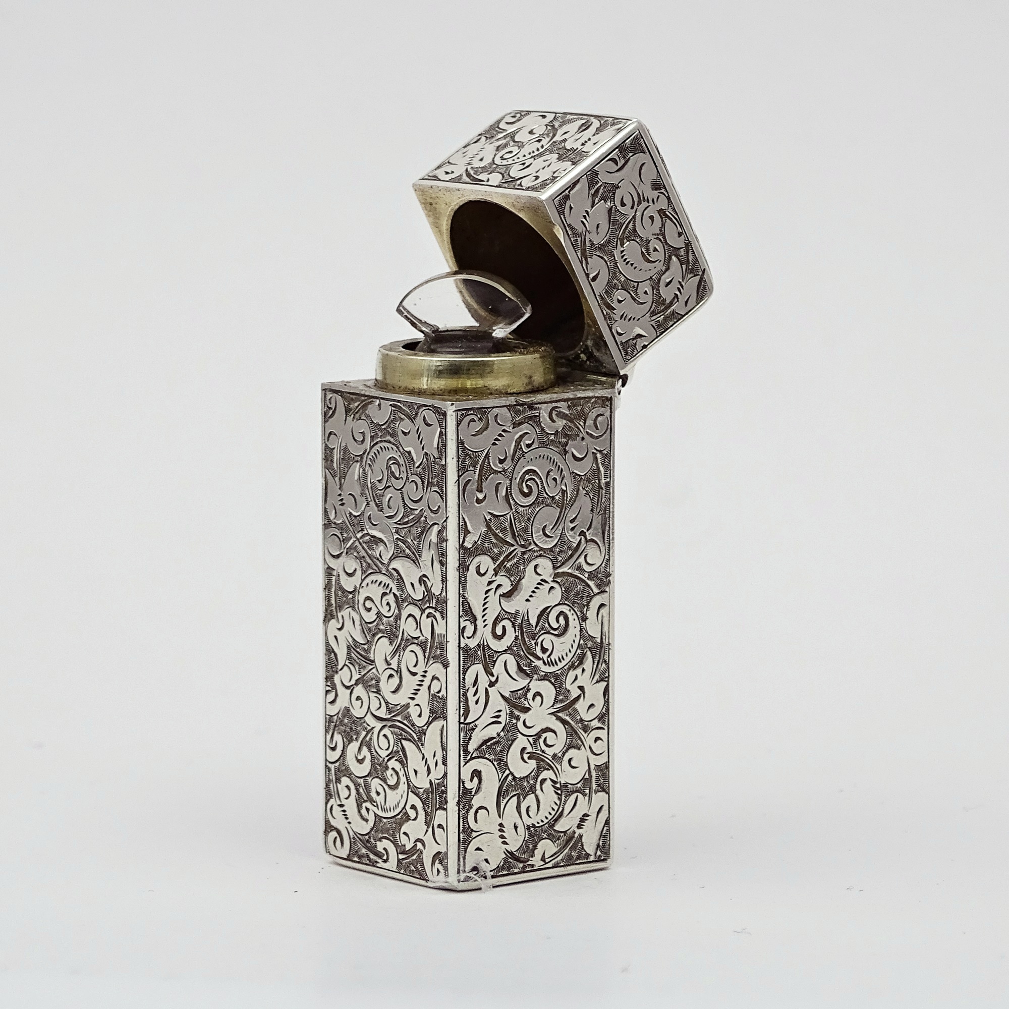 Foliate and scrollwork engraved silver square scent bottle, with a hinged top and glass stopper. Full hallmarked for silver, London 1887, maker’s mark “SM” for Sampson Mordan.