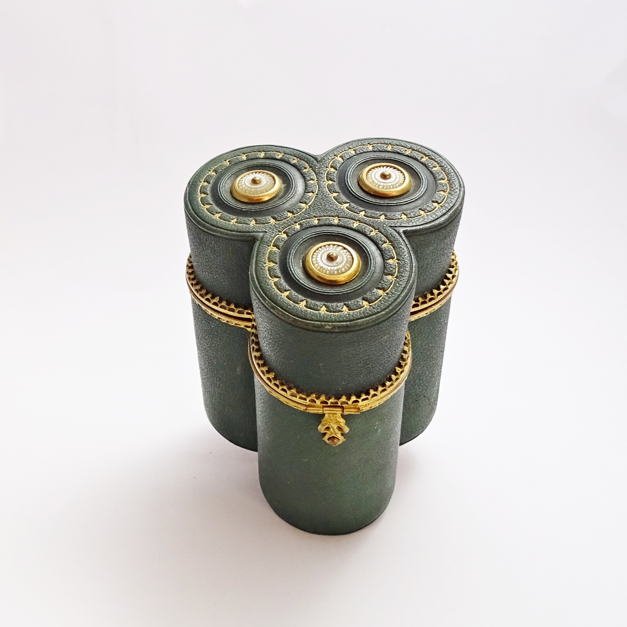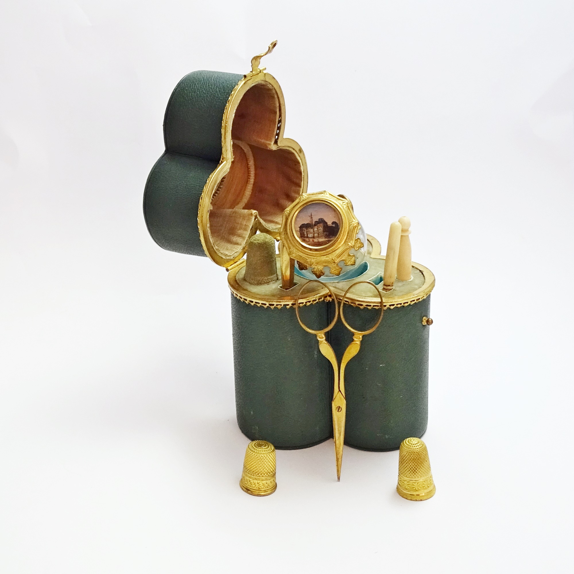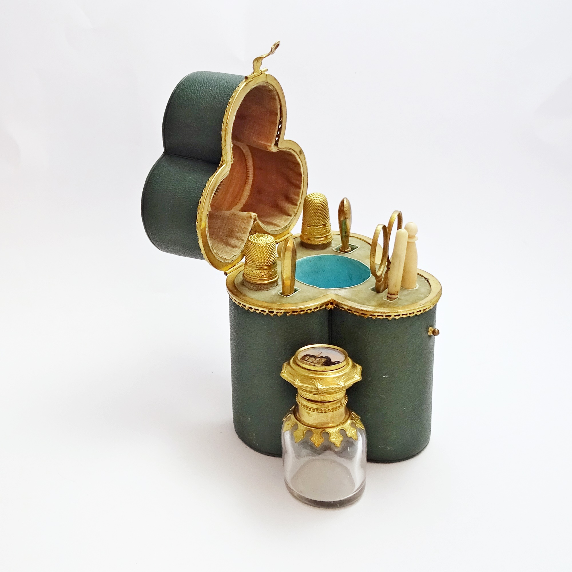 Palais Royal necessaire in green leather casket box, trilobed in shape and refined in bronze dorè. Hinged cap with internal round mirror. Velour interior made to host a pair of scissors, two gilded silver thimbles, two ivory awls, two metal bodkins and a scent bottle with hinged ormolu cap and graphic of the Tuileries Palace. Inner ivory and metal stopper.