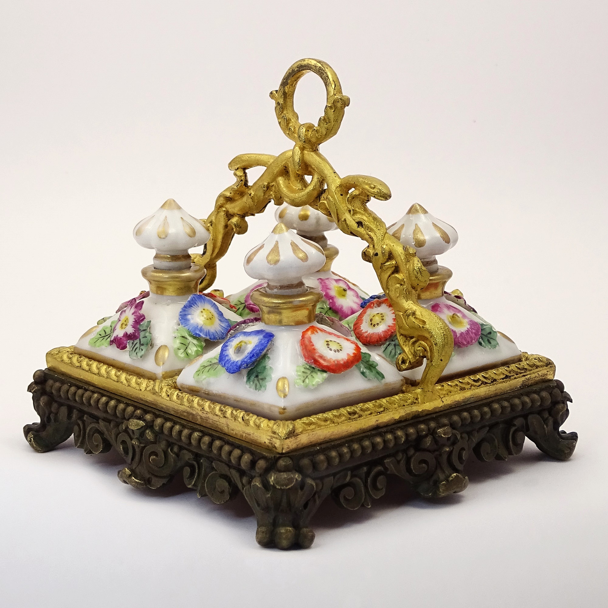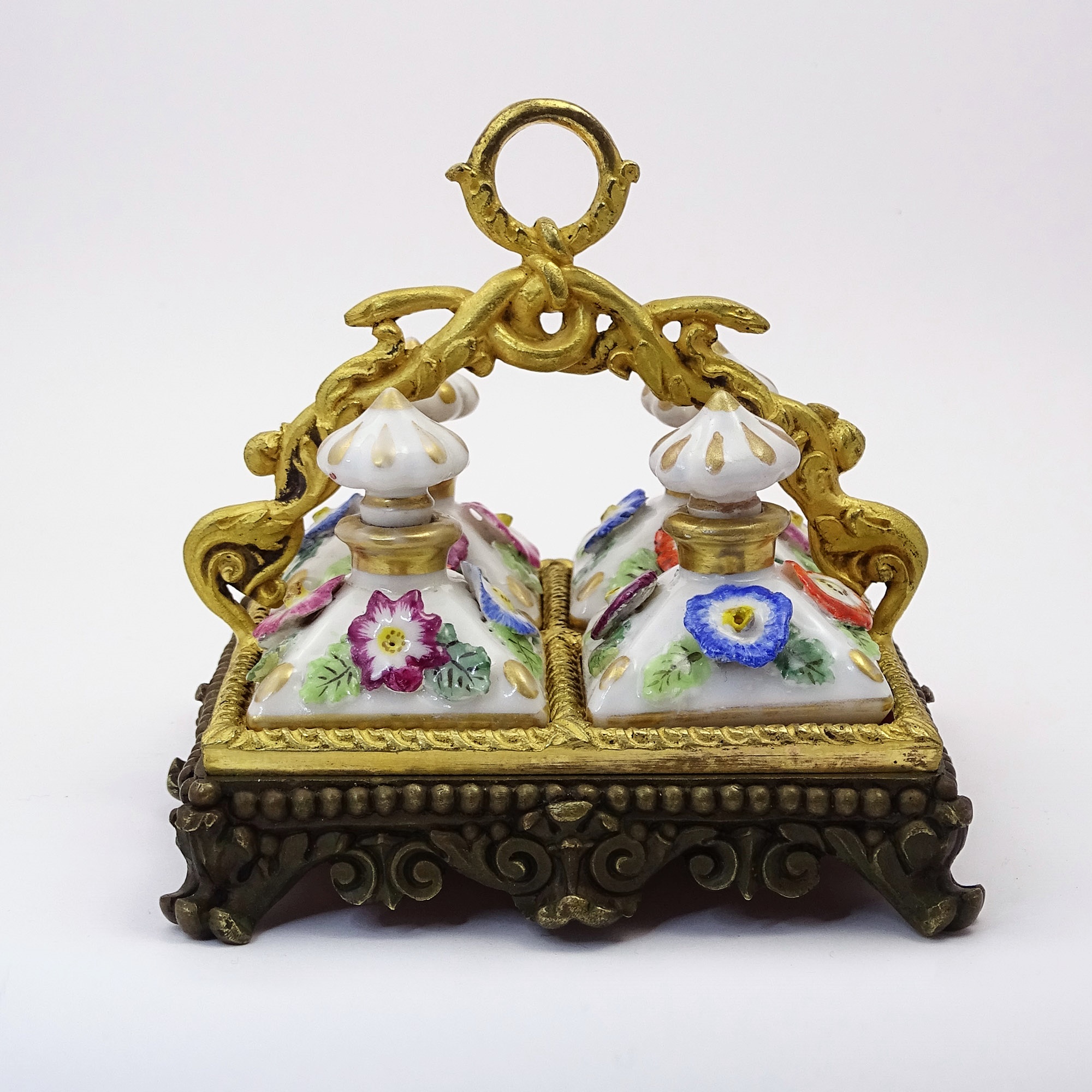 Tray in gilt wood, red velvet and bronze containing four decorated porcelain bottles with encrusted flowers of different colours, in Vieux Paris style. The handle ending with a suspension ring facilitates the movement of the set.