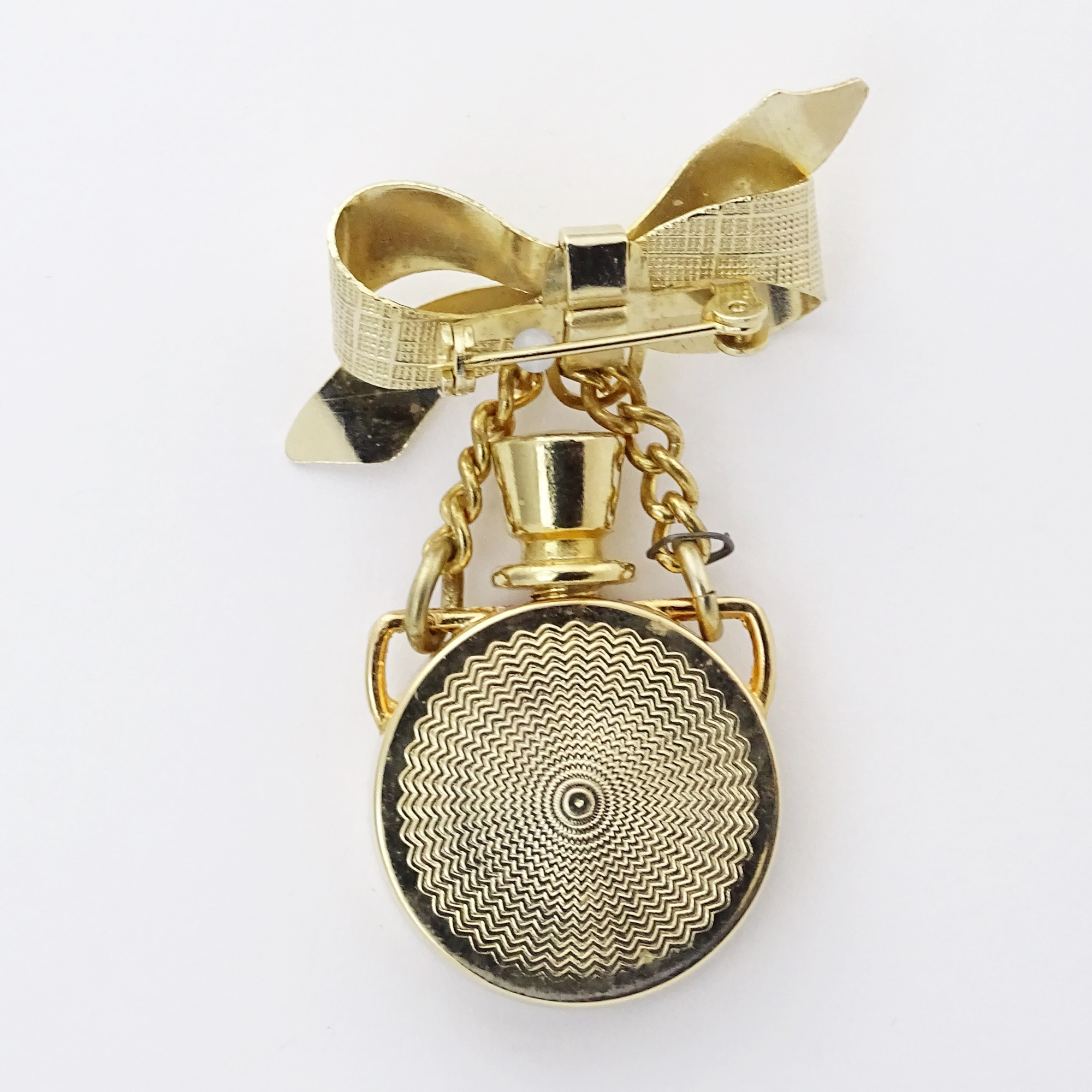 Gilt metal scent bottle, souvenir of Washington DC, bearing a scroll with the word “Washington DC” and showing important monuments all around. The back side is knurled. Screw cap with a short wand and suspension chain, ending in a ribbon-shaped brooch.