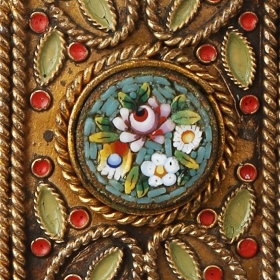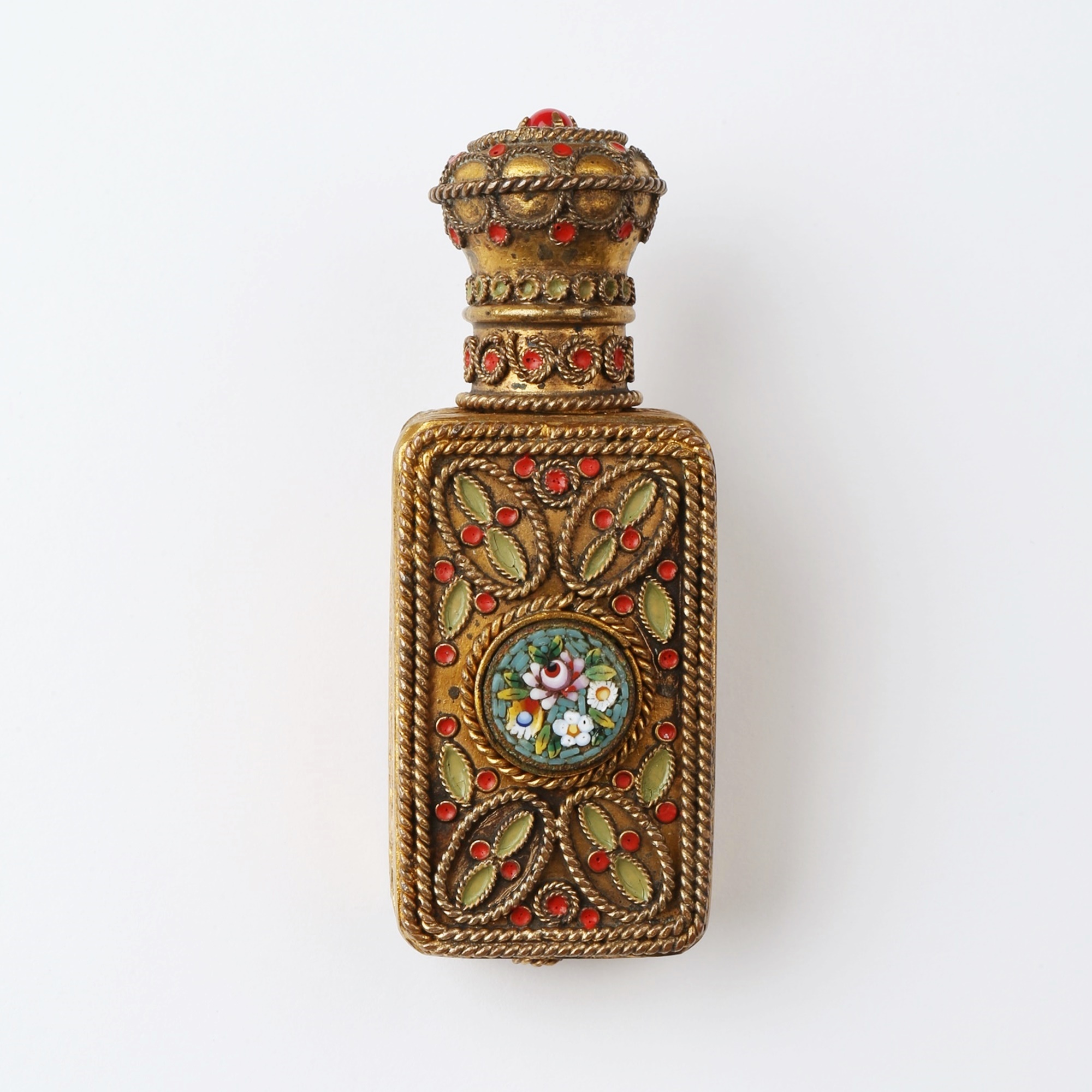 Richly decorated gilt metal scent bottle with red and green enamel touches and a micromosaic depicting a bouquet on the front. The back side is knurled. The decorated cap ends with a red stone and is attached to the bottle by a little chain. No marks.