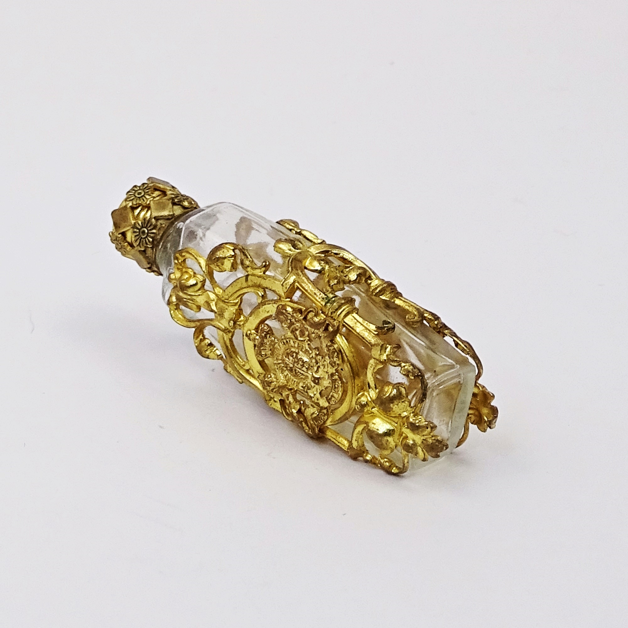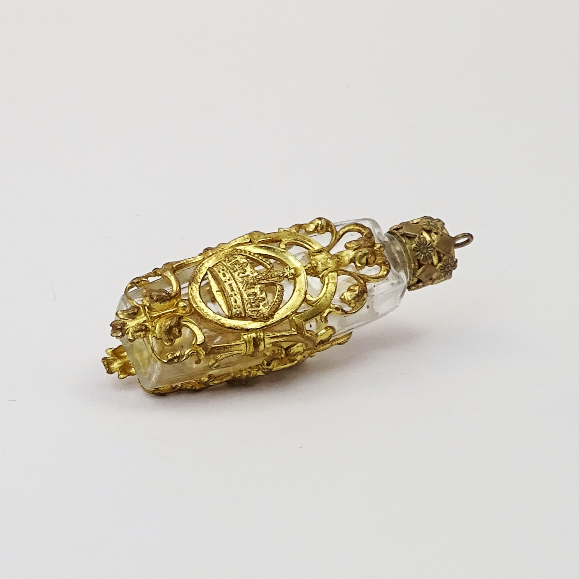 Scent bottle made for Elizabeth II’s coronation. The clear glass bottle is enclosed in a gilt metal cage with the royalty hemblems. Screw ornate cap with suspension ring.