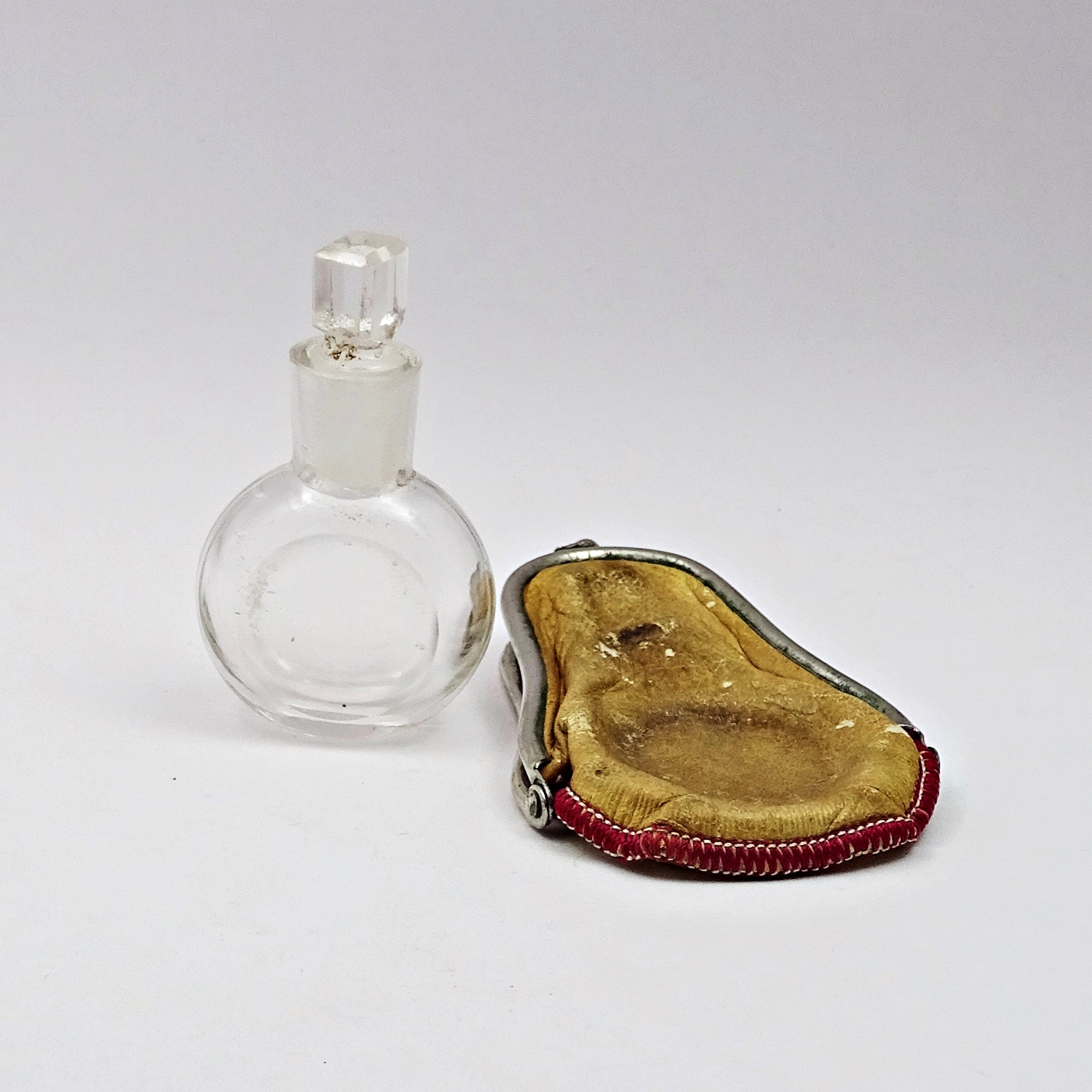 Plain glass salts bottle and stopper with round body, in a leather purse with snap closure.