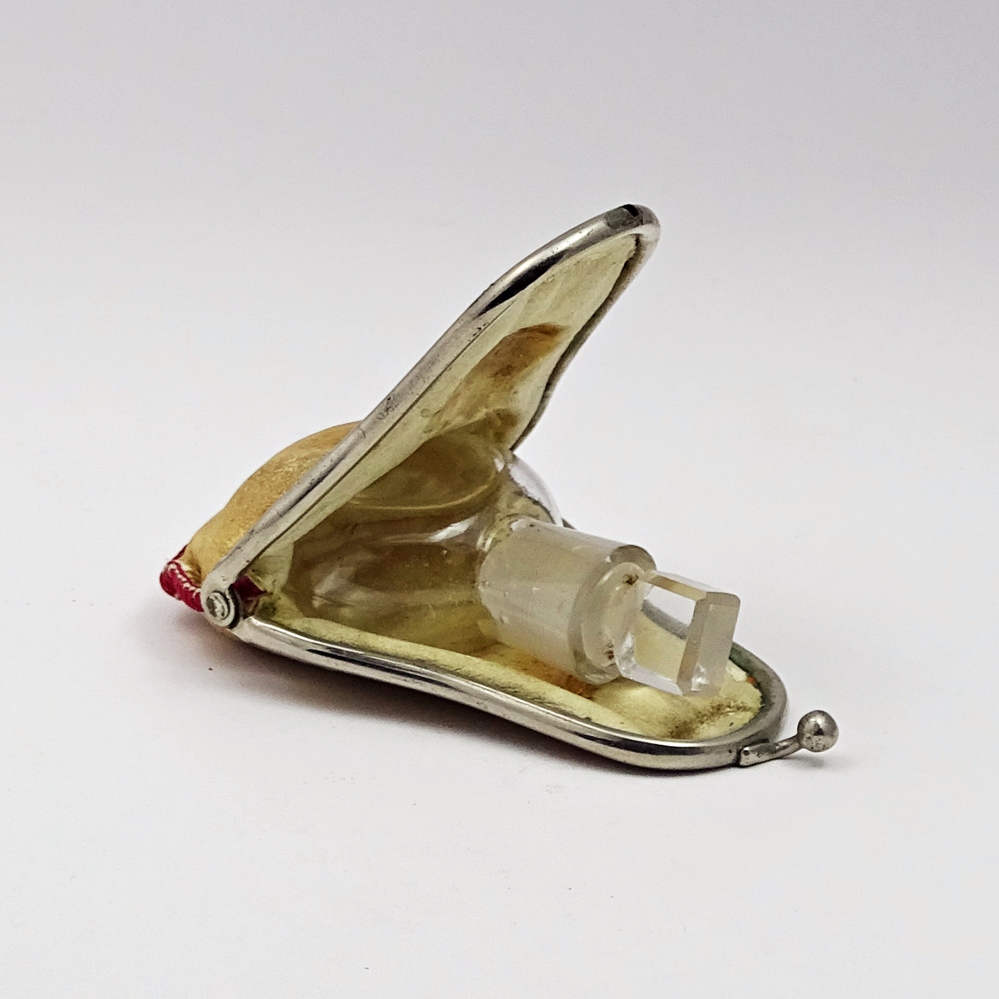 Scent-jar in closed pomander form, in silver with chased floral ornaments. It opens in four parts: the bottom contains a sponge th...