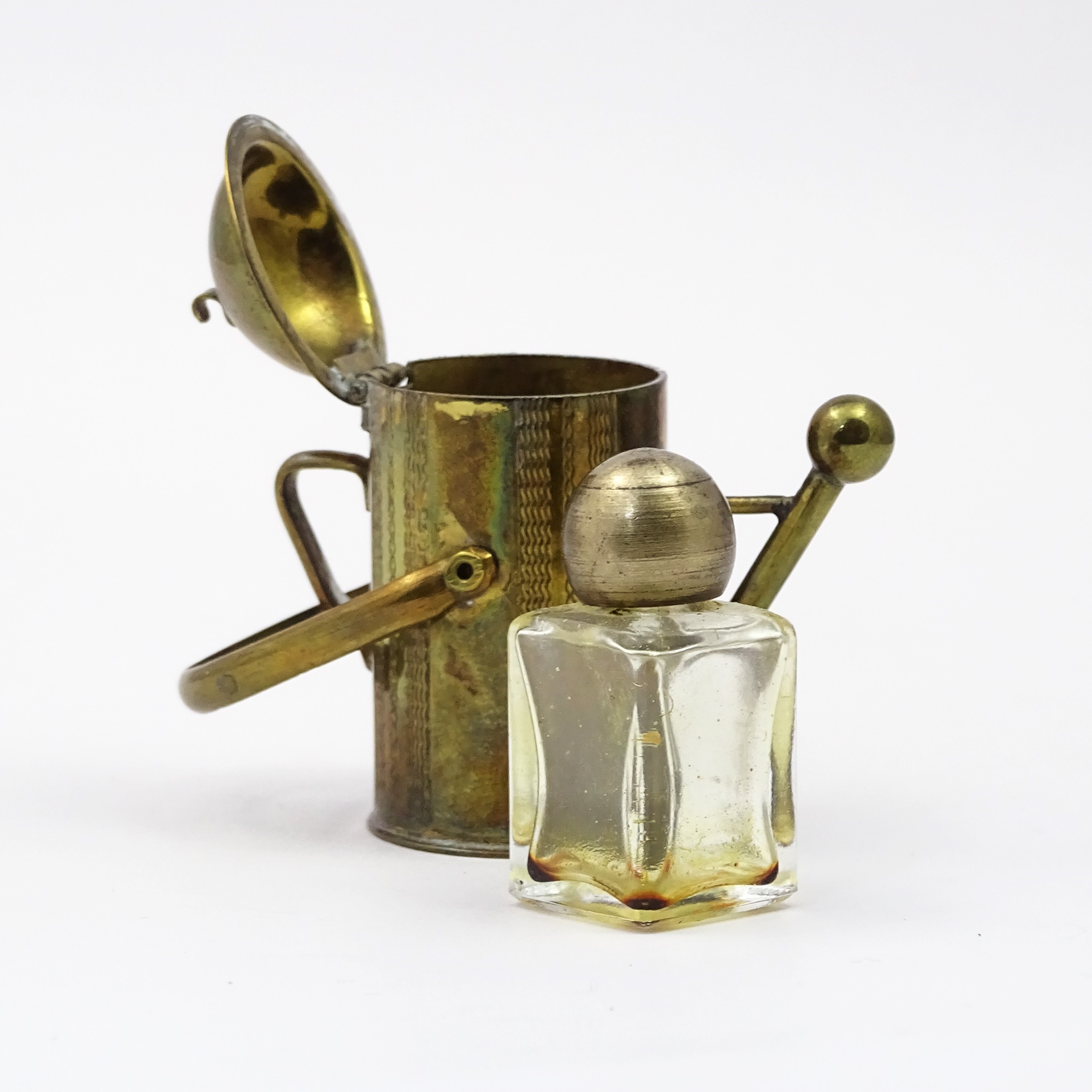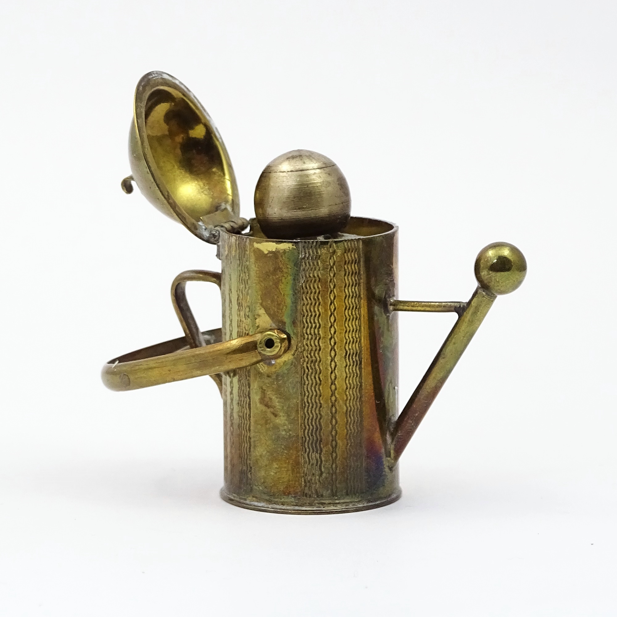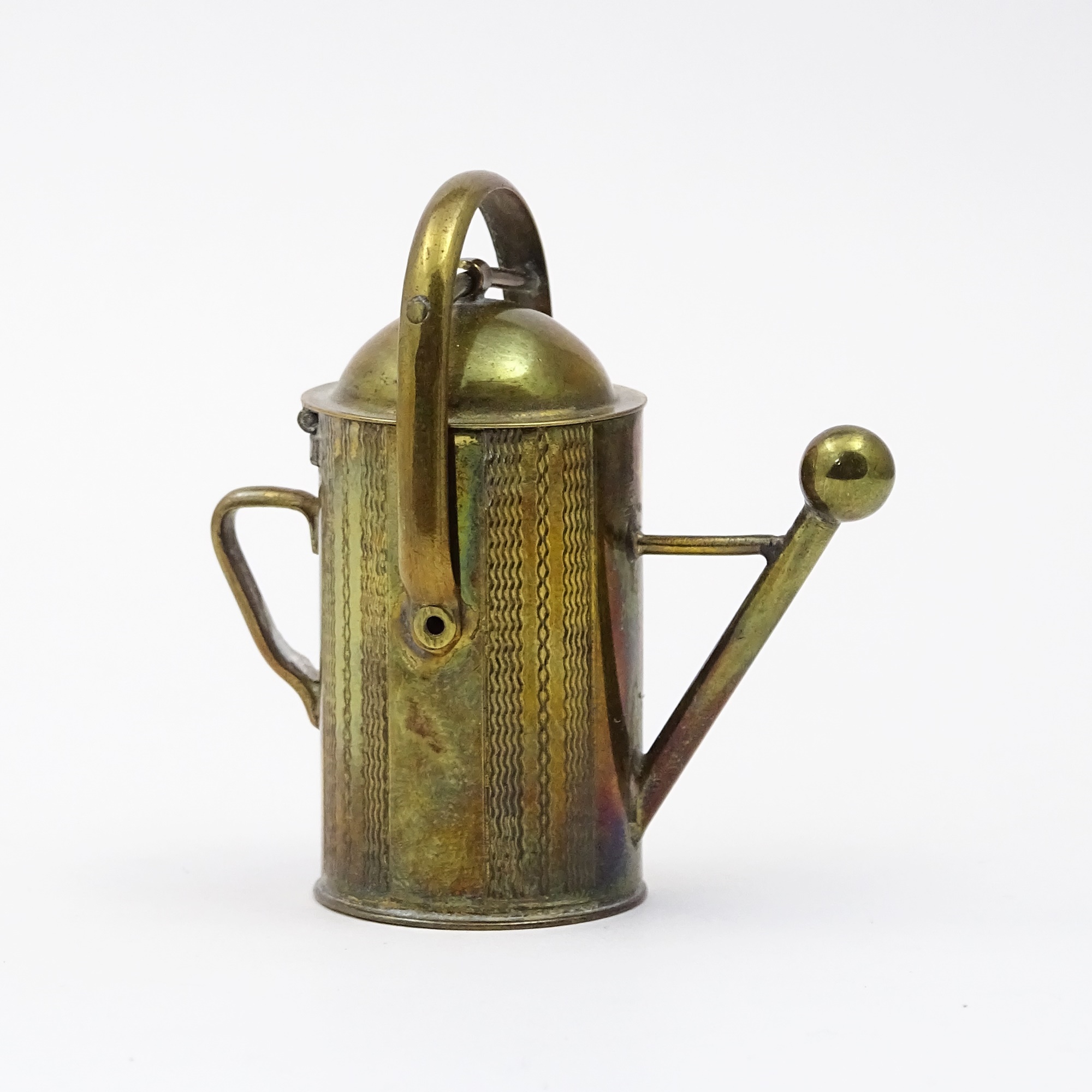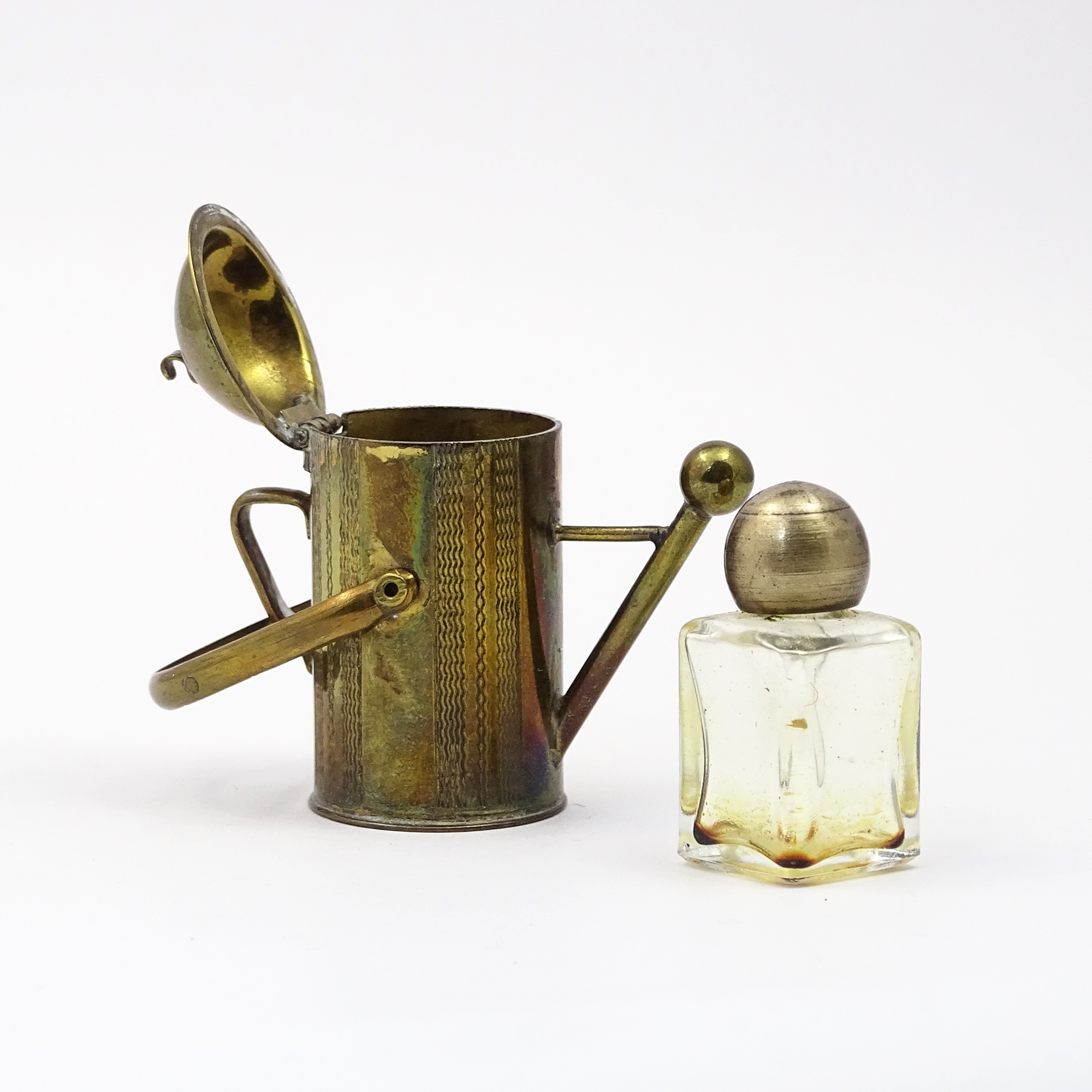 Novelty scent bottle in the shape of a brass watering can. A glass square shaped flacon with globular metal cap appears when the hinged lid opens and a spring mechanism lifts it. The watering can looks an Arts & Crafts object.