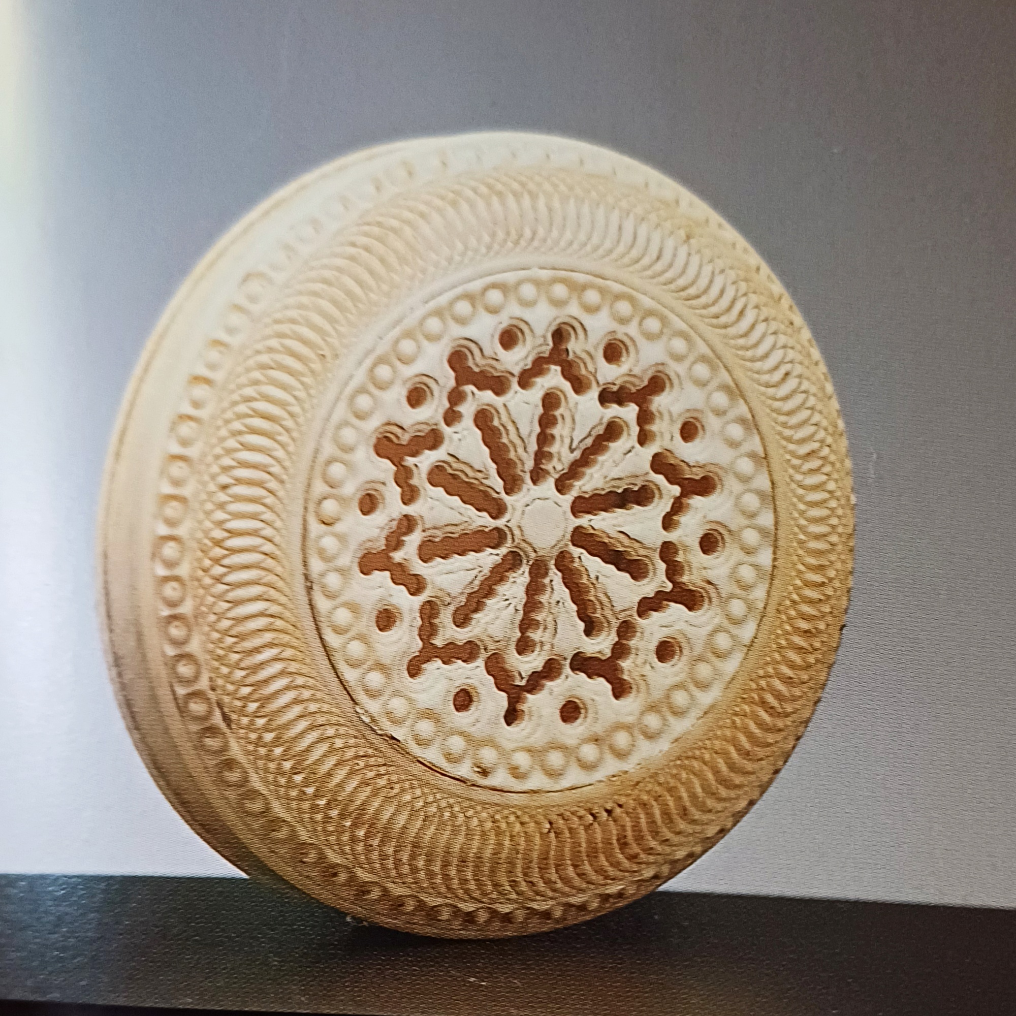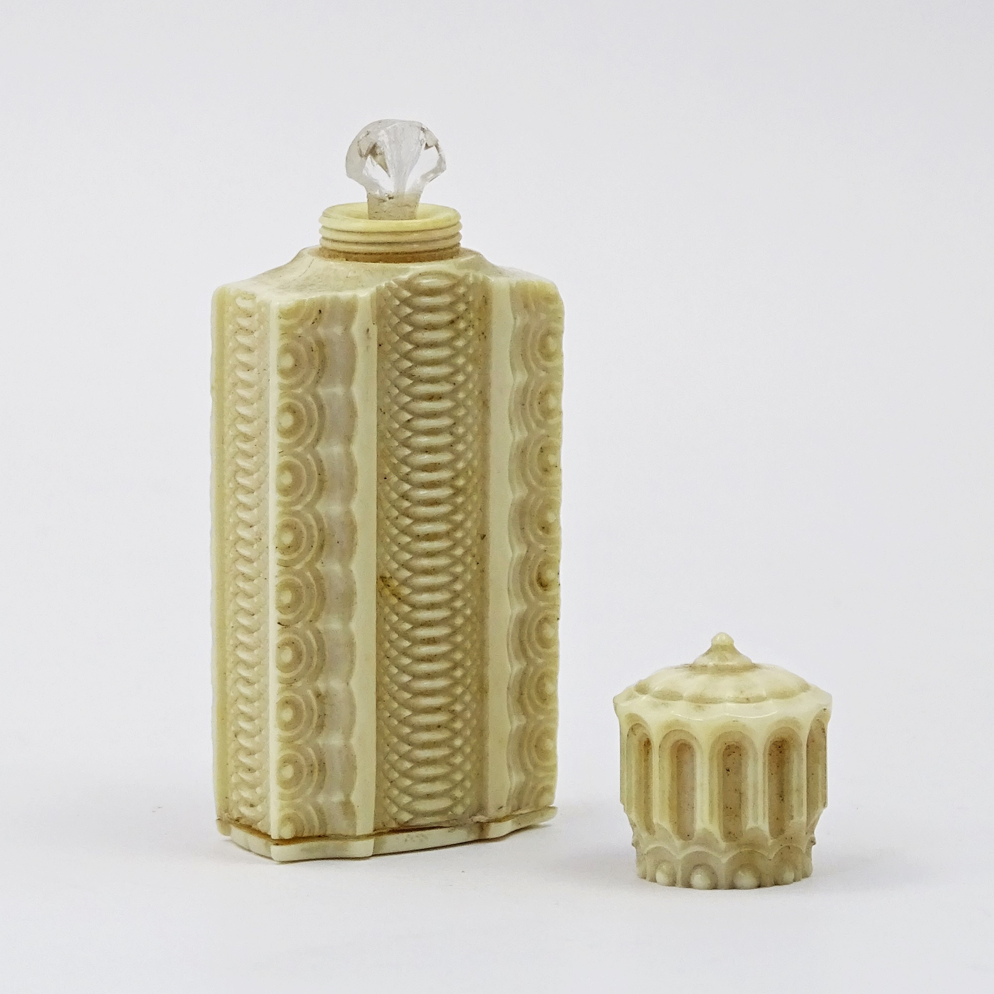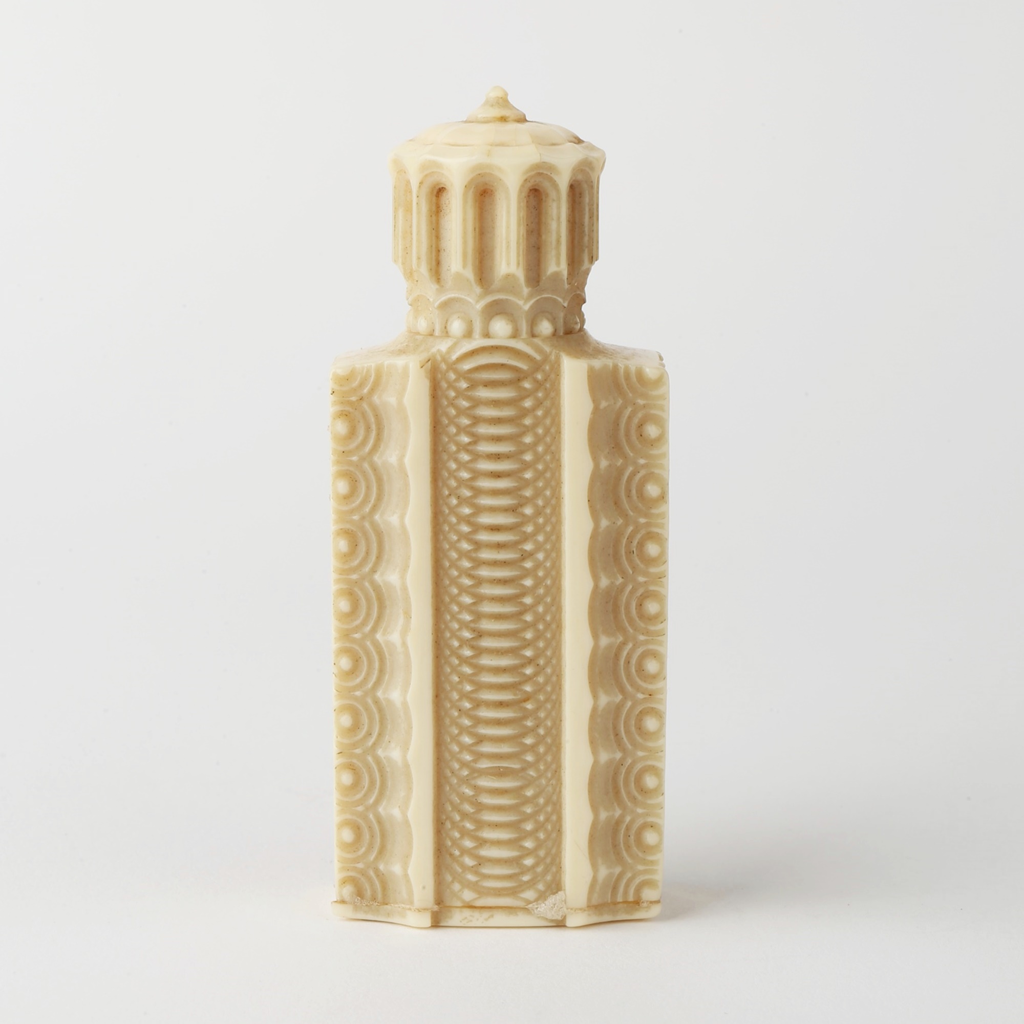 Ivory scent bottle made of different panels finely carved. Screw cap in the shape of a Romanic tower. Inner glass bottle and stopper with palmette. CITES