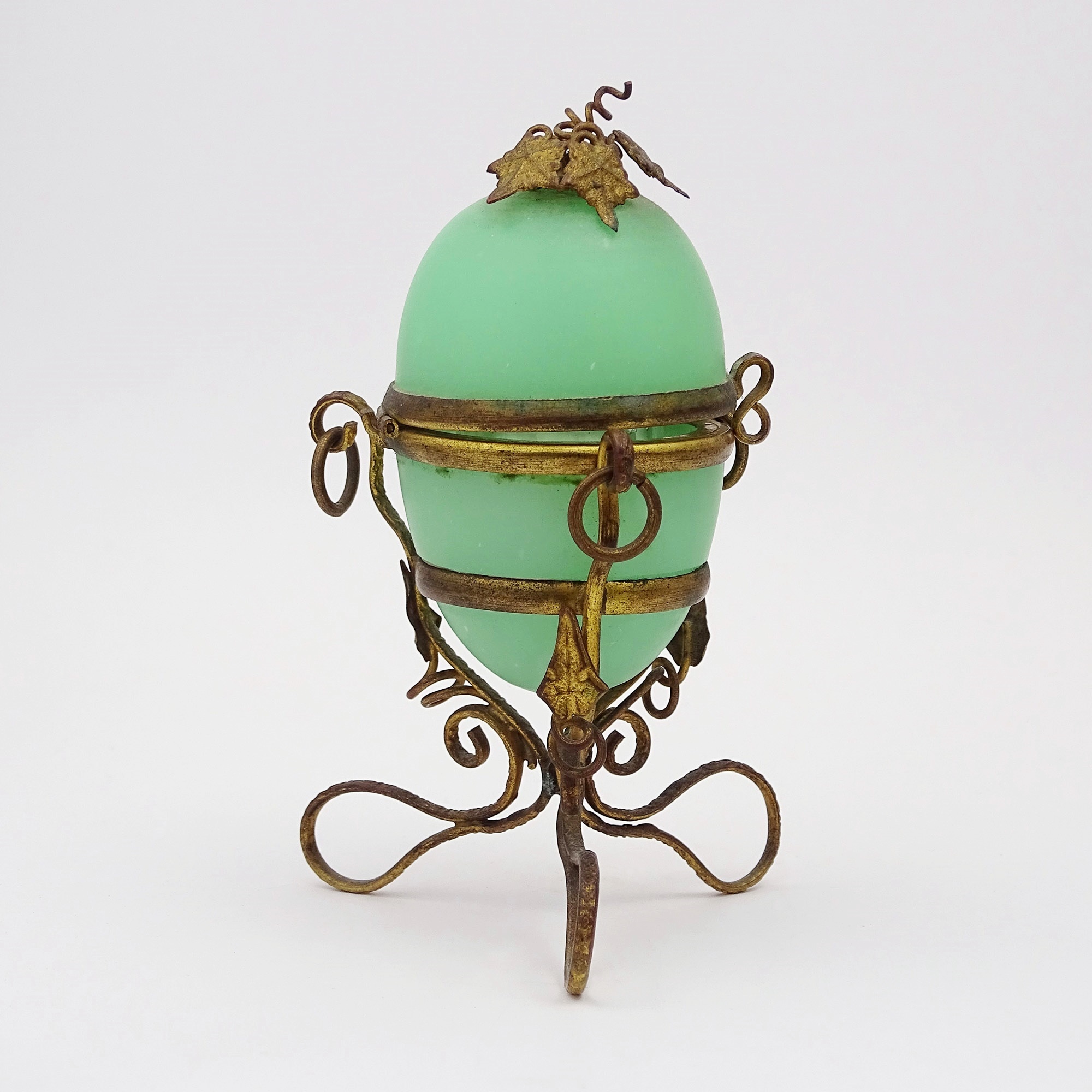Palais Royal presentation: green opaline egg mounted in gilded bronze with three scrolled legs and small rings on the handles. The hinged lid ends with vine leaves, also in ormolu. Inside is a square glass bottle with a silver hinged cap and a glass inner stopper. Small French hallmarks for the silver.