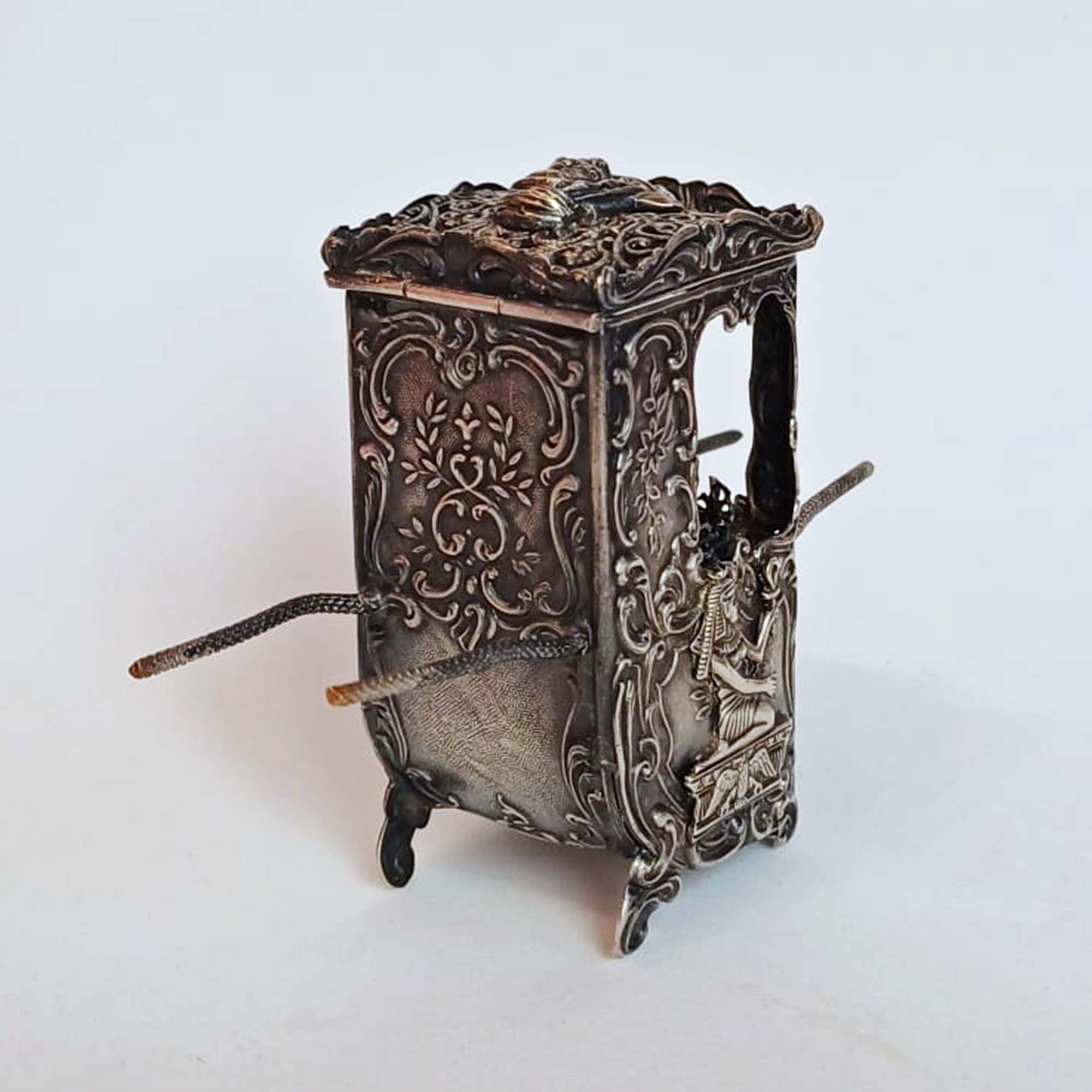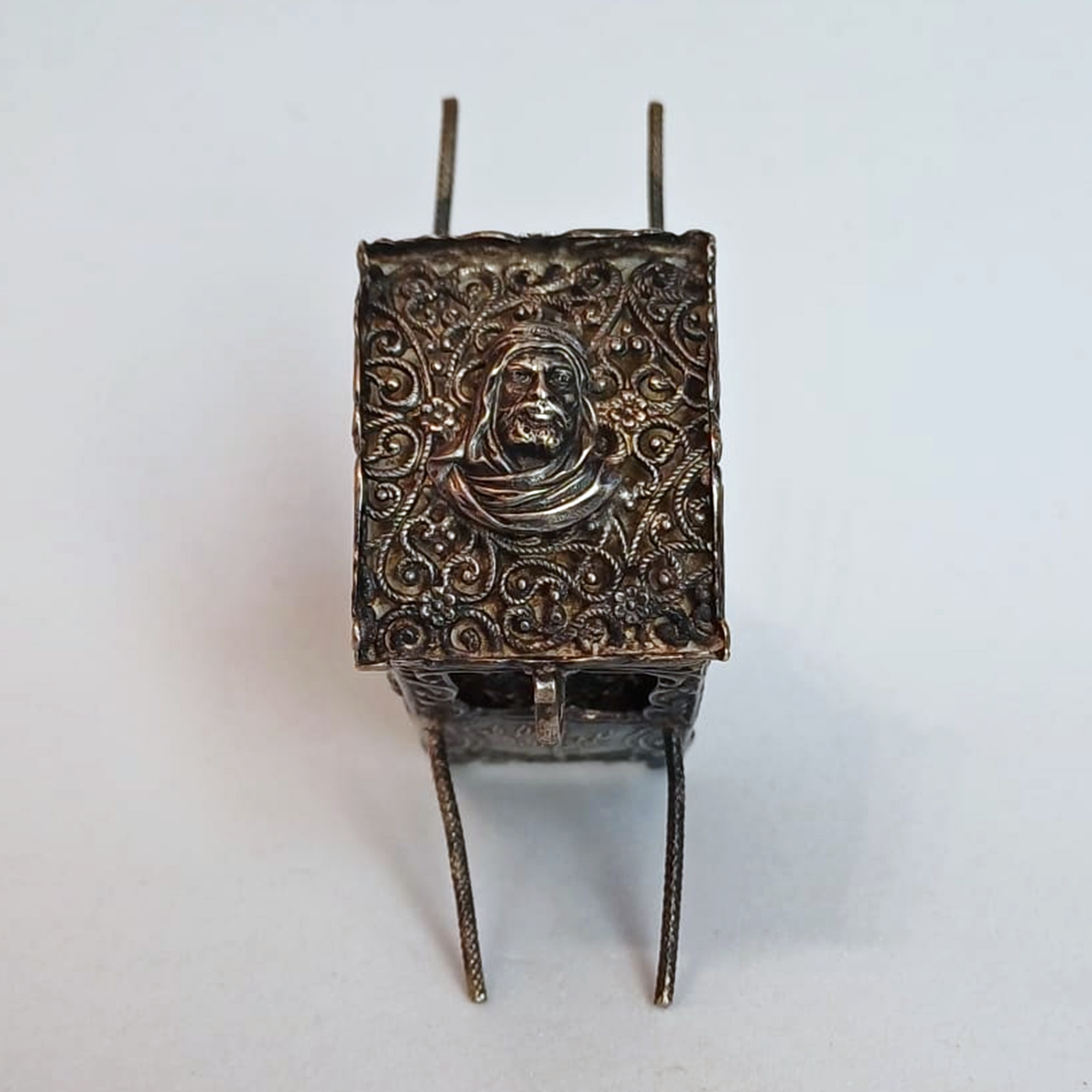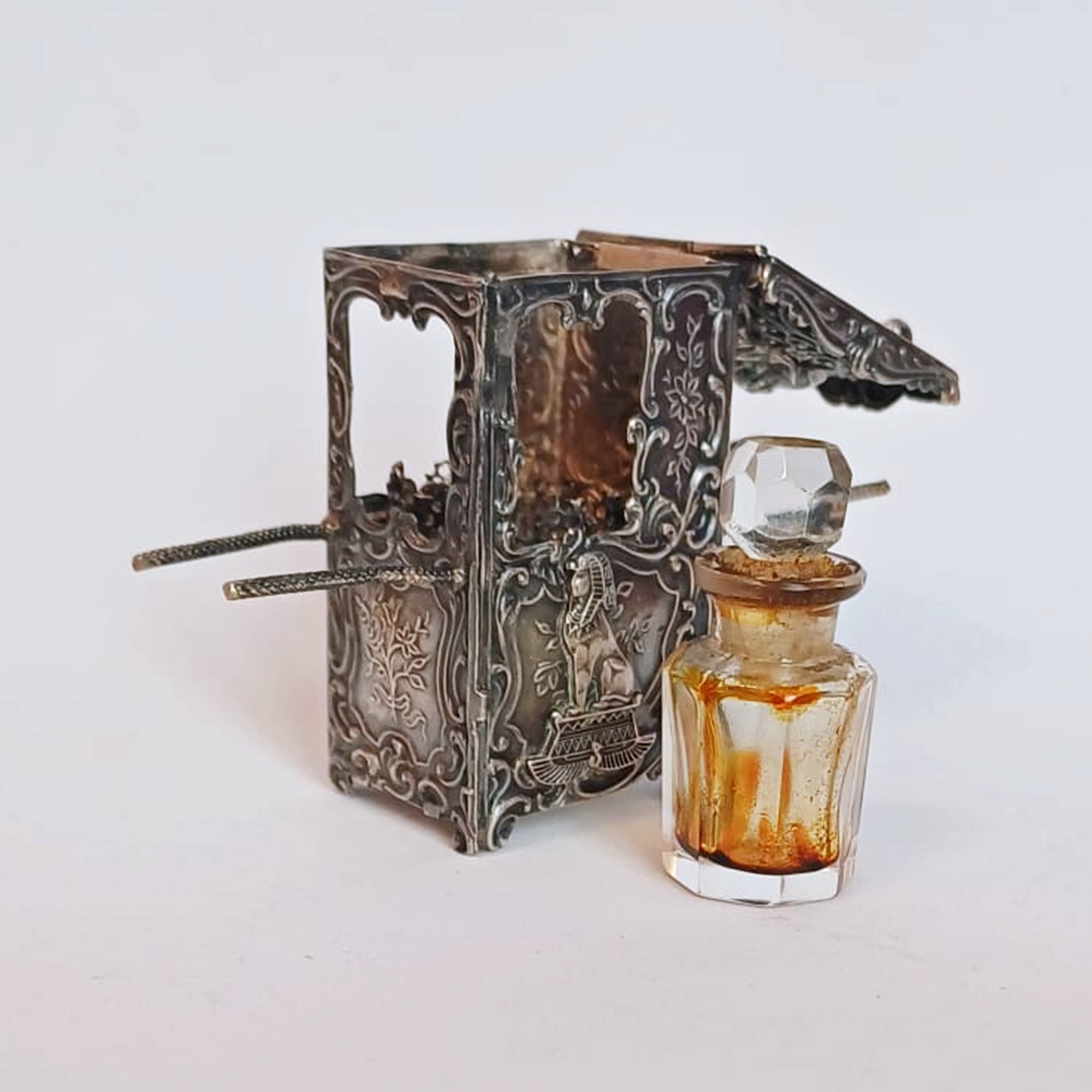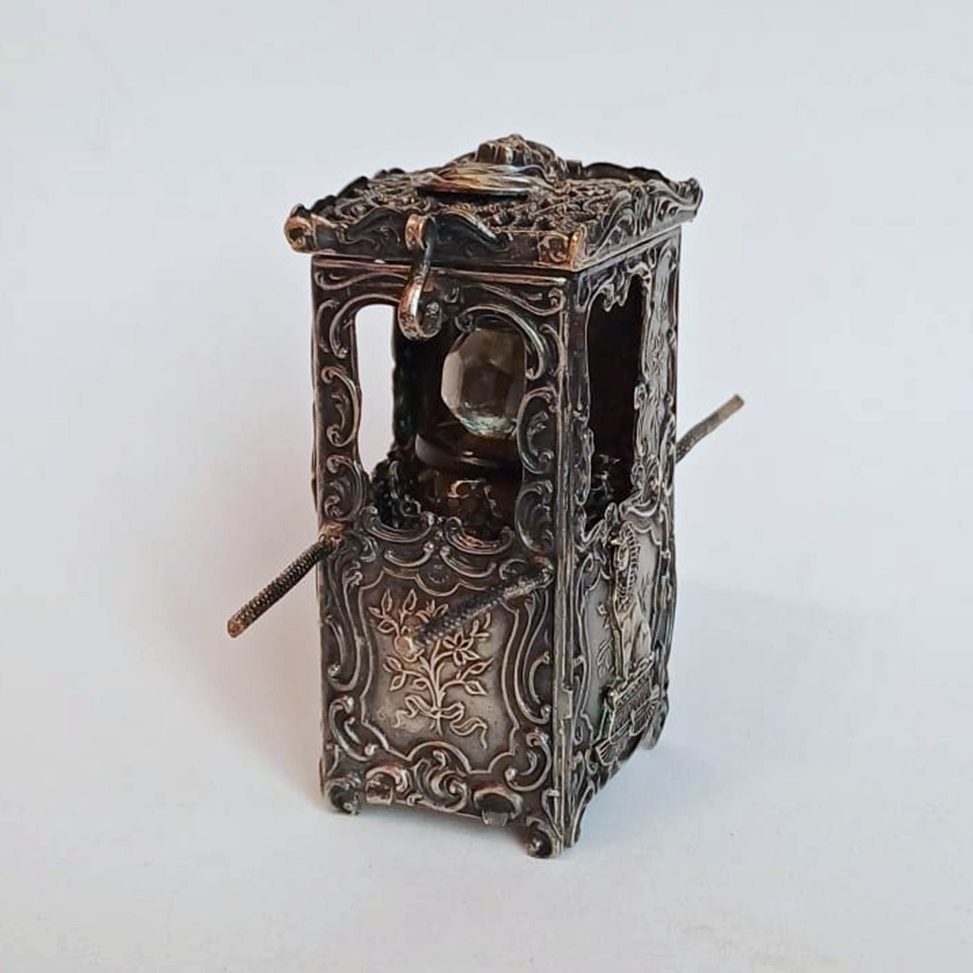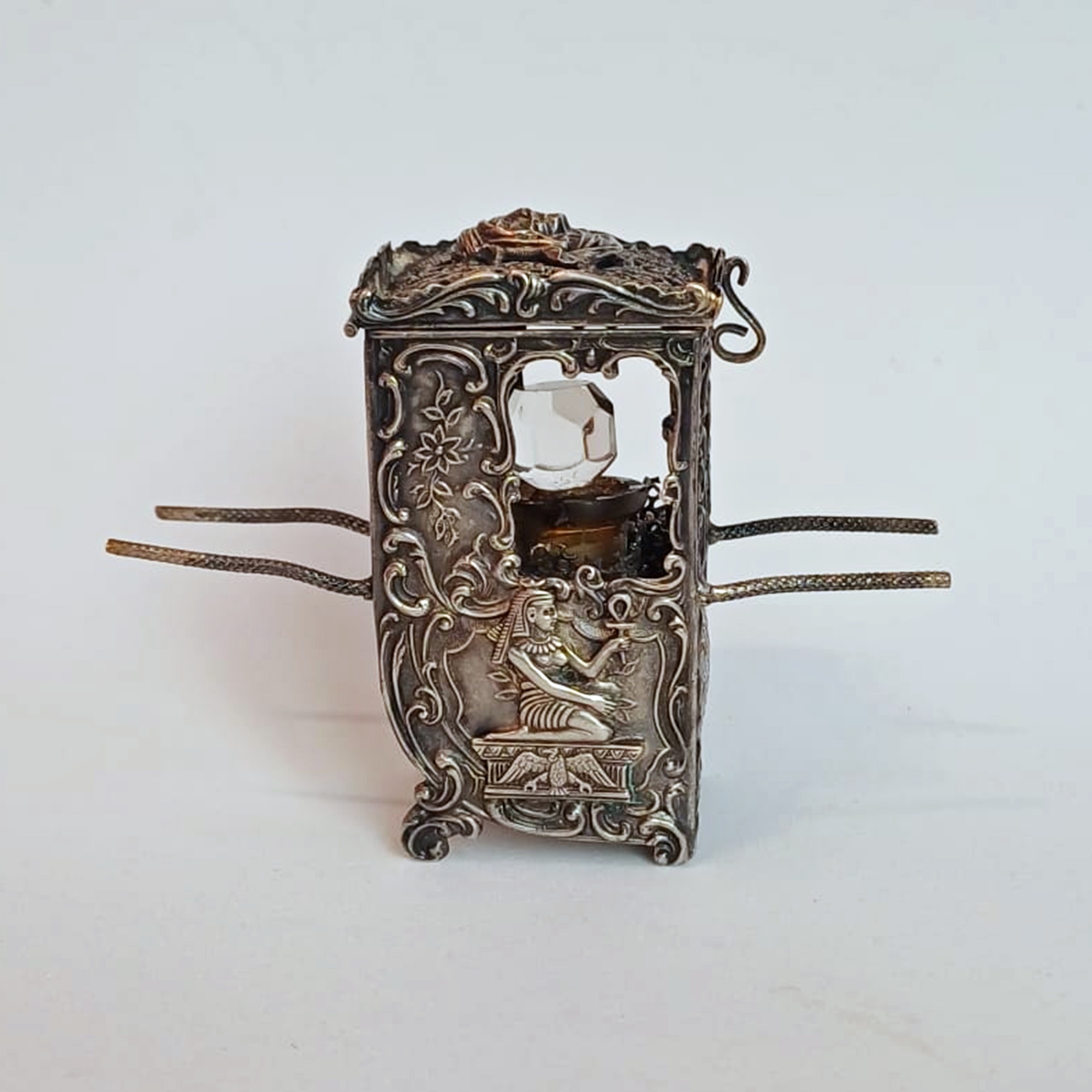 Miniature sedan chair in richly ornated metal with a decor inspired to the ancient Egypt: a sphynx, the goddess Isis holding an Ankh, and the the tree of life. On the top a reliev depicts a bearded man wearing a Kefiah, possibly identified with Moses. It contains an octagonal cut glass scent bottle with faceted spherical cap.