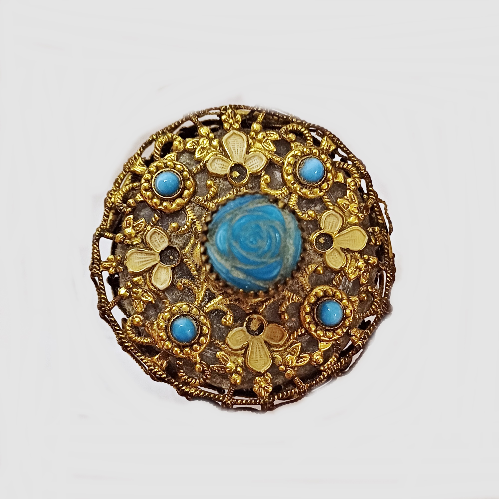 Glass scent bottle trapped in a metal basket embellished with enamel work plus turquoises. Metal cap ending with a rose in turquoise and with a glass wand.