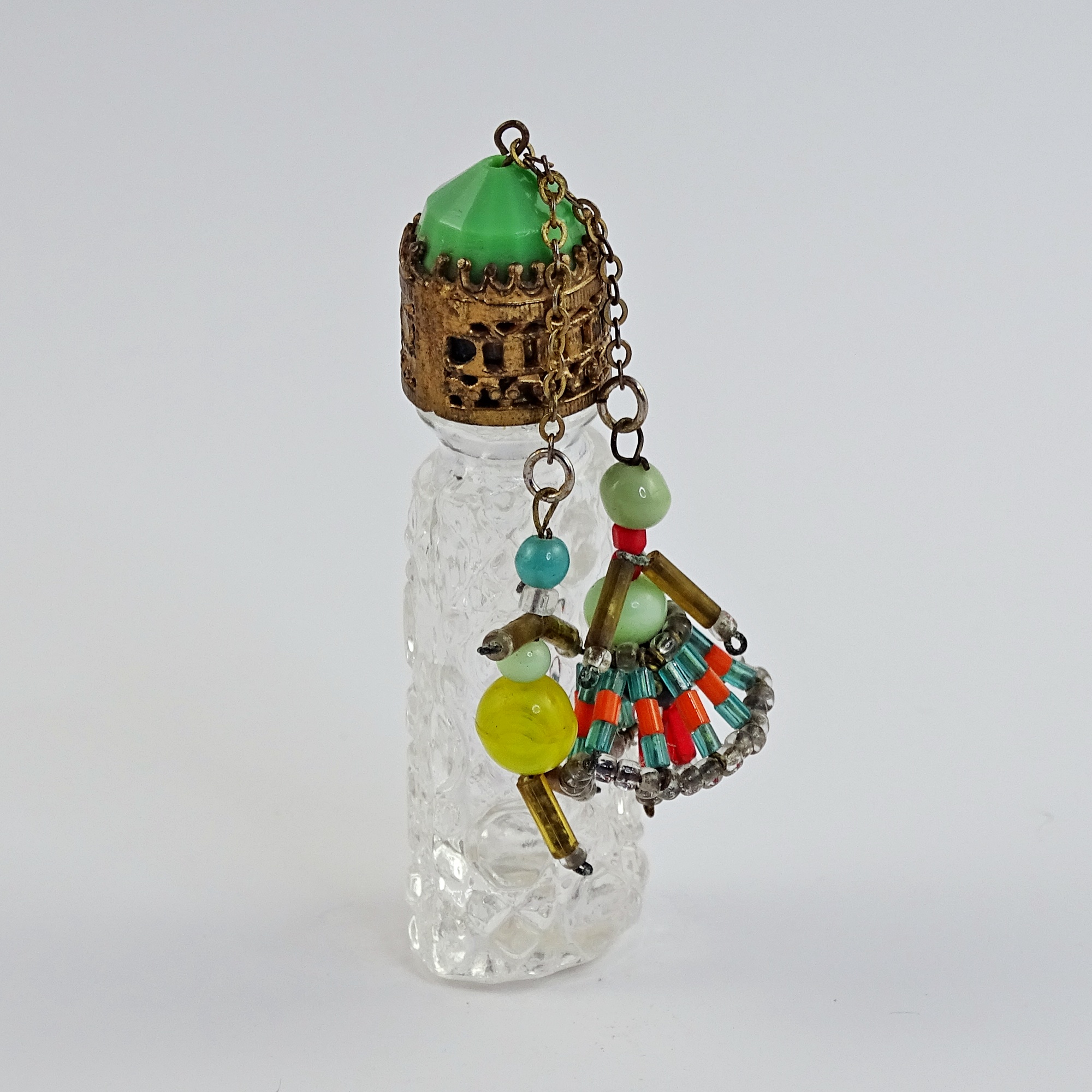 Glass scent bottle with filigree gilt metal top having girl and boy beads dangles.
