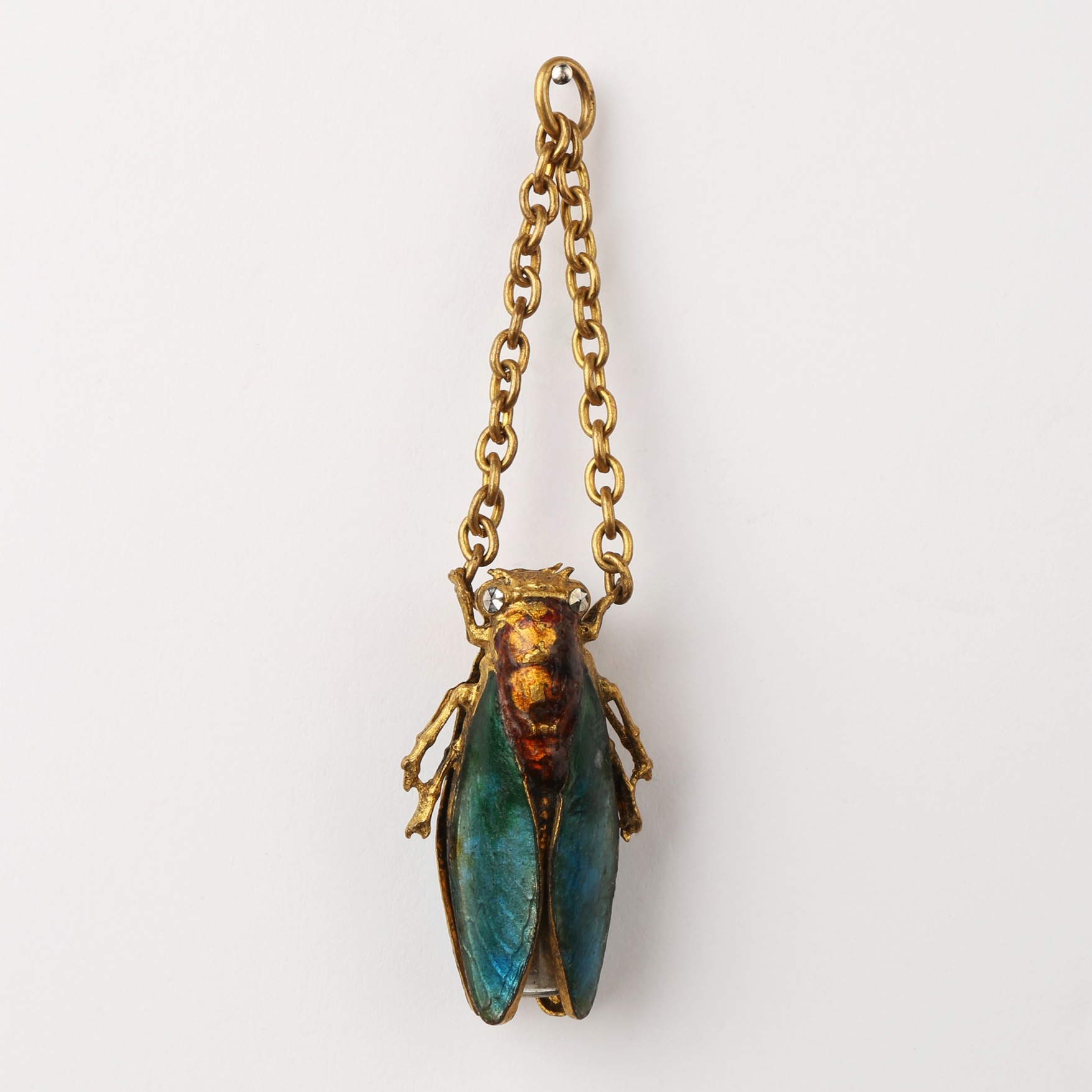 Glass vial with stopper enclosed in an enamelled metal double cage shaped as a cicada with two faceted rhinestones as eyes. Two perfectly symmethrical legs projecti laterallyon. Gilt chain with tiny ring.