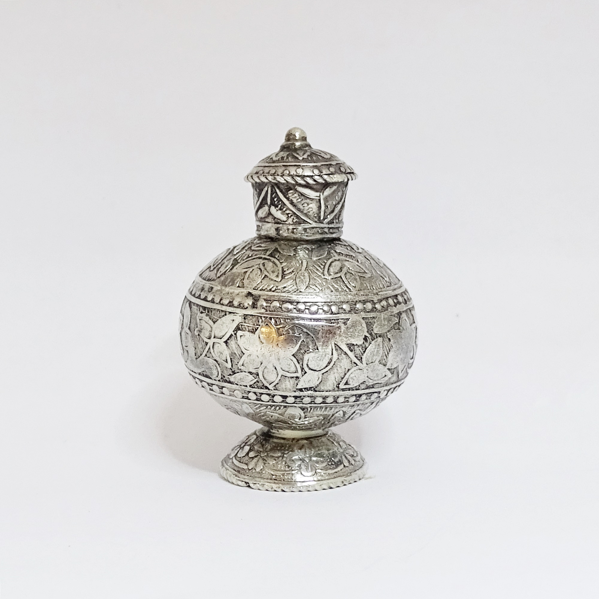 Home » Collection » Globular silver scent bottle richly embossed with horizontal bands decor