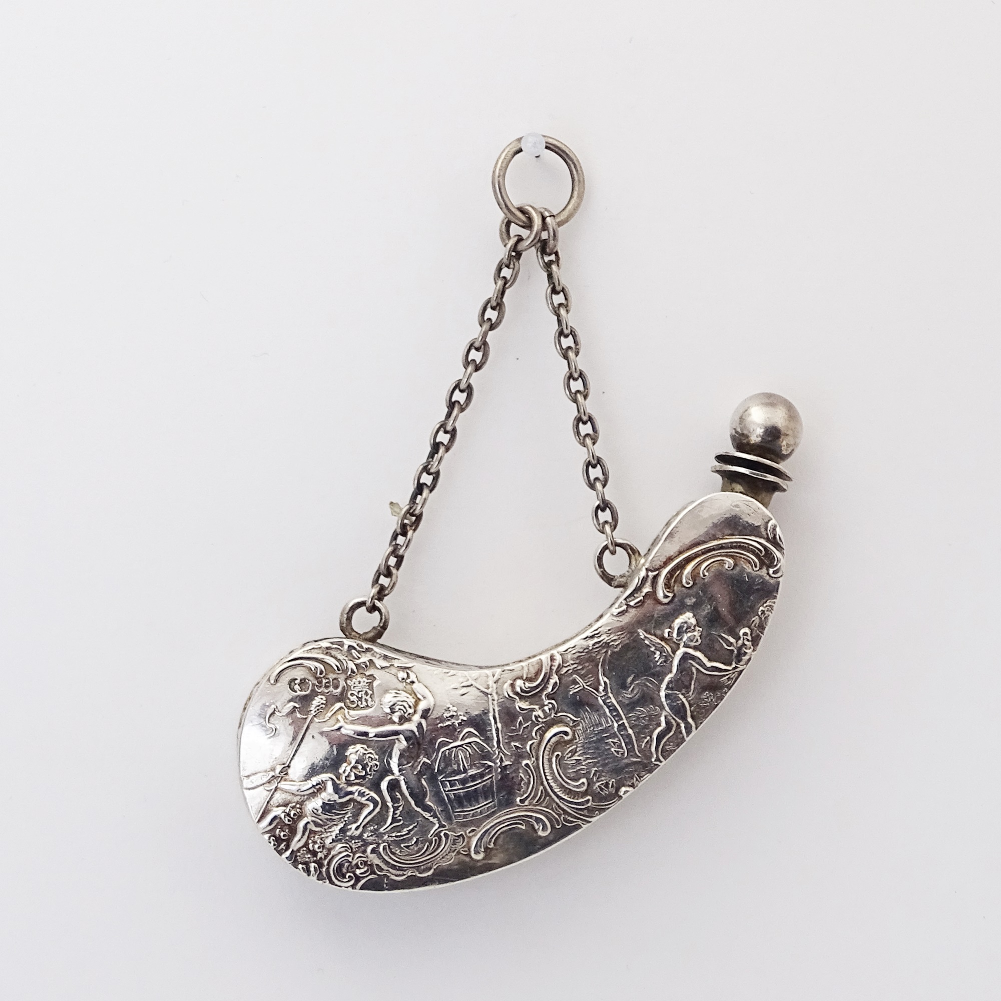 Gun powder flask-shaped scent bottle in embossed Hinault silver with scenes of cherubs playing in a garden on both sides. Screw round cap. Fully hallmarked for Germany, 930 silver, maker SR under a crown for Simon Rosenau, silversmith.