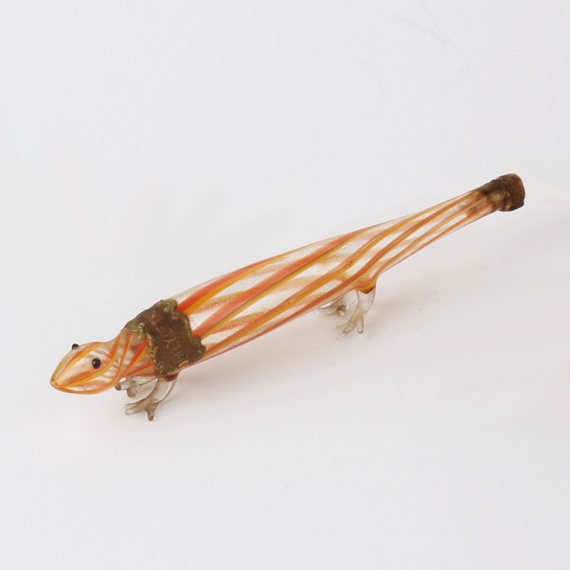 Hand-blown Nailsea glass scent bottle in the shape of a lizard. Beautiful colors: clear glass with orange/white and mustard swirls. It has four small legs with three claws each. The extremities have a little gold paint applied, as well as painted eyes. The tail is the opening, with a little cork. It comes with a small gold paper label that says “Mughetto” (Lily of the Valley).