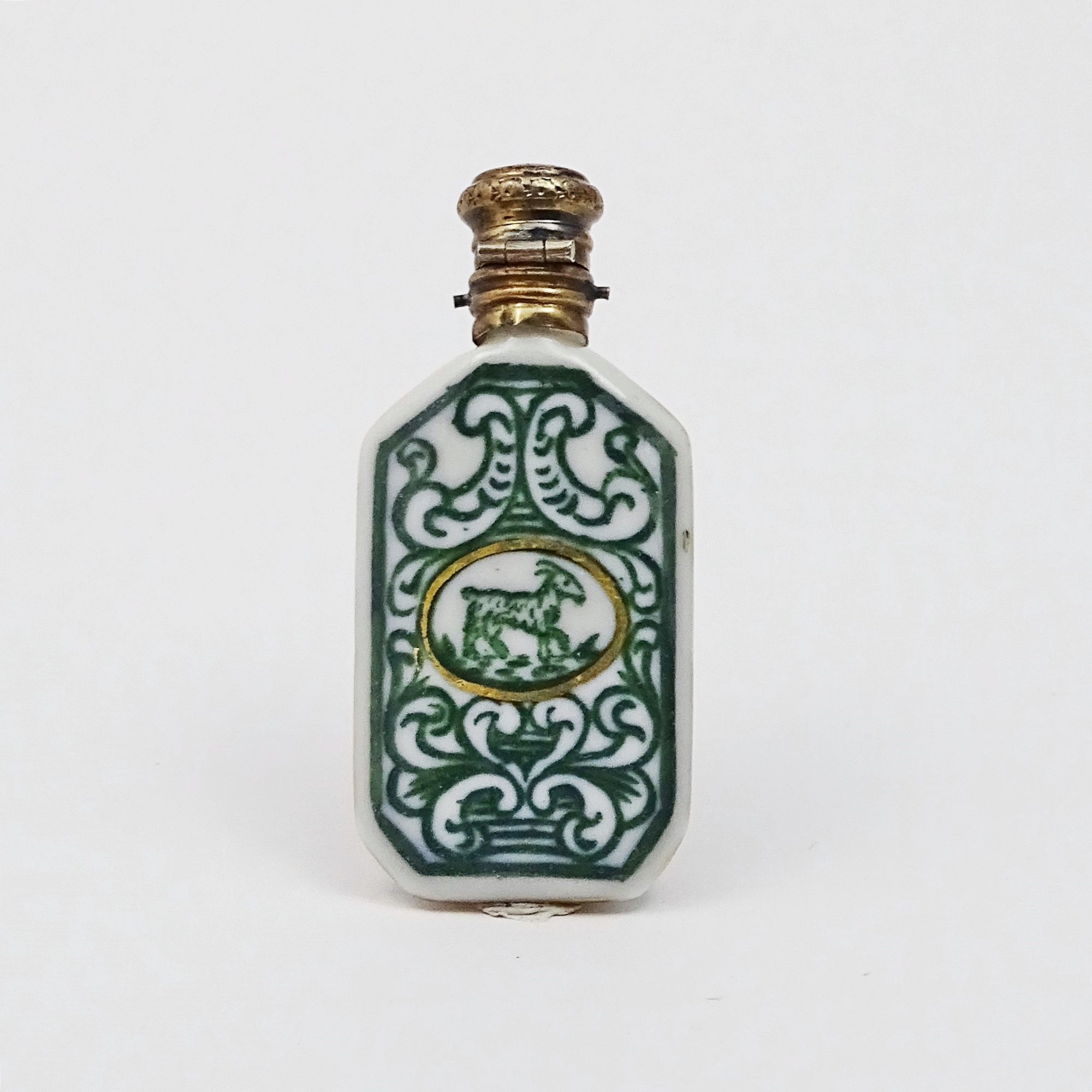 Hand-painted porcelain scent bottle shaped like a flatened rectangular with rounded corners. On the front a golden rimmed oval medallion with a branch and two pears. The back shows a capricorn, perhaps the zodiac sign. Both the medallions are surrounded by a formal decoration in green. Hinged vermeil cap with French marks for silver.