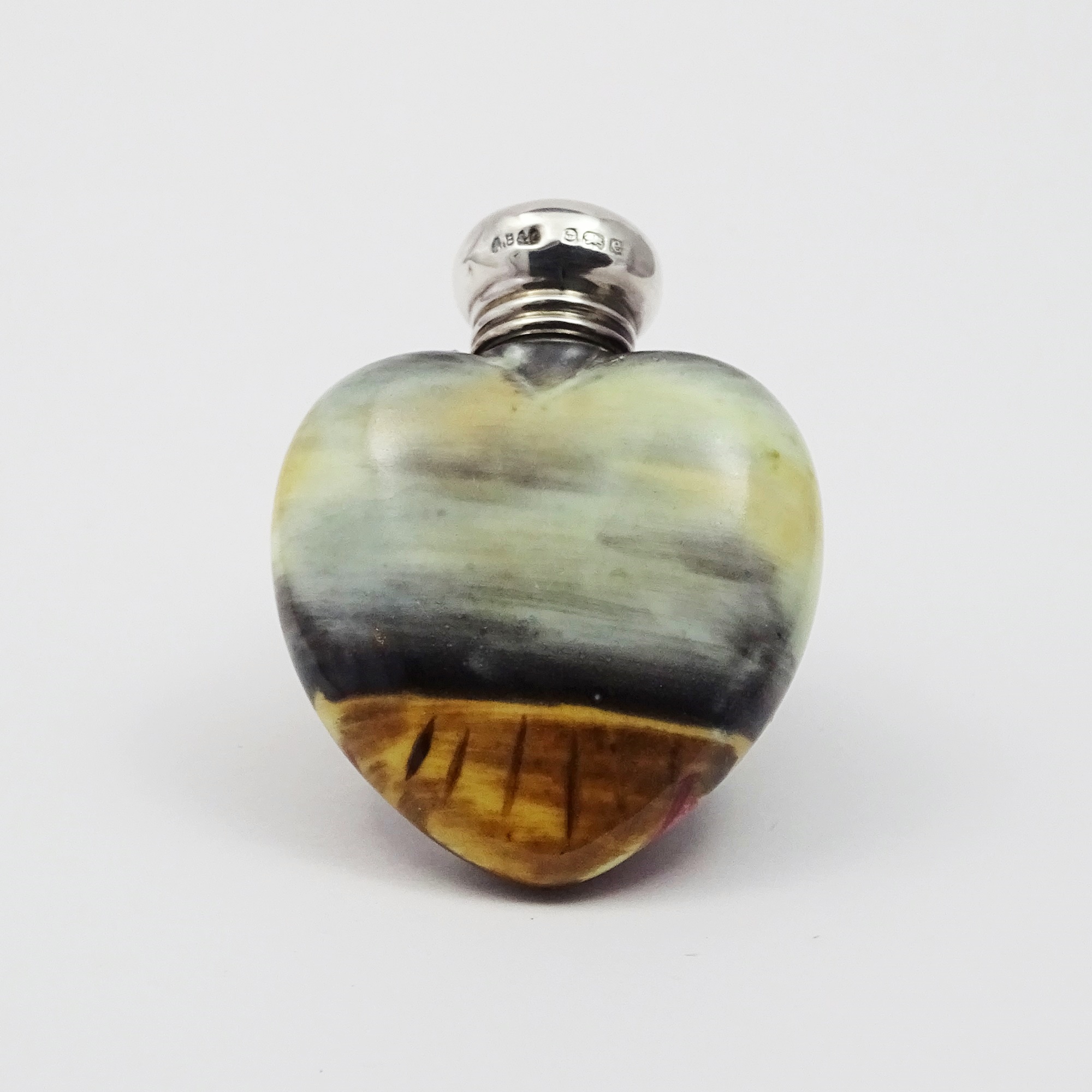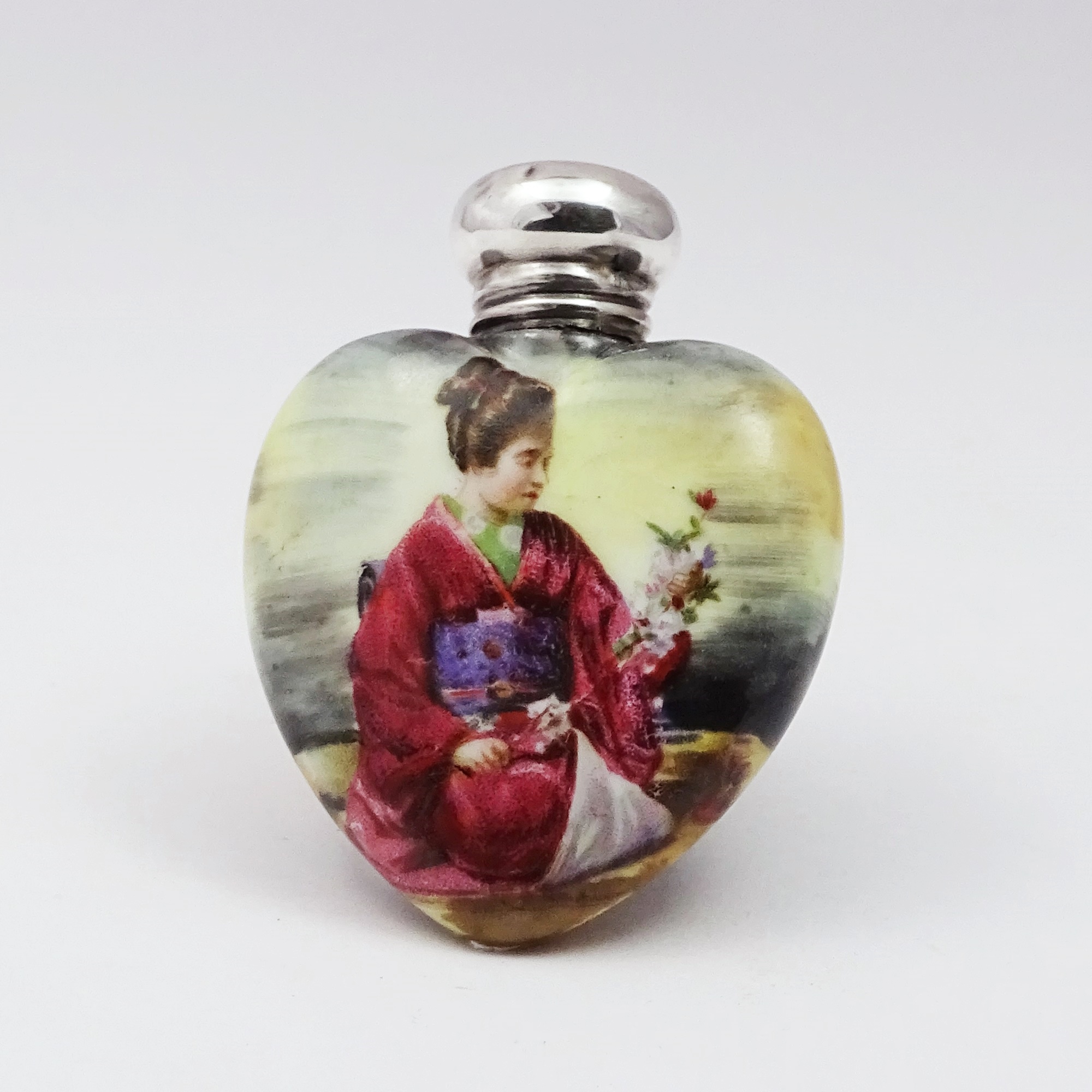 Heart-shaped porcelain scent bottle decorated with a hand embellished transfer print of a japanese woman wearing a “Kimono”. The scene continues on the reverse. Silver screw cap hallmarked for Birmingham, 1907, AB&C for A. Bromet, silversmith.