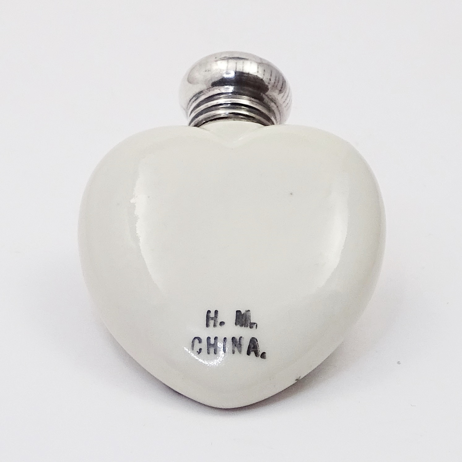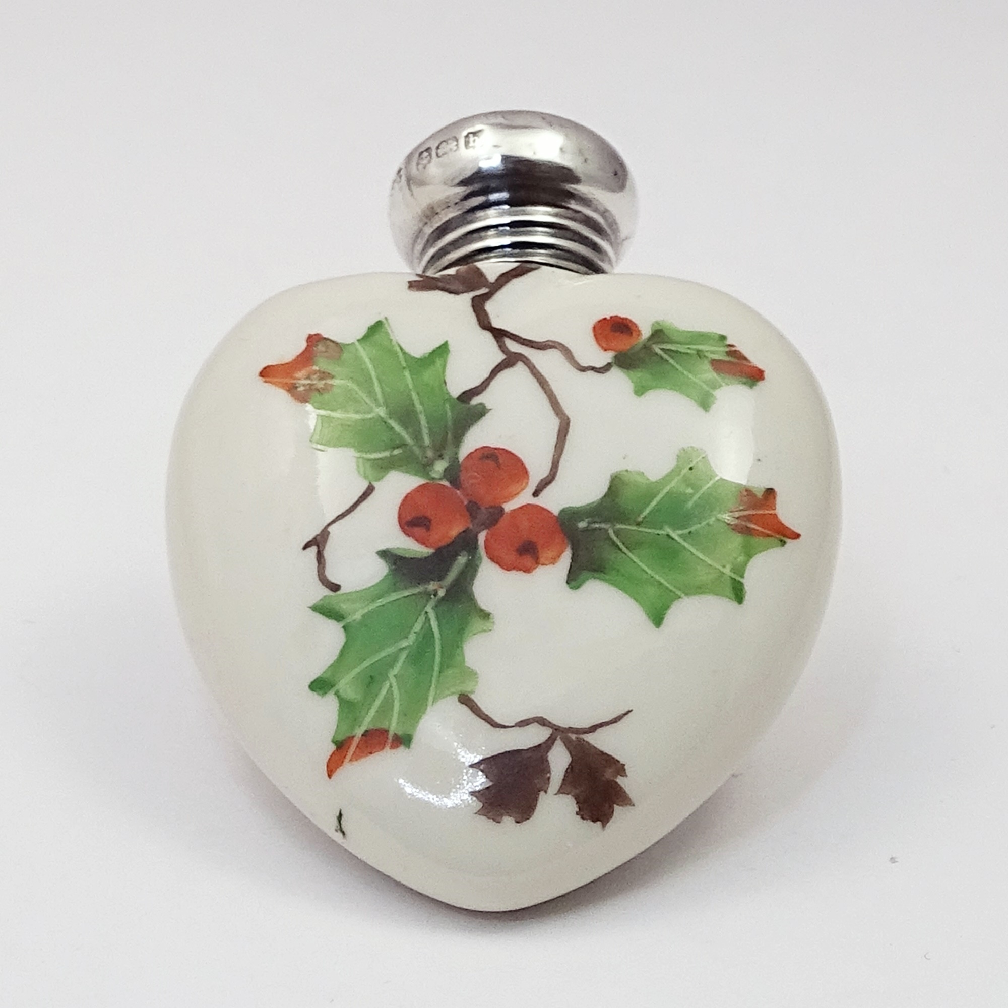 Heart-shaped porcelain scent bottle showing a hand-painted branch of holly. On the back the word “H.M.CHINA.”. Silver screw cap full hallmarked for Birmingham, 1907, AB &C for Albert Baker & Co. silversmith.