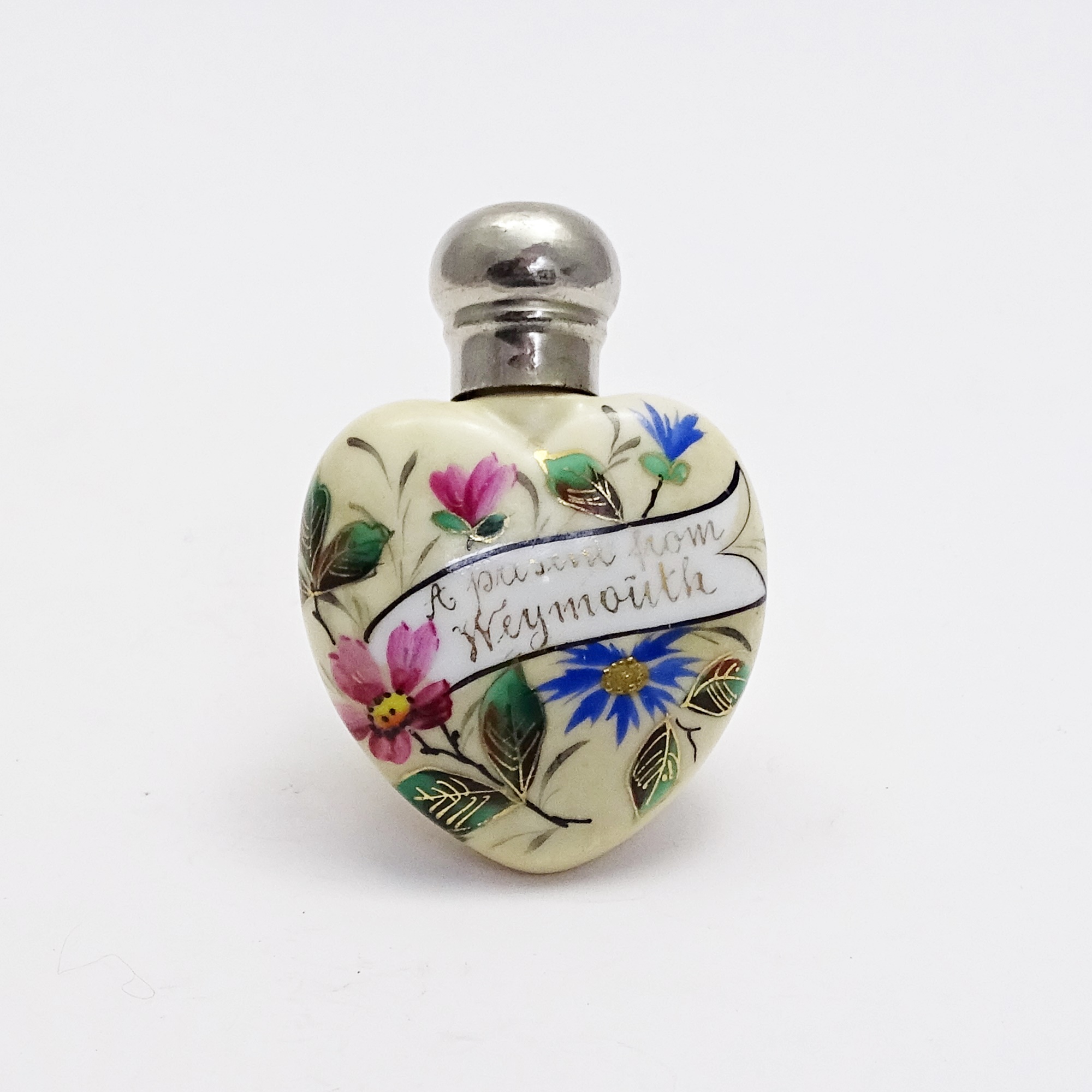 Heart-shaped scent bottle for “not so rich” in hand-painted porcelain with flowers and a scroll bearing the words: “A present from Weymouth”. Round screw metal cap.