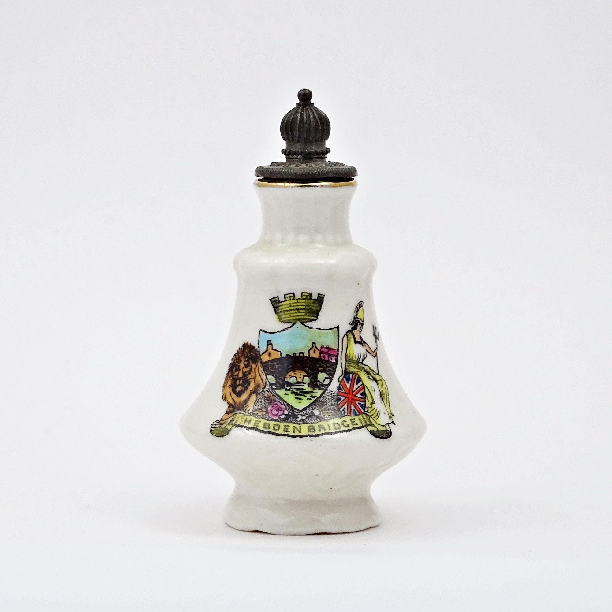 Crested porcelain scent bottle of the town of Hebden Bridge (Yorkshire), marked “Florentine china”. Crown metal cap with cork.