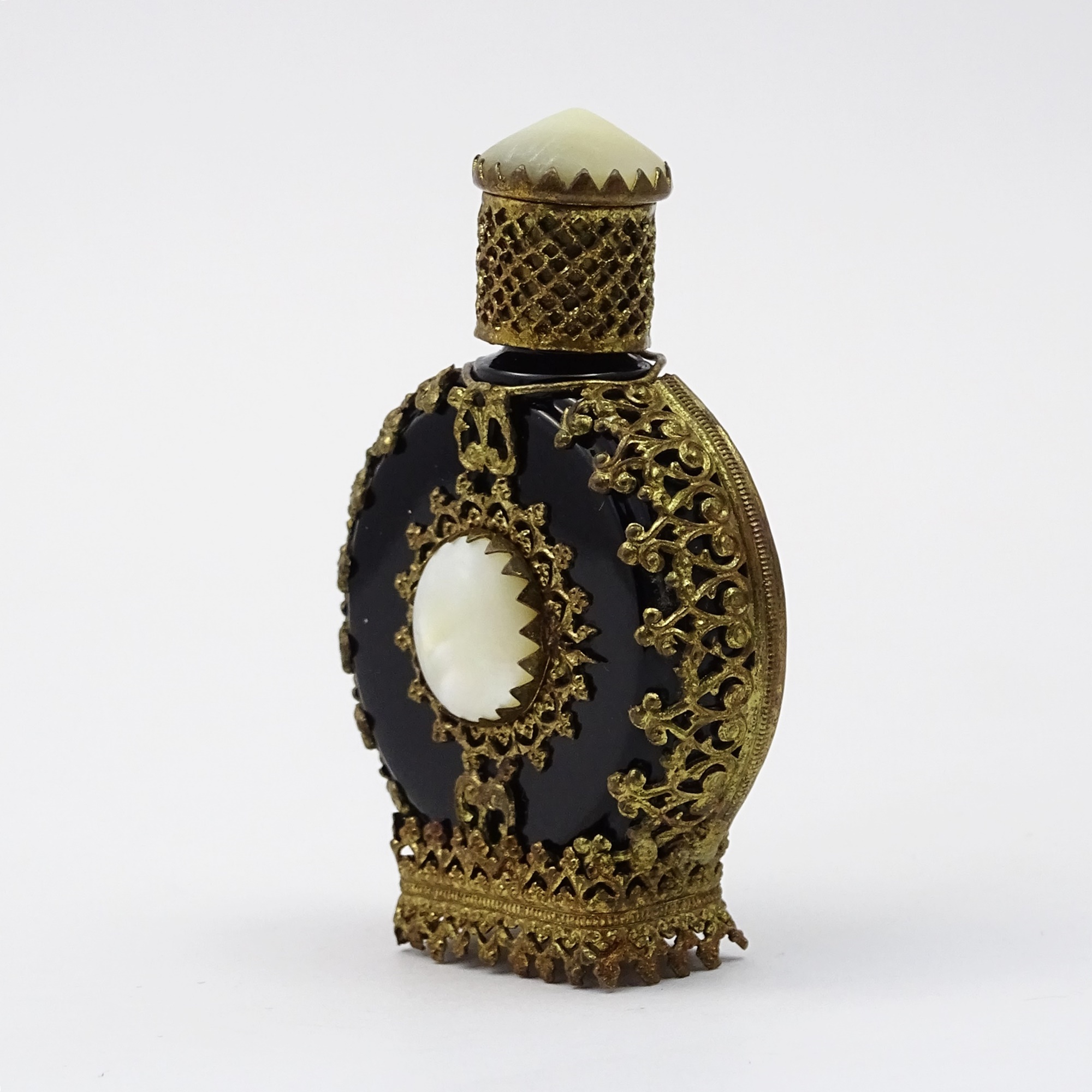 Jeweled black glass bottle with brass filigree shoulders, foot and a round central frame for a mother of pearl tip. Ornated brass cap with matching stoneand glass wand.