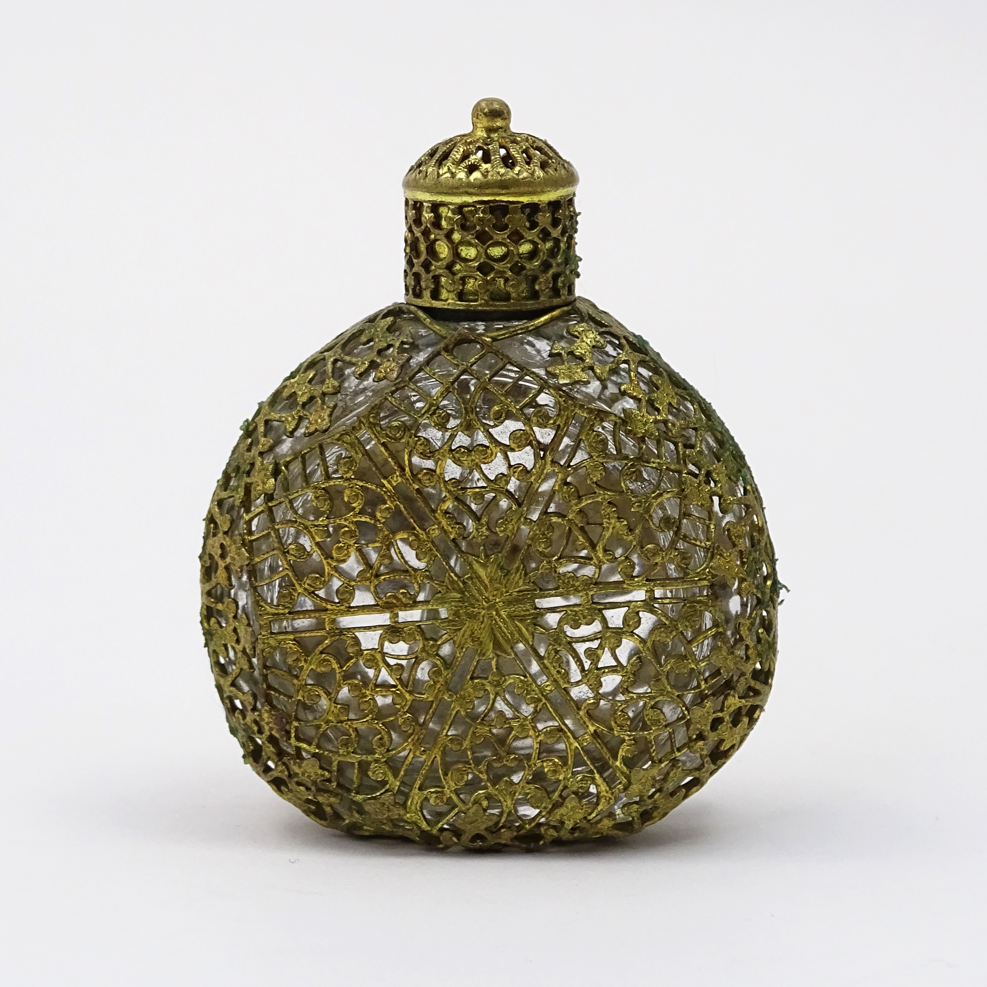 Jeweled glass bottle encased in a brass filigree cage with red pearls and a white enamel flower.