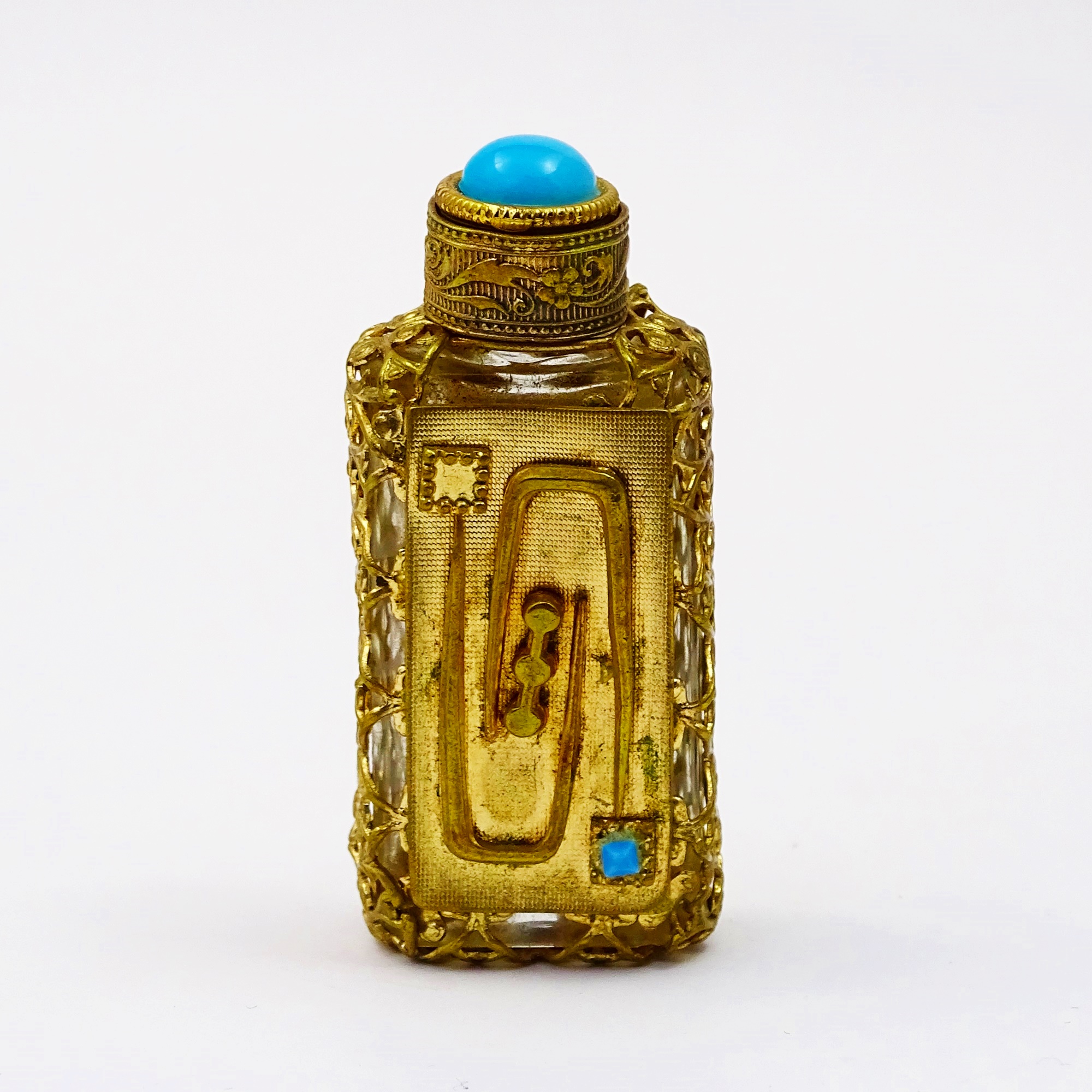 Jeweled clear glass scent bottle encased in a brass filigree cage. On the front a rectangolar plaque with a geometric decor and a little turquoise, Screw cap with wand surmounted by a turquoise cabochon.