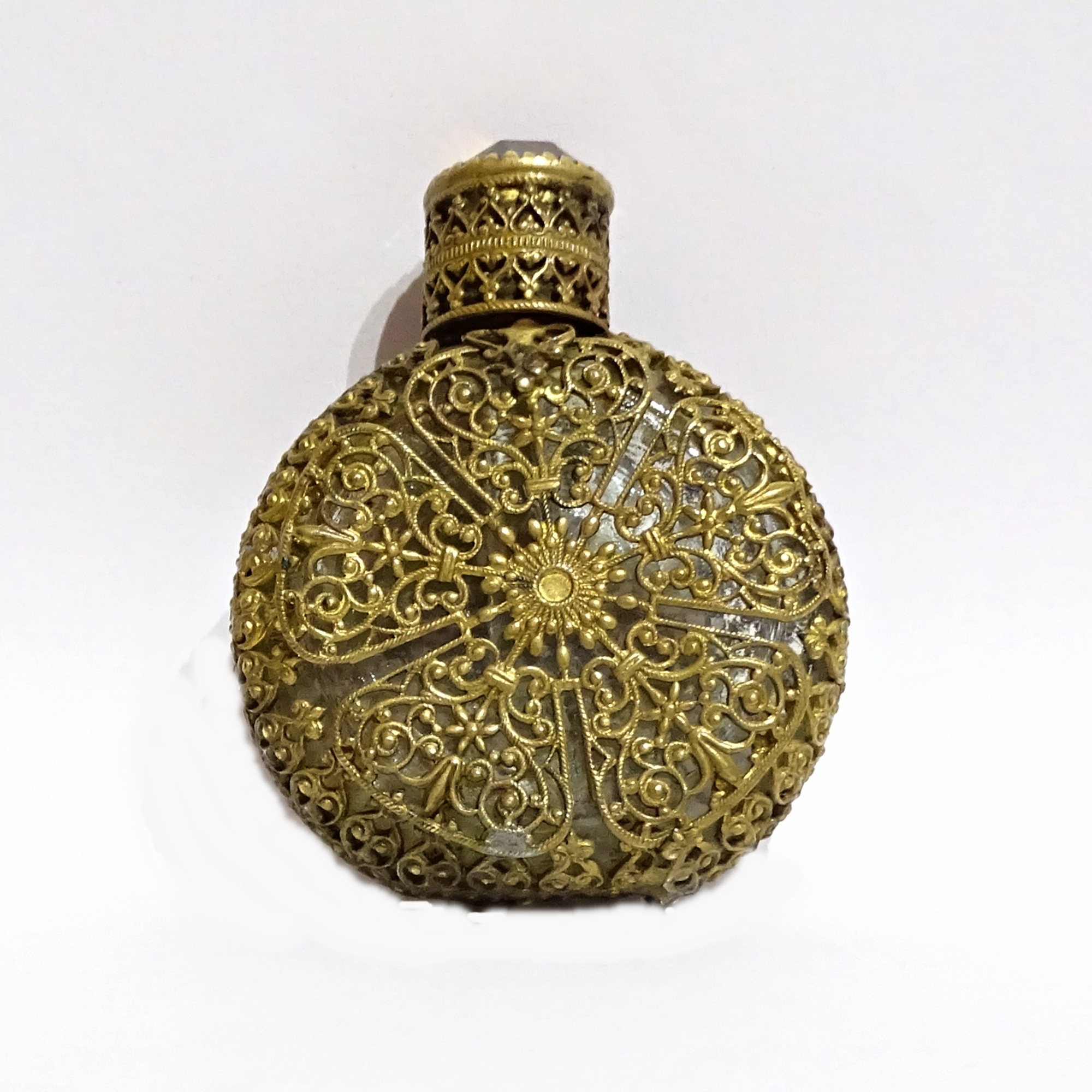 Jewelled clear glass bottle encased in a brass filigree cage. Front decor with yellow stones and white enamels and a big yellow stoneglass. Brass mounted and matching filigree screw cap with yellow stone and glass wand.
