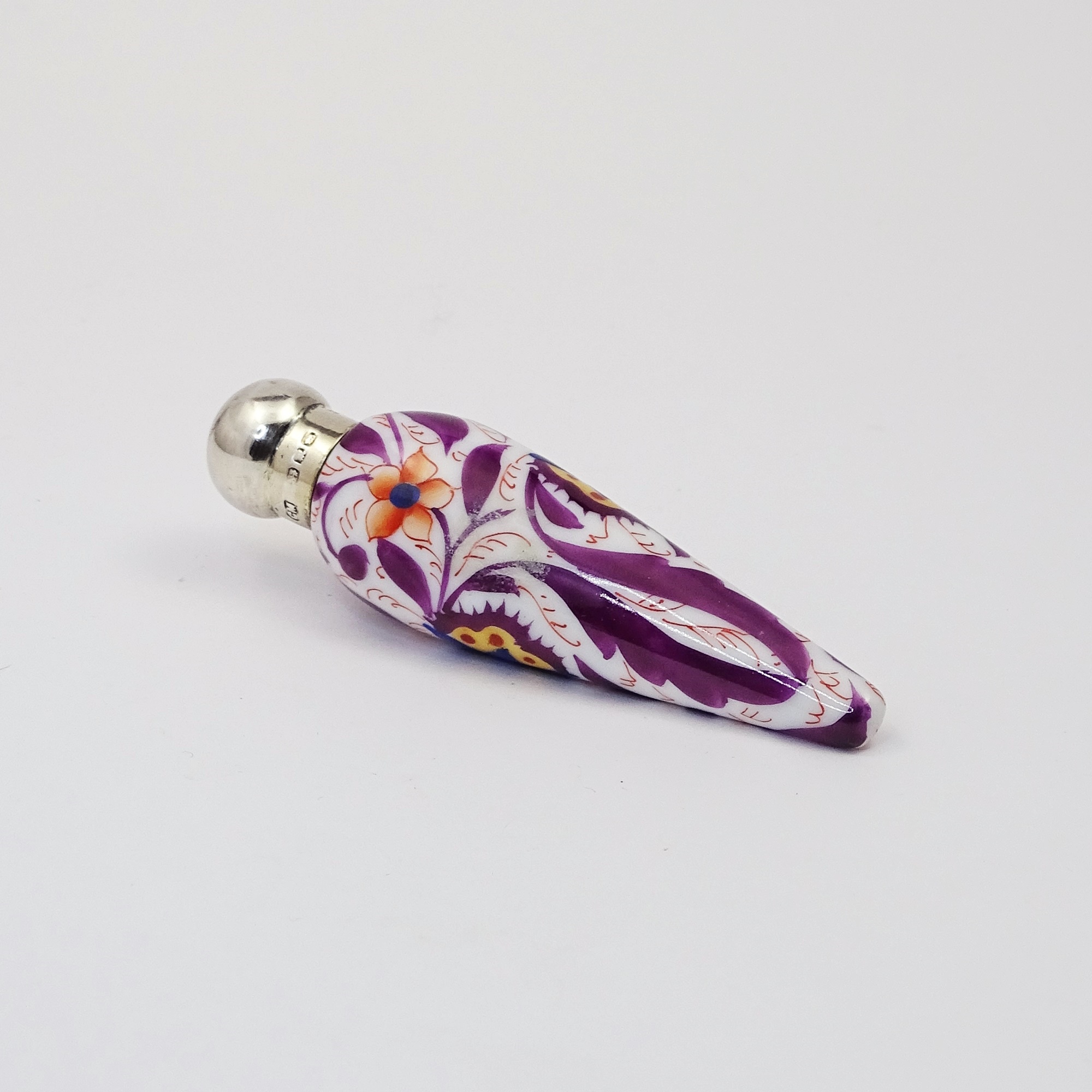 Long conical scent bottle in Imari style porcelain. Silver cap, full hallmarked Birmingham, 1886, Charles May silversmith.