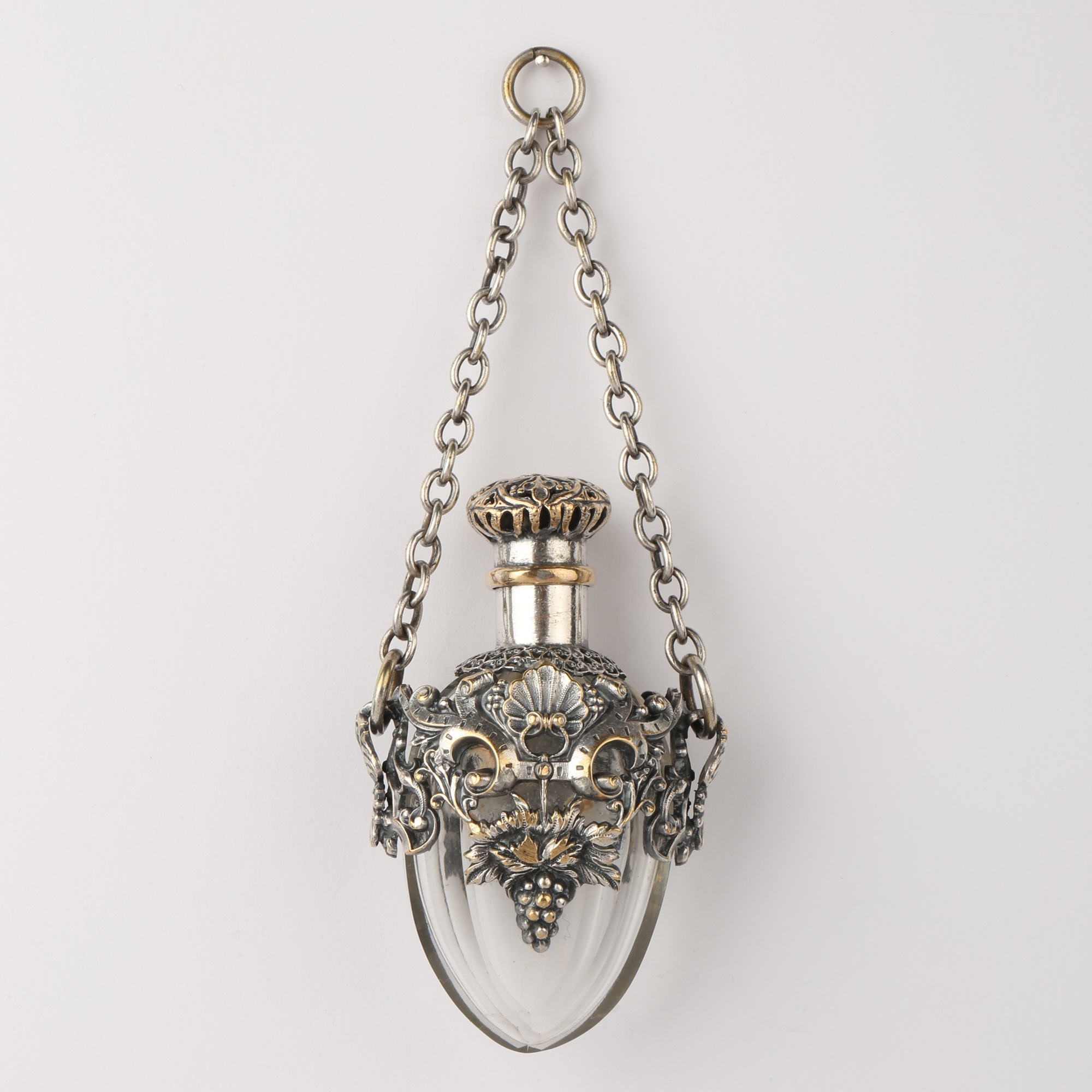 Louis Philippe Chatelaine scent bottle in glass and silver.