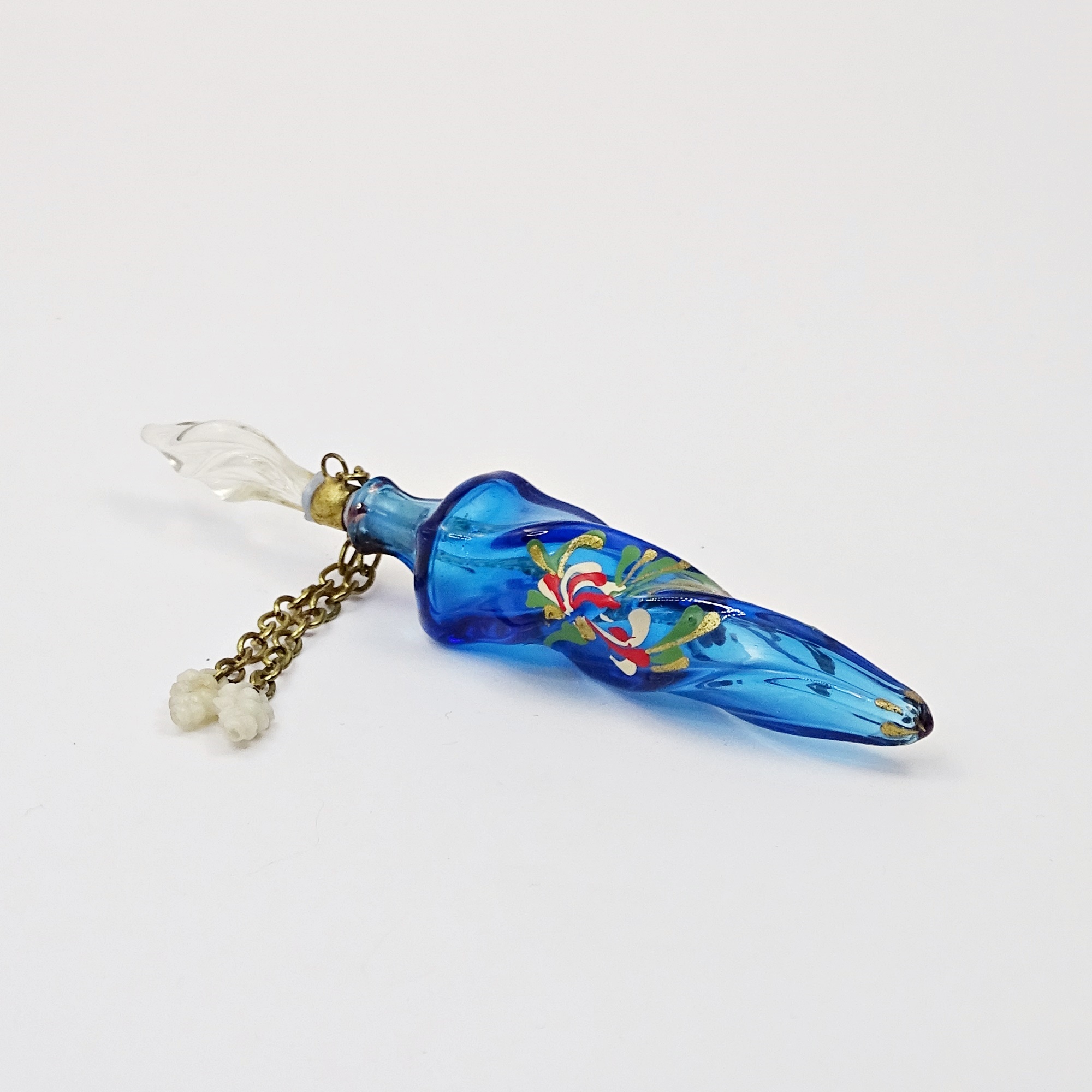 Blue twisted glass scent bottle hand-painted with a floral decor. Clear glass stopper finished by a little ring and two chains ending with white plastic tiny grapes pendants.