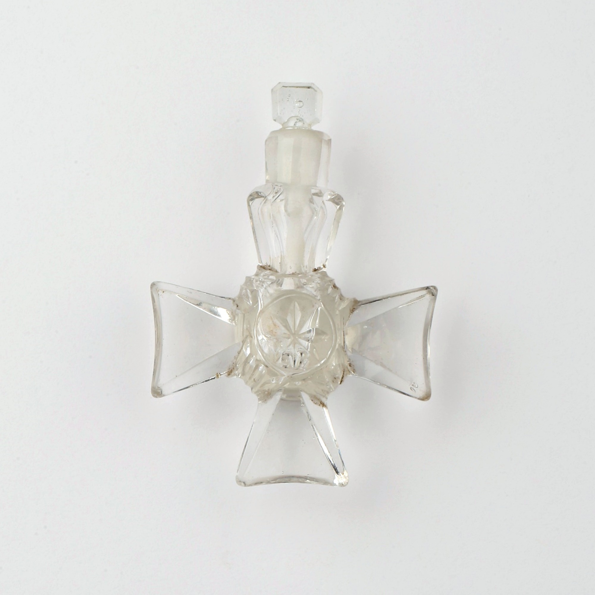 Malta cross-shaped scent bottle in cut clear glass, with matching stopper.