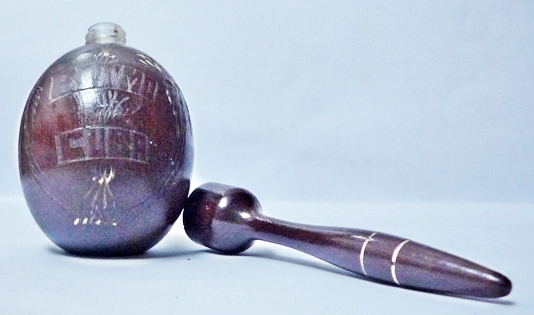 Glass egg-shaped scent bottle covered with wood engraved with tropical motives and the words “RITMO” and “CUBA”, originally painted in white. The screw plastic cap is fixed in a long wood handle forming a “maraca”.
