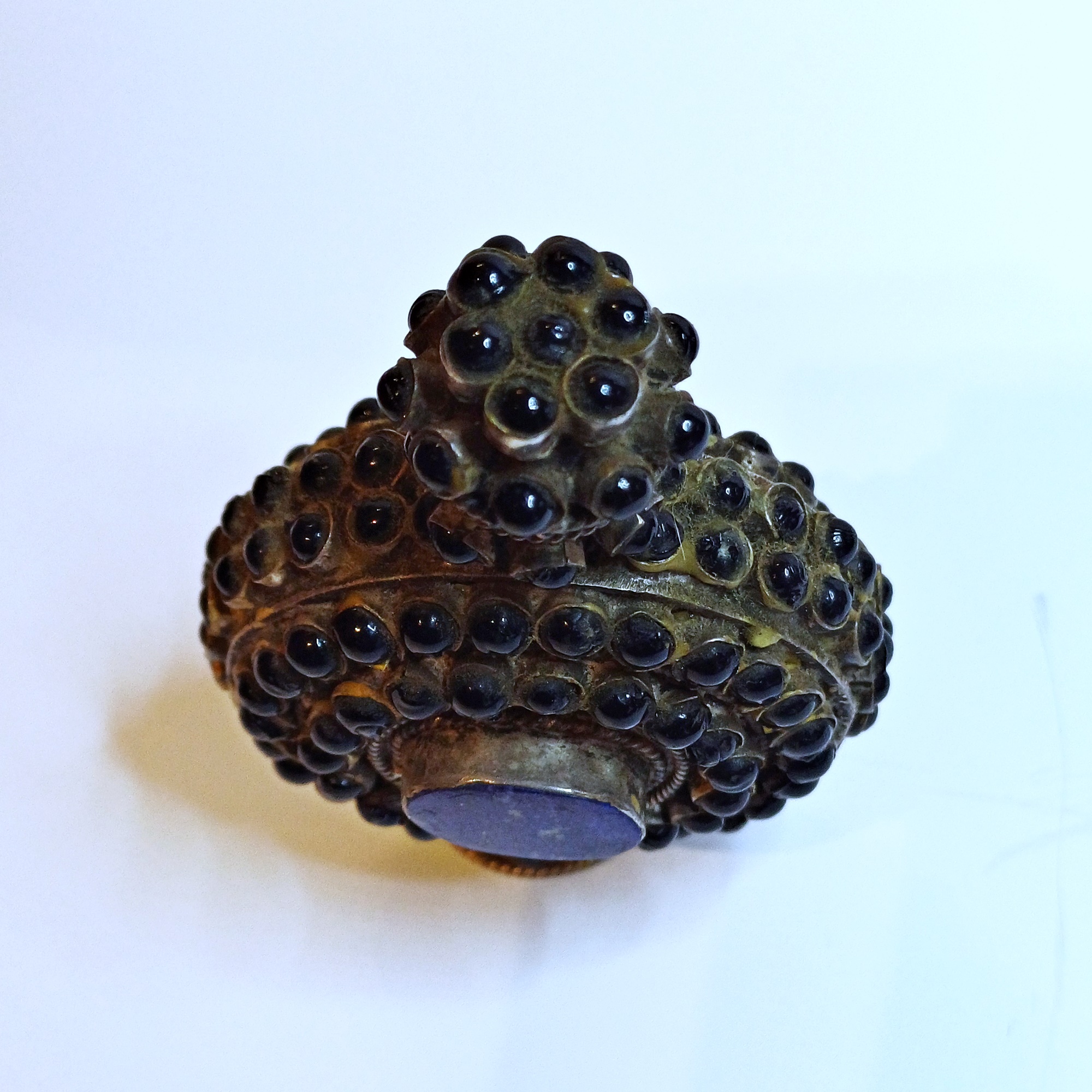 Metal round scent bottle on foot with a rich concentric decor of black pears and a flat lapislazul on both sides. Matching cap shaped as a crown.