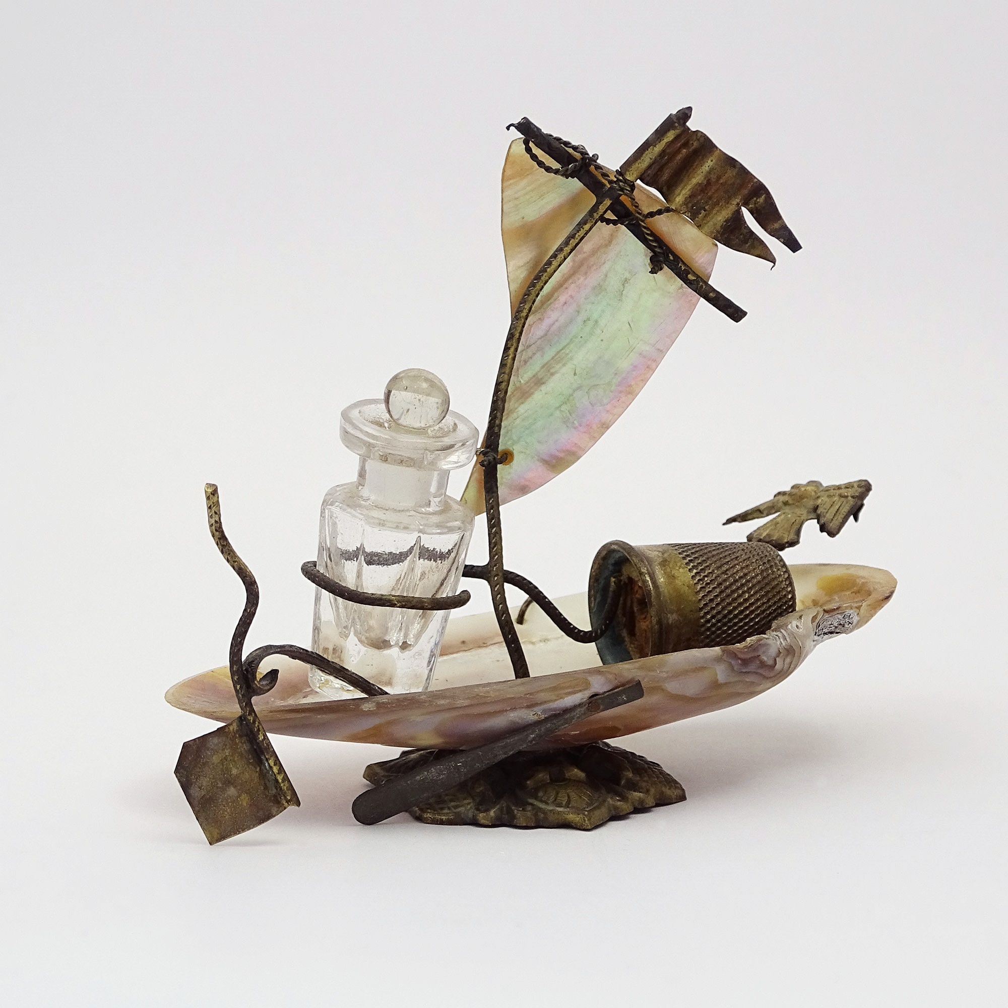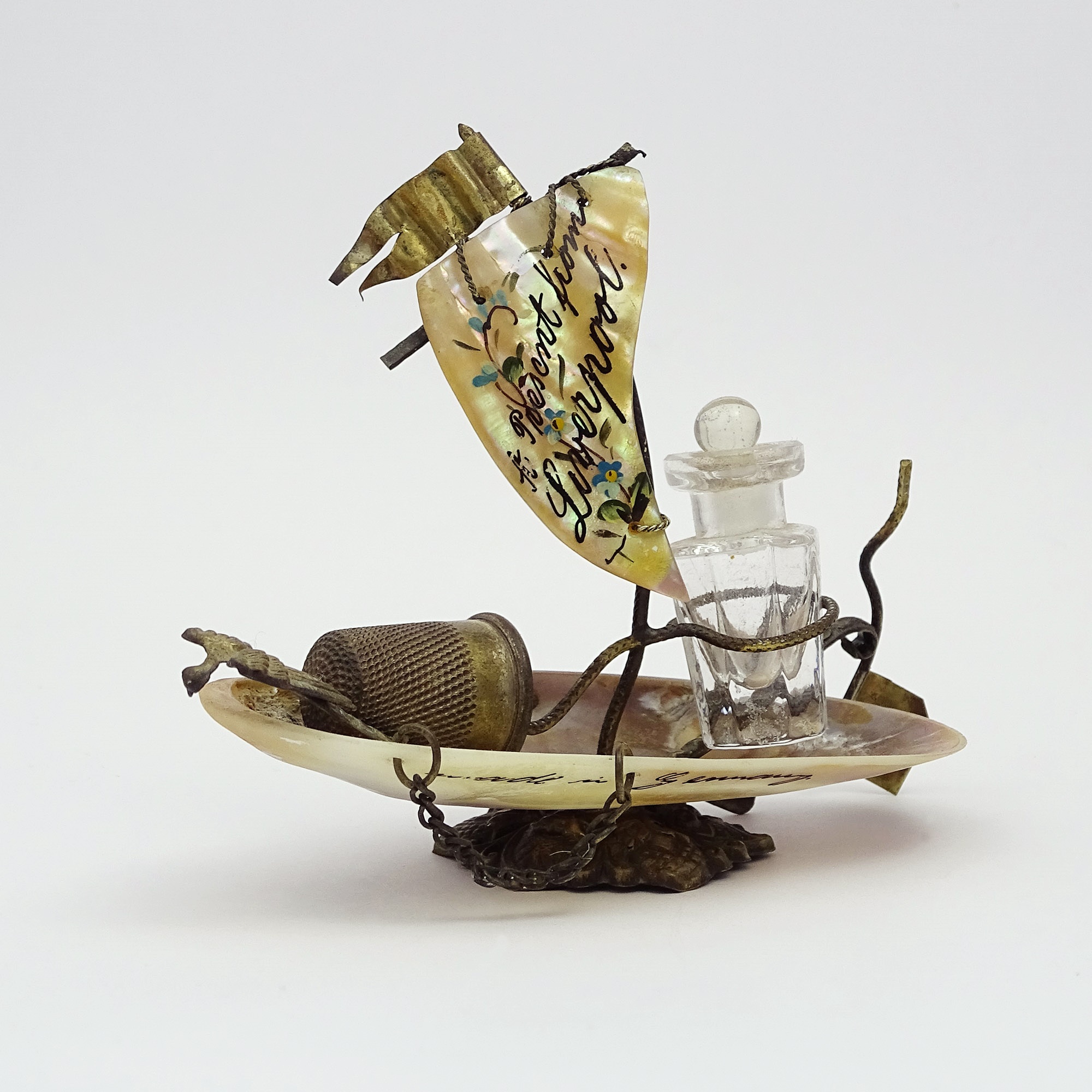 This little boat is a souvenir of Liverpool, as is printed on the mother of pearl sail, but the underside of the shell ‘hull’ reveals that it was made in Germany. It sits on a prettily embossed metal base. Near the bottom of the mast there is a curved metal prong onto which the thimble sits, and on the other side of this there is a circular metal loop into which the little glass scent bottle fits. The gilt metal rudder has an eagle finial and there is a jaunty metal flag flying from the top of the masthead. The clear glass scent bottle has 8 sides and a frosted glass stopper.