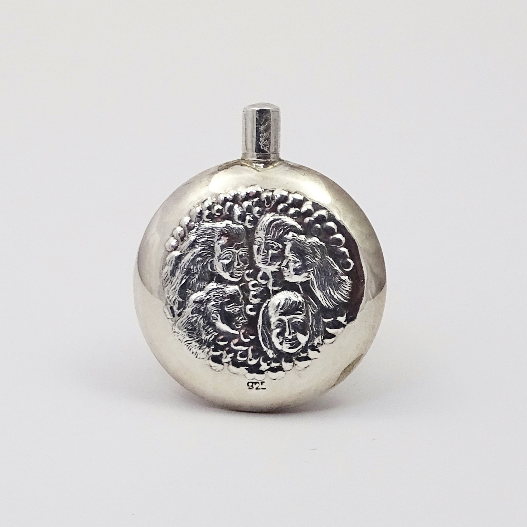 Moulded silver scent bottle with five women faces that I believe represents the “Little Women” described by L. M. Alcott: Joe, Meg, Beth, Amy and their Mother: actually they recall the iconography of the characters. Screw cap hallmarks for London, 1991, DF (or DP).