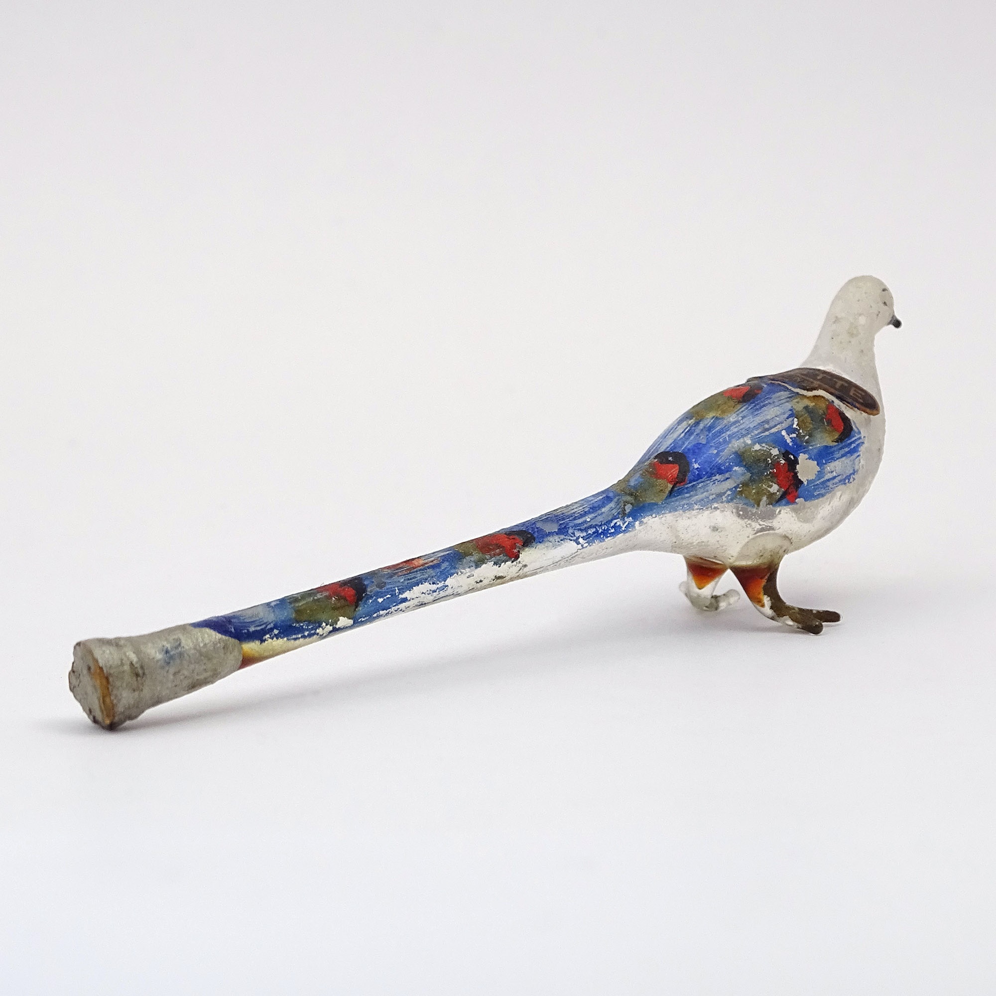 Naif hand-painted glass scent bottle in a shape of a bird, possibly a peacock.