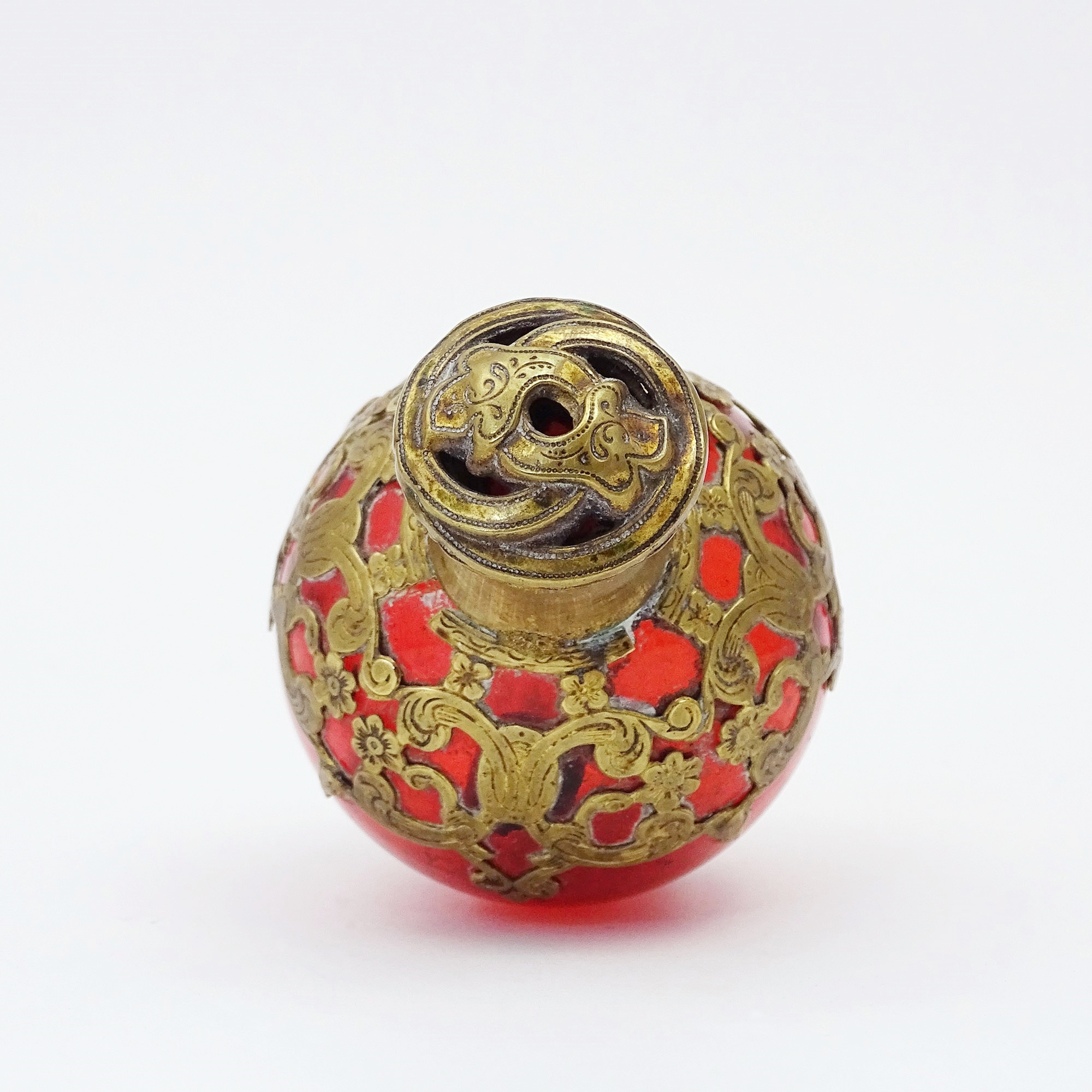 Orange glass vinaigrette with intricate ormolu mounts around the spherical body. Hinged, decorated cap with a hole on the top.