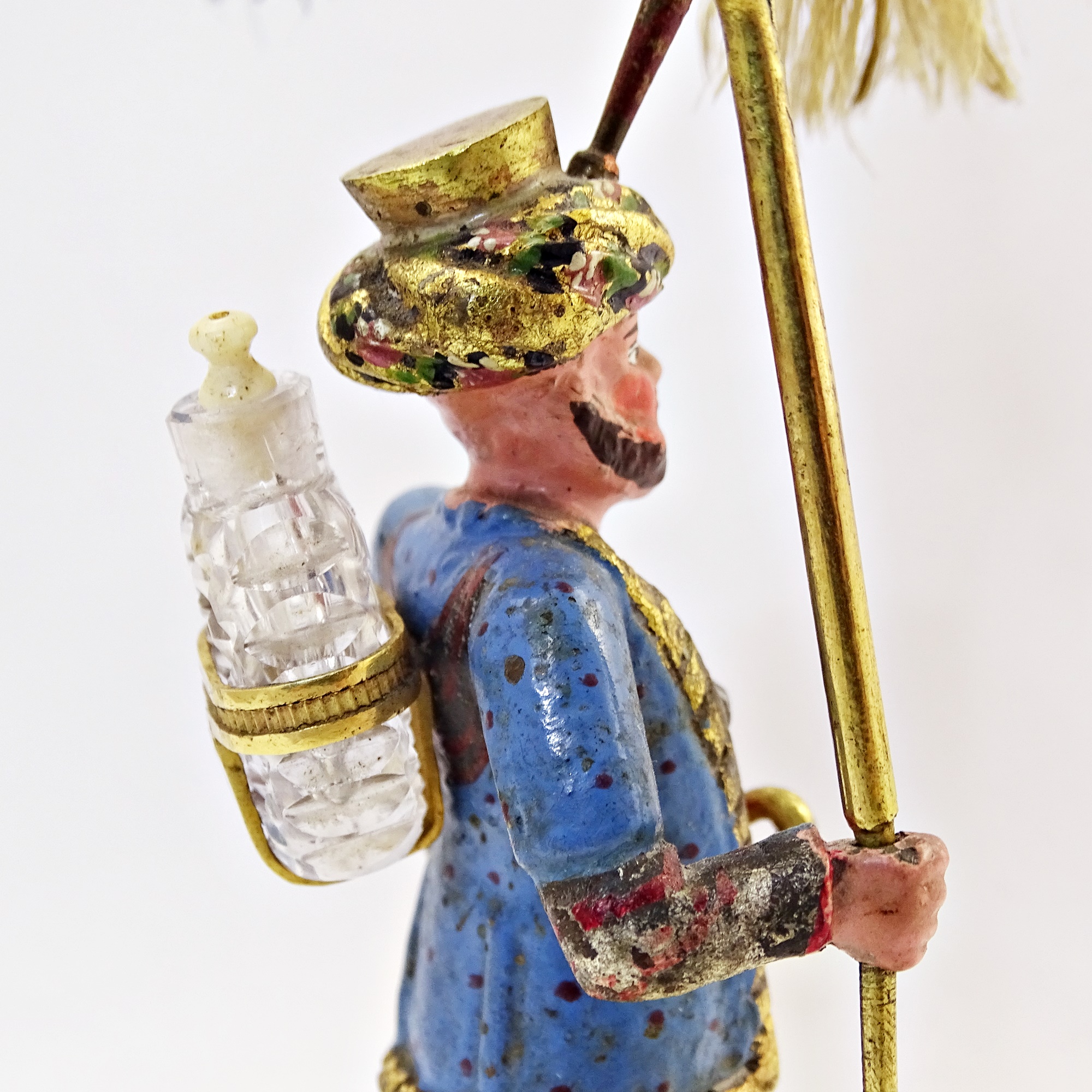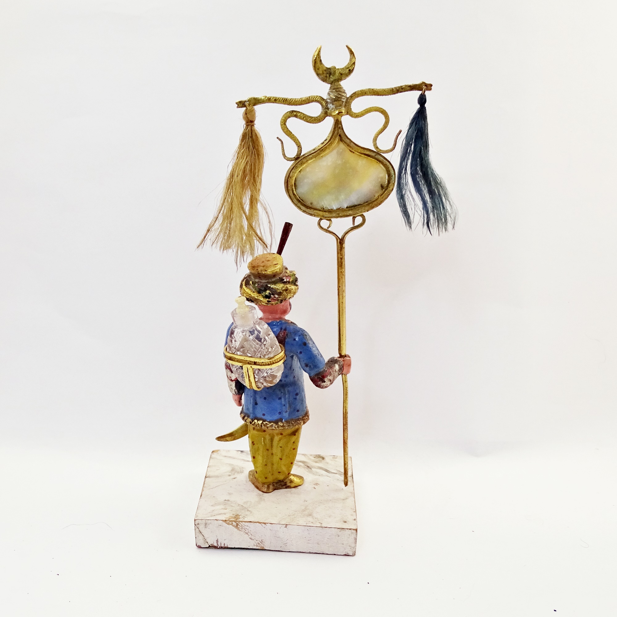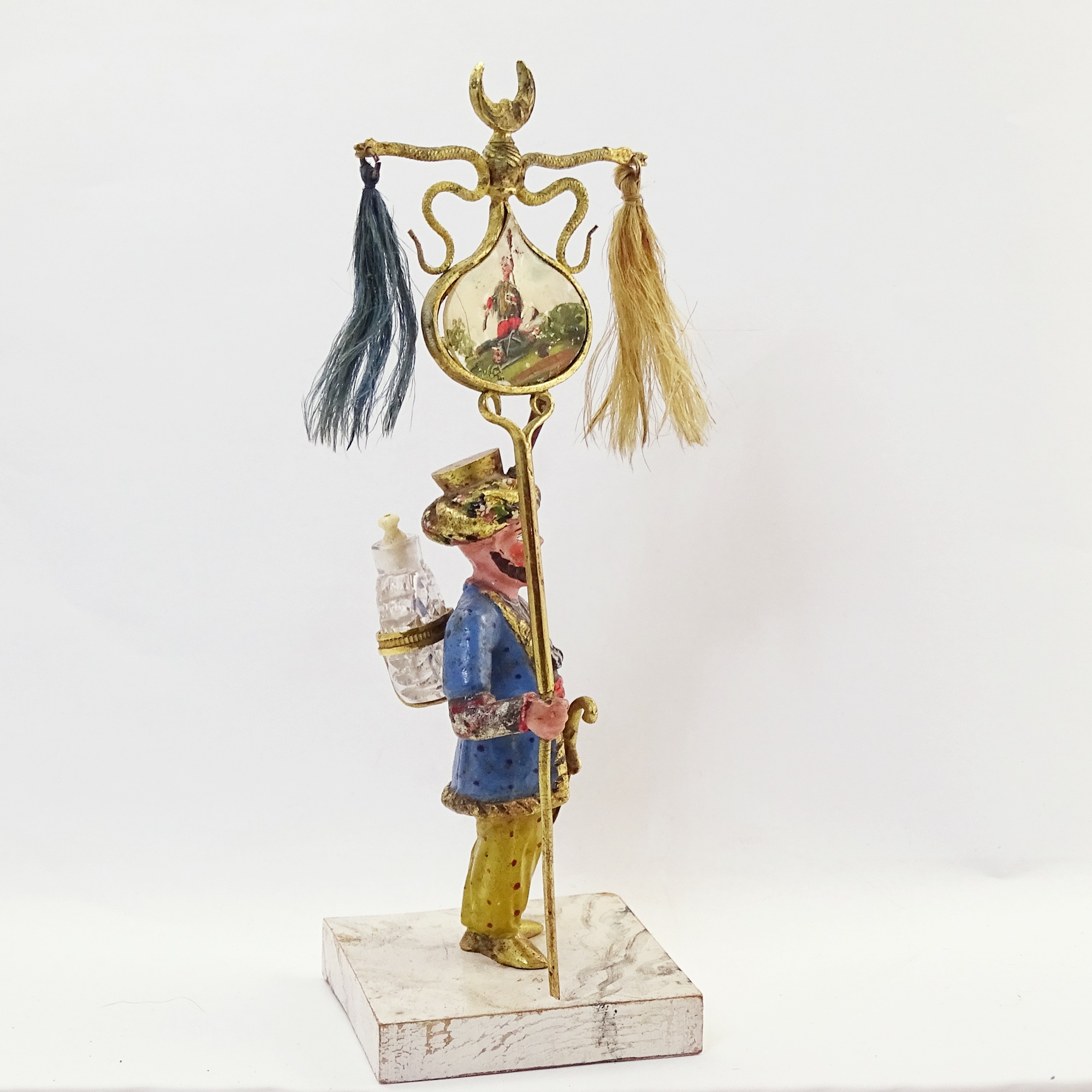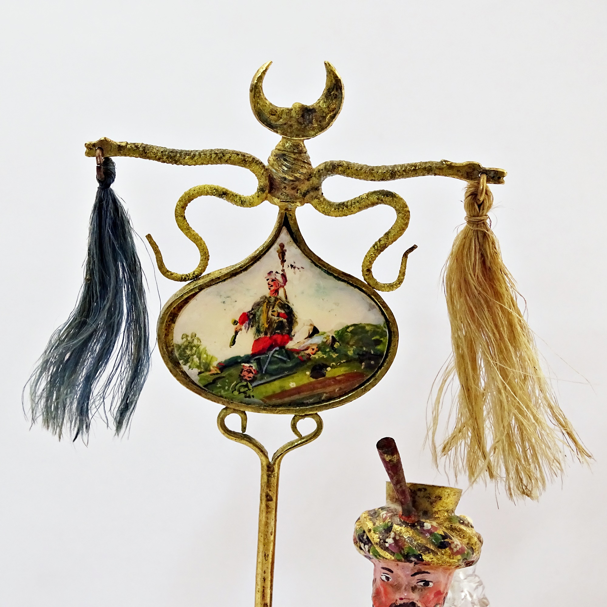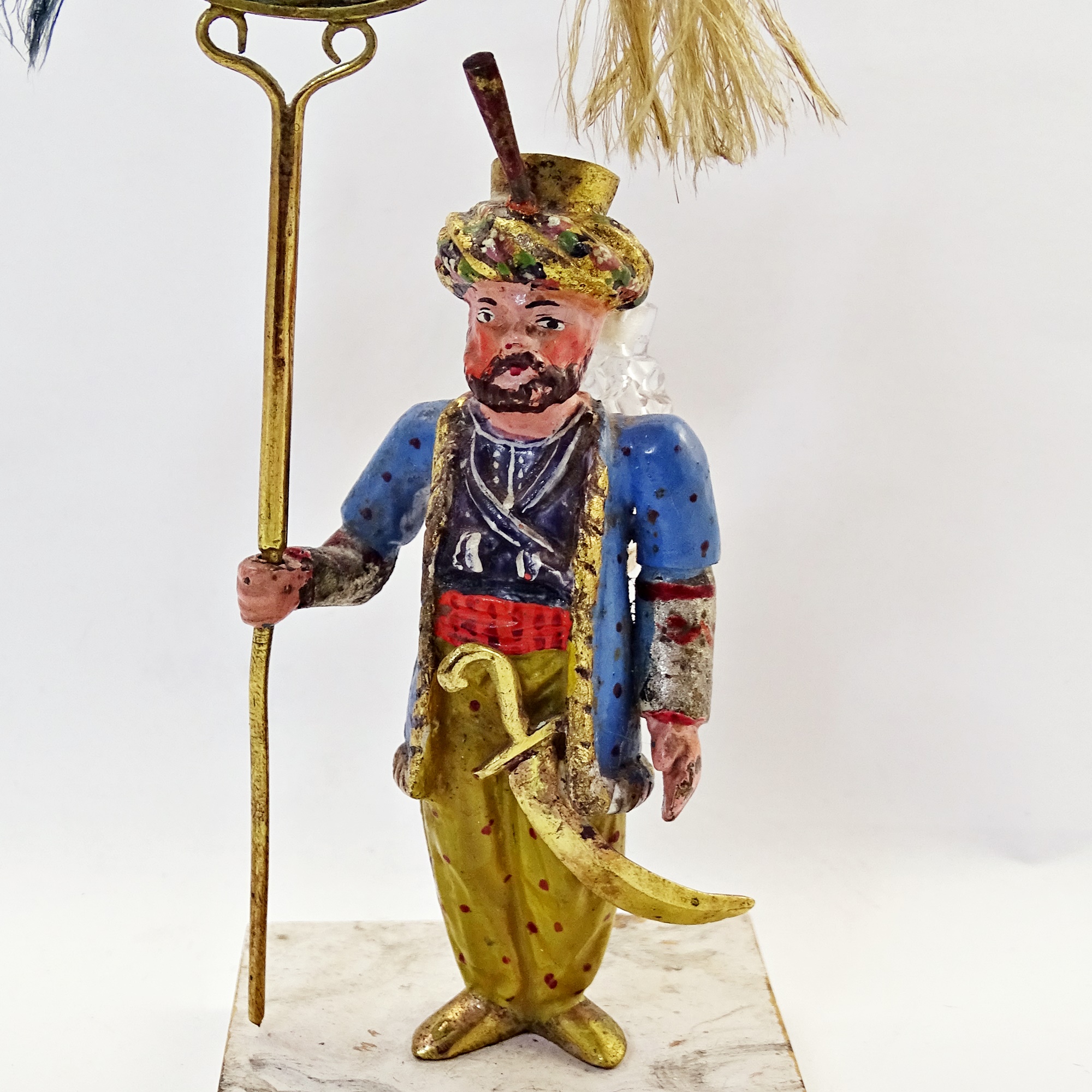 Lead soldier (quite heavy), hand-painted with colourfull details and costume, on a wood base, painted to look like marble. Instead of the backpack he carries on his shoulders a small scent bottle in cut crystal with an ivory cap: the support of the bottle is made with thin gold bands. The labarum is painted on a mother of pearl medallion and it shows a dead soldier, in European uniform, killed by the Ottoman soldier. The soldier certainly represents an Ottoman high officer. The costume is typical of a Balcanic powerful man, with wide trousers, a sash and a turban, and the fur-lined jacket suggests a high rank, as does the golden scimitar. The silver elements that emerge from the sash, painted and in relief, represent the handles of yatagan-type daggers, a typical element of Balkan military costume, in fact most of the members of the Ottoman army were originally from the Sultan’s European possessions. That sort of labarum held in the hand by the figurine represents a çevgen or “Turkish crescent”, an object that was at the same time the symbol of a military unit, similar to Western standards, and a musical instrument similar to a sistrum. The instrument is decorated on the sides with two tugs, horsehair tails, which represented the prestige of the military unit and the authority that the Sultan had invested his commander with (a remnant of the era when the Turks were mounted warriors in the Asian steppes). In the miniature painted on the çevgen, you can always recognize a Turkish warrior (the “pole” behind him is always a tug, with the horsetail gathered for battle) and a European soldier fallen to the ground. It could certainly be a Russian soldier, given the green uniform with red lapels, but it could also be an Austrian cavalryman. The sword in particular and the hint of black knee-high boots would lean towards cavalry, and the black object on the bottom right could be an Austrian leather helmet, which began to replace the tricorne hat in the mid-18th century. However, the white baldric should be only one, even if we are in an era in which the individual equipment of the soldier was far from being standardized. Both the Russian and Austrian empires fought incessant border wars with the Ottomans throughout the 18th century, so both hypotheses are plausible. The production of this object should be placed in the second half of the eighteenth century, given that the Austro-Turkish wars, which began in 1716, ended in 1791 with the Peace of Sistova.