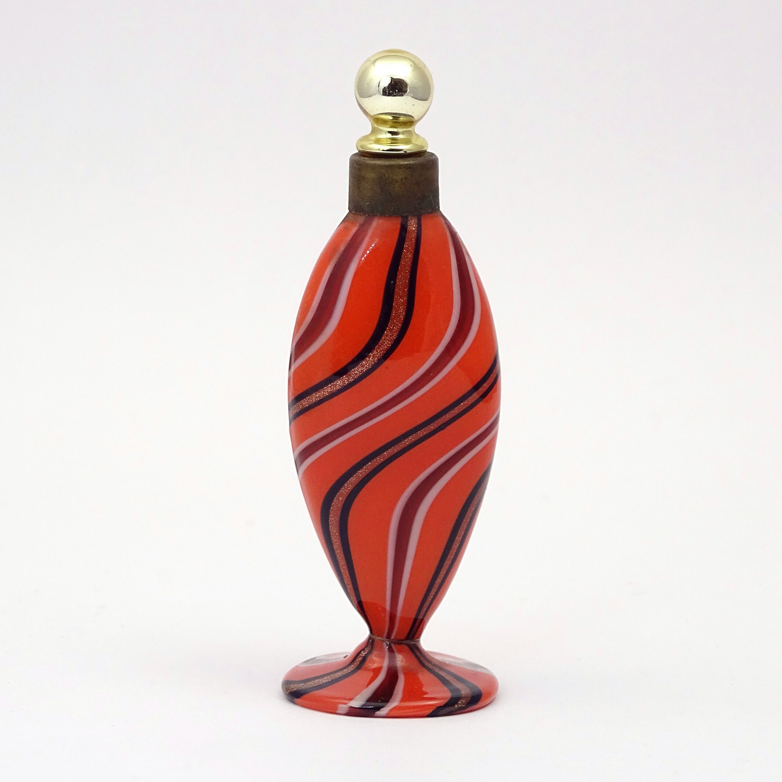 Oval blown mercury glass scent bottle with blue and white curving swirls on orange ground, standing on a pedestal. Metal collar and gold glass wand.