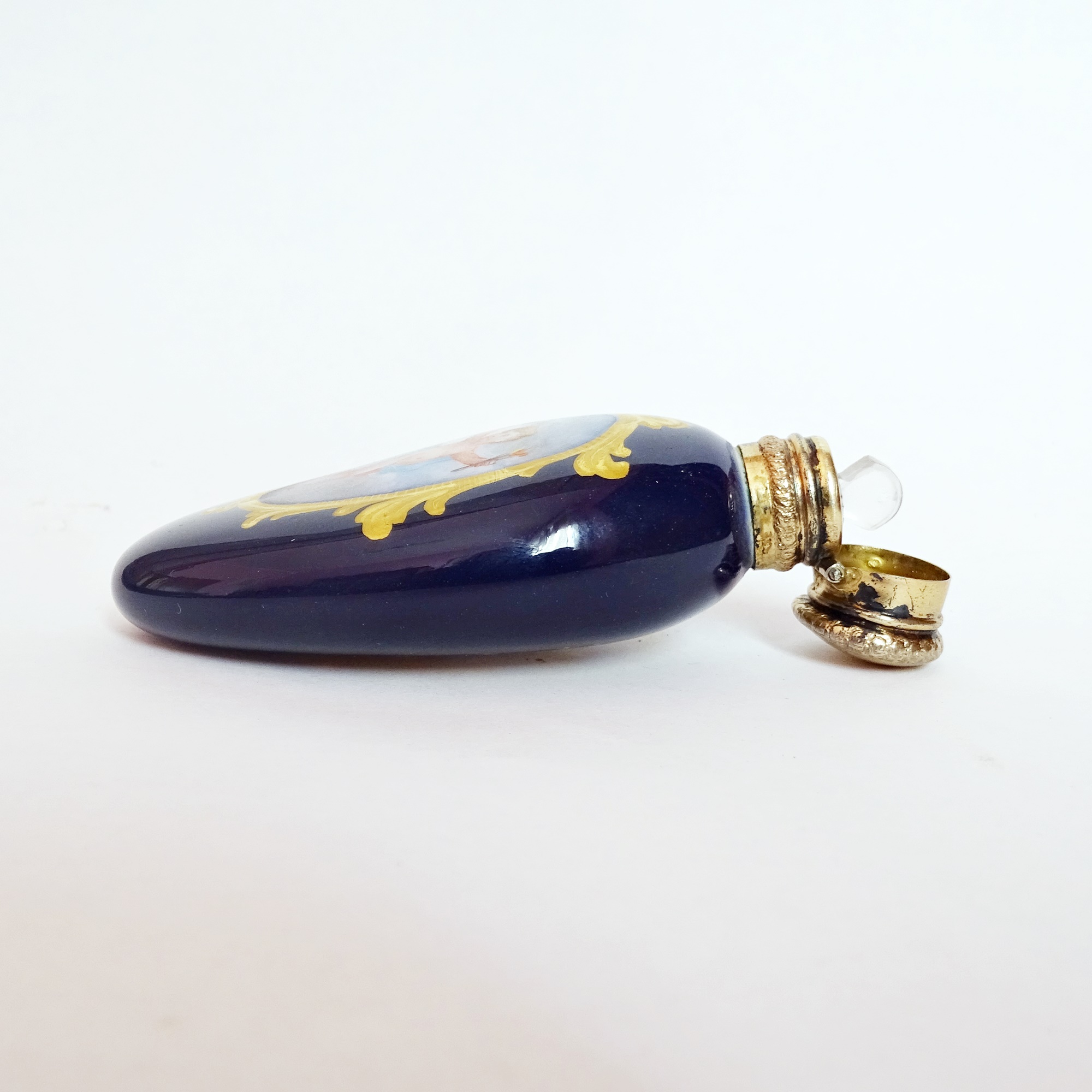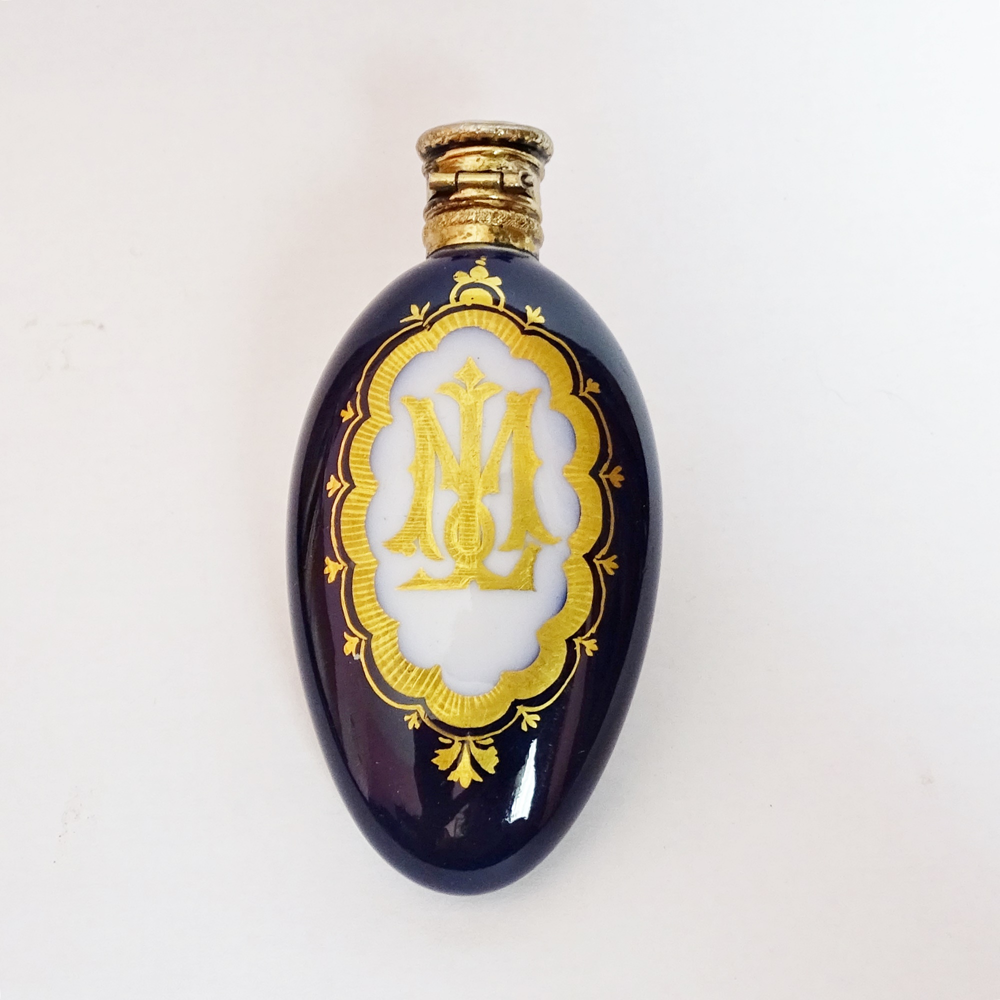 Oval blue-glazed porcelain scent bottle decorated with two medallions bordered by a gold frieze. The front features a cherub, while the other encloses the monogram ML. Vermeil mount and hinged cap, marked. Internal glass stopper. Probably Sèvres manufacture.