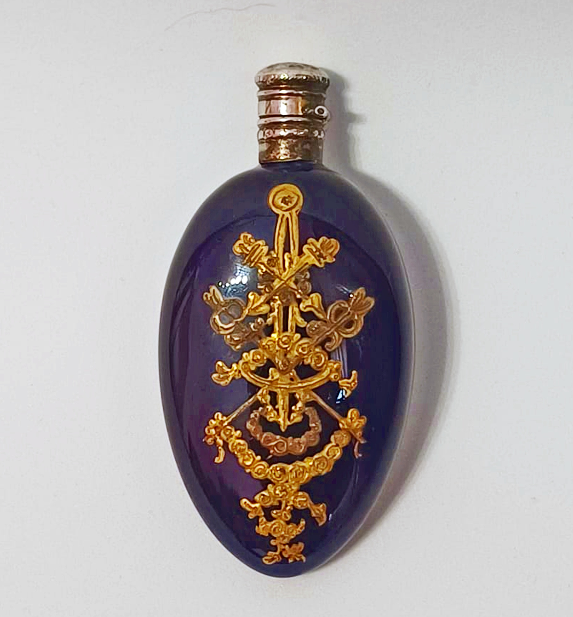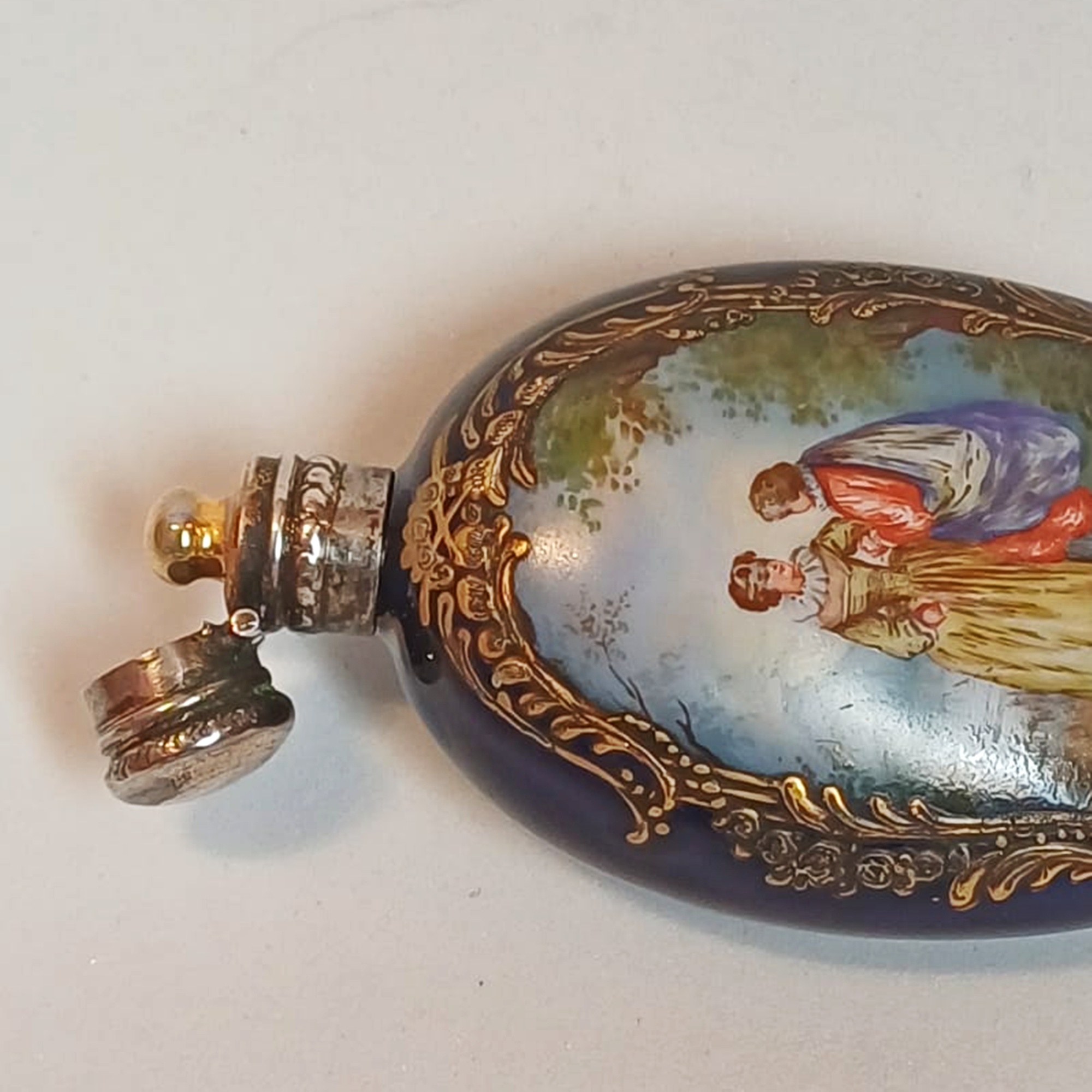 Flat, oval scent bottle in blue porcelain, typical of th Sèvres production. On the front is painted a courting scene in 18th century costume; on the back a rich gilt frieze. Silver mount and hinged cap with French punches.