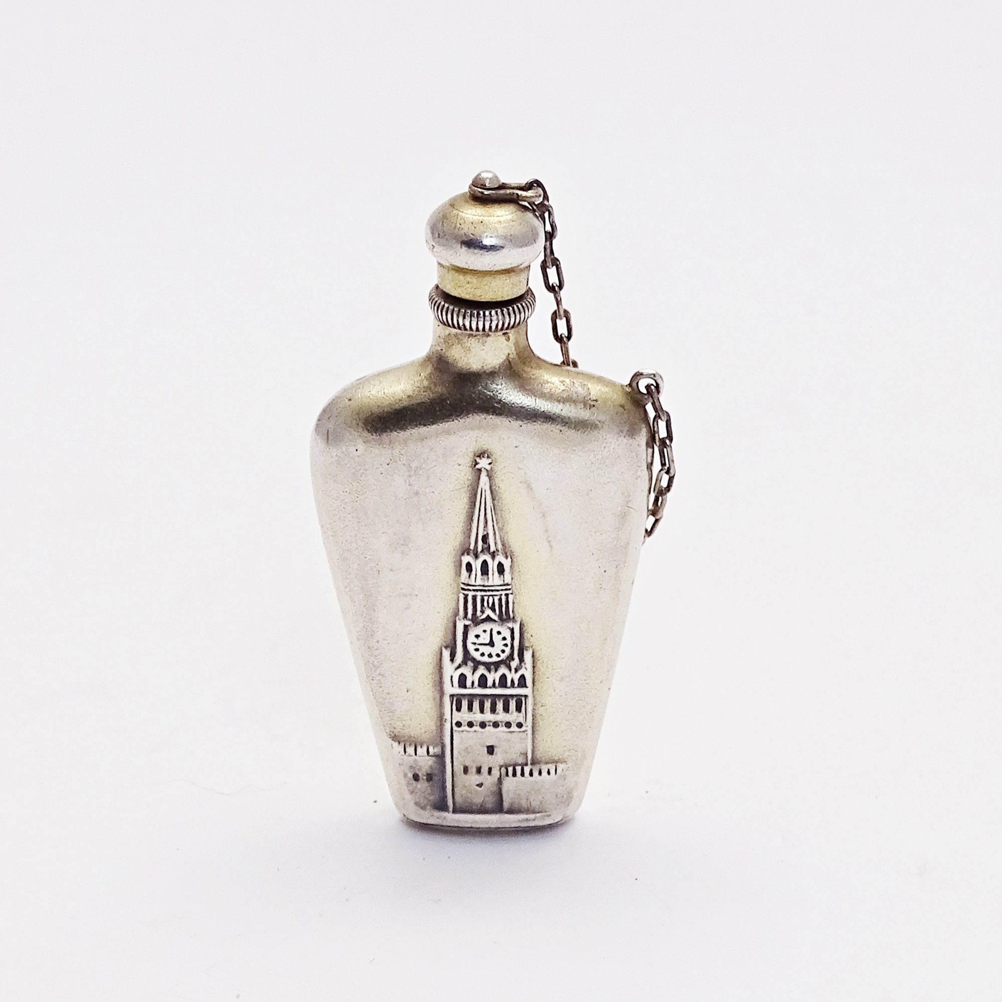 Soviet-era silver bottle depicting the Moscow Kremlin Clock Tower. Screw cap on a chain. Russian Soviet-era standard silver hallmark “875” and manufacturer’s mark.