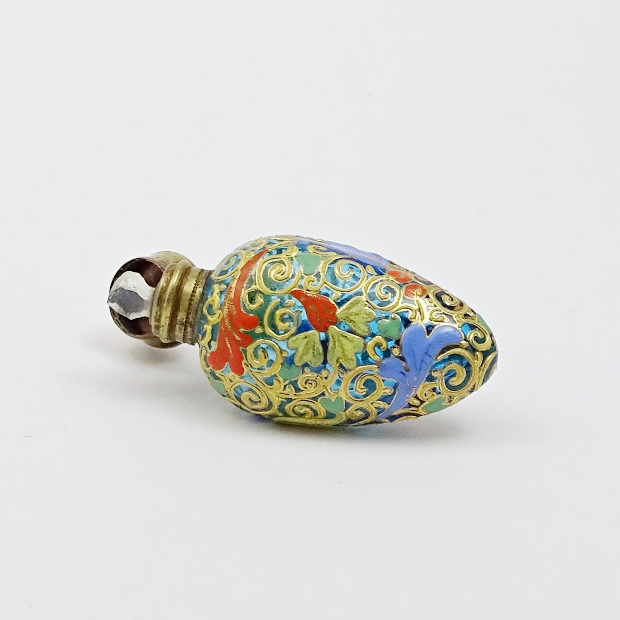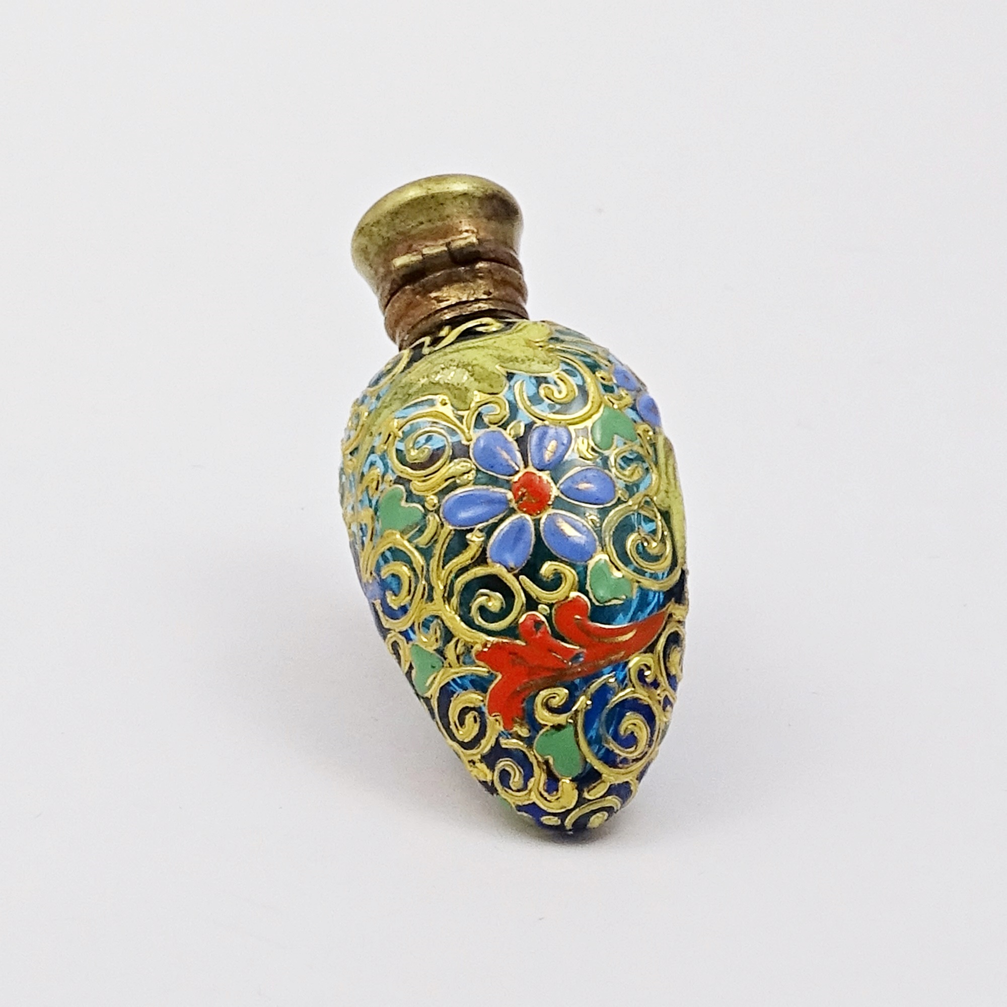 Home » Collection » Ovoidal scent bottle in turquoise glass with gold and colourful painted decor.