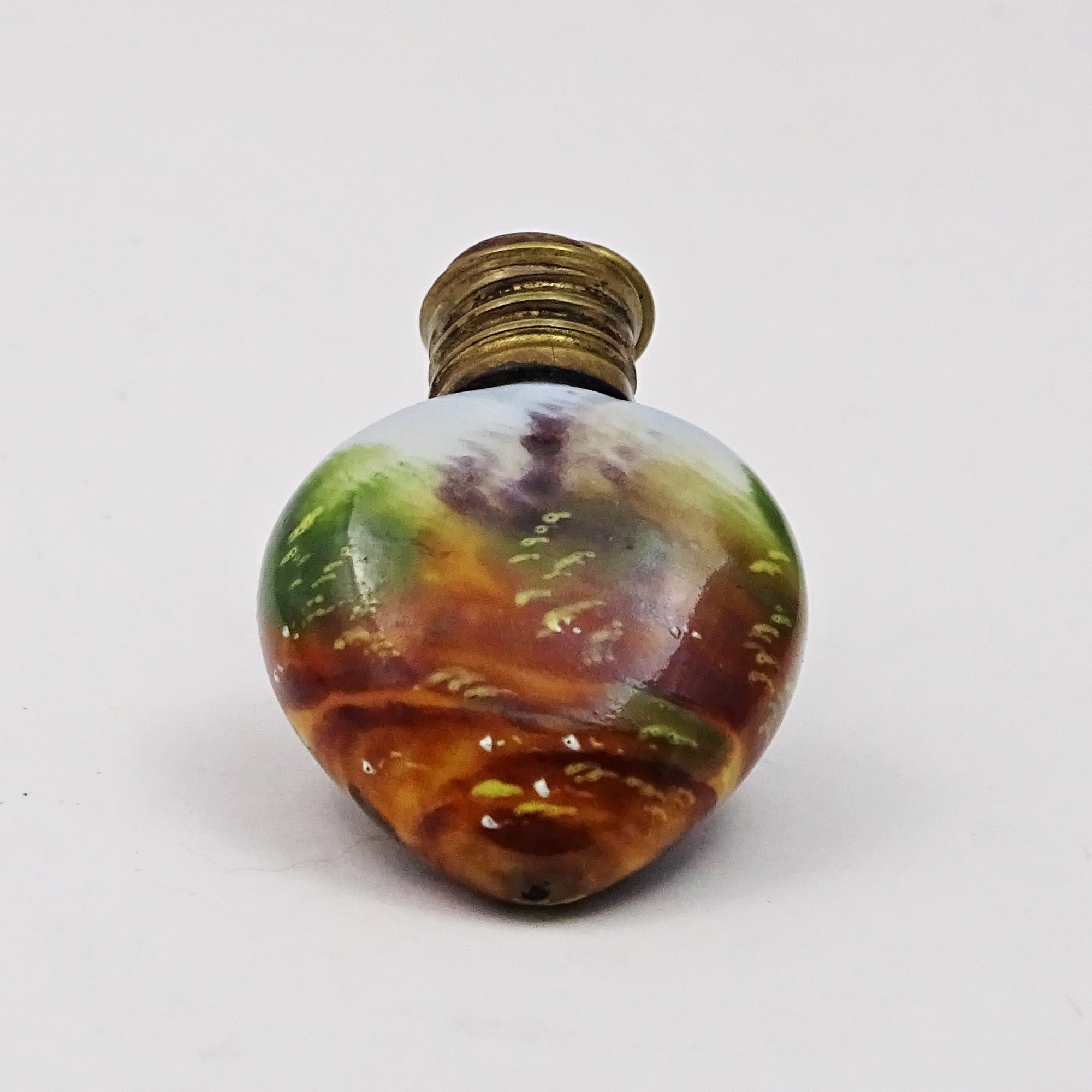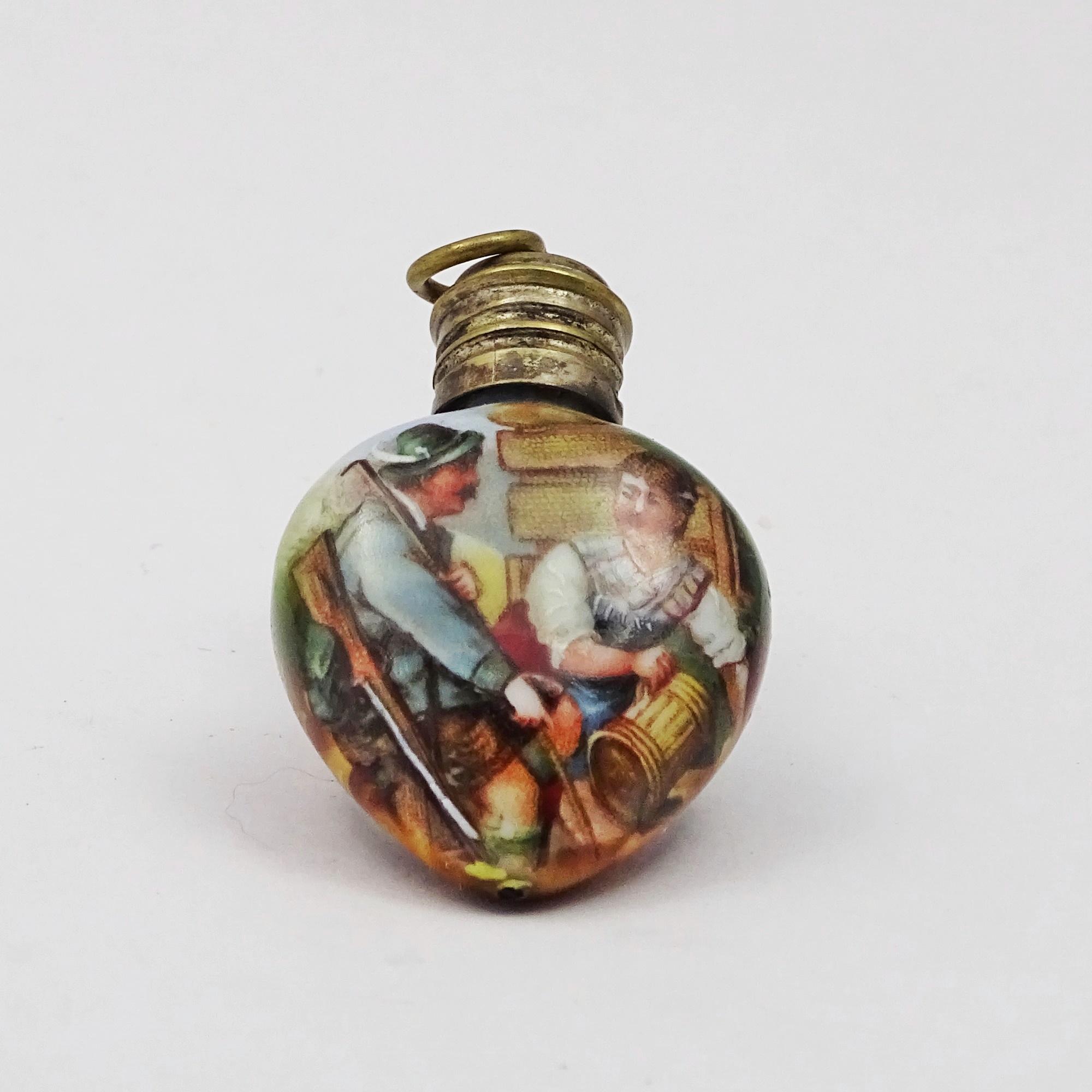Painted pottery scent bottle showing a rural courting scene. Screw brass cap with little suspension ring.