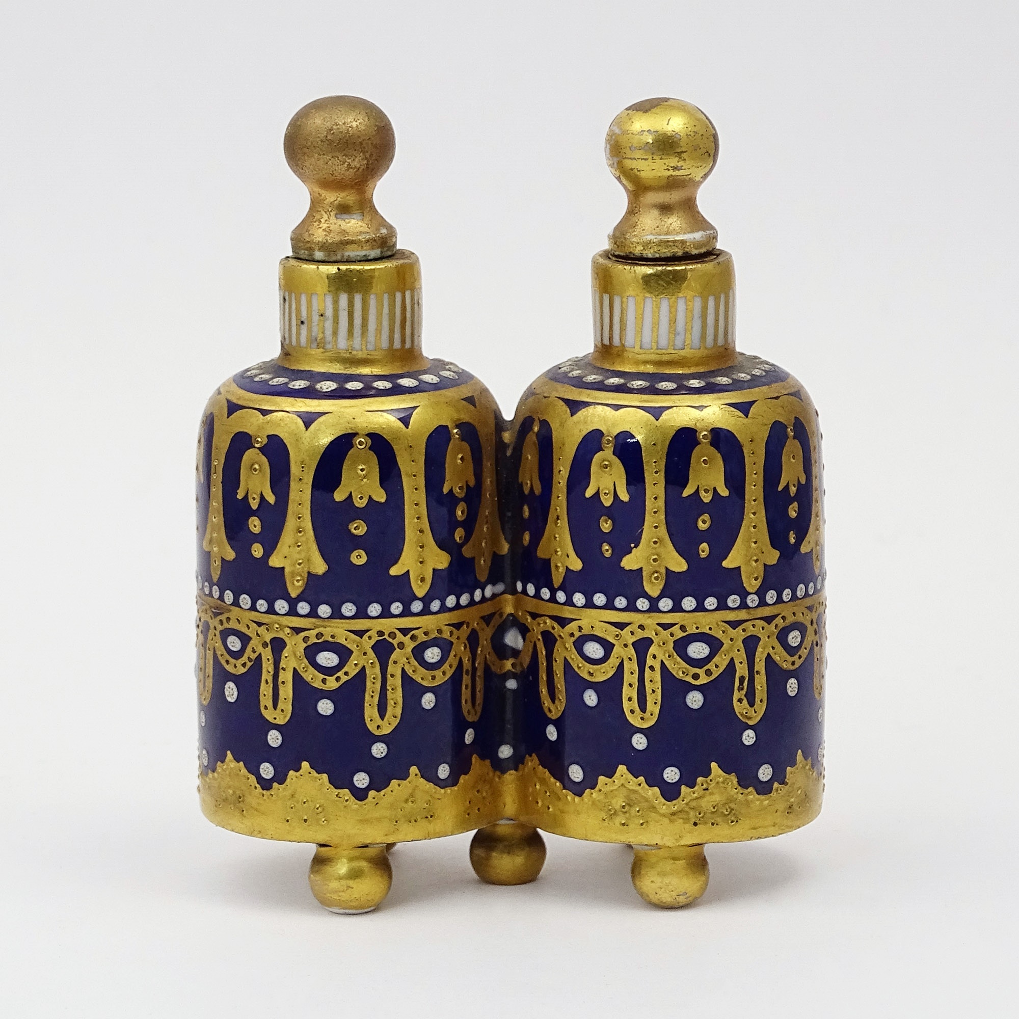 Pair scent bottles in blue porcelain with enamelled gilt and decorated with raised white dots. It stands on 5 gilt bun feet. Gilded globular stoppers fit securely in the cork lined necks. Coalport factory, colour Mazarin blue.