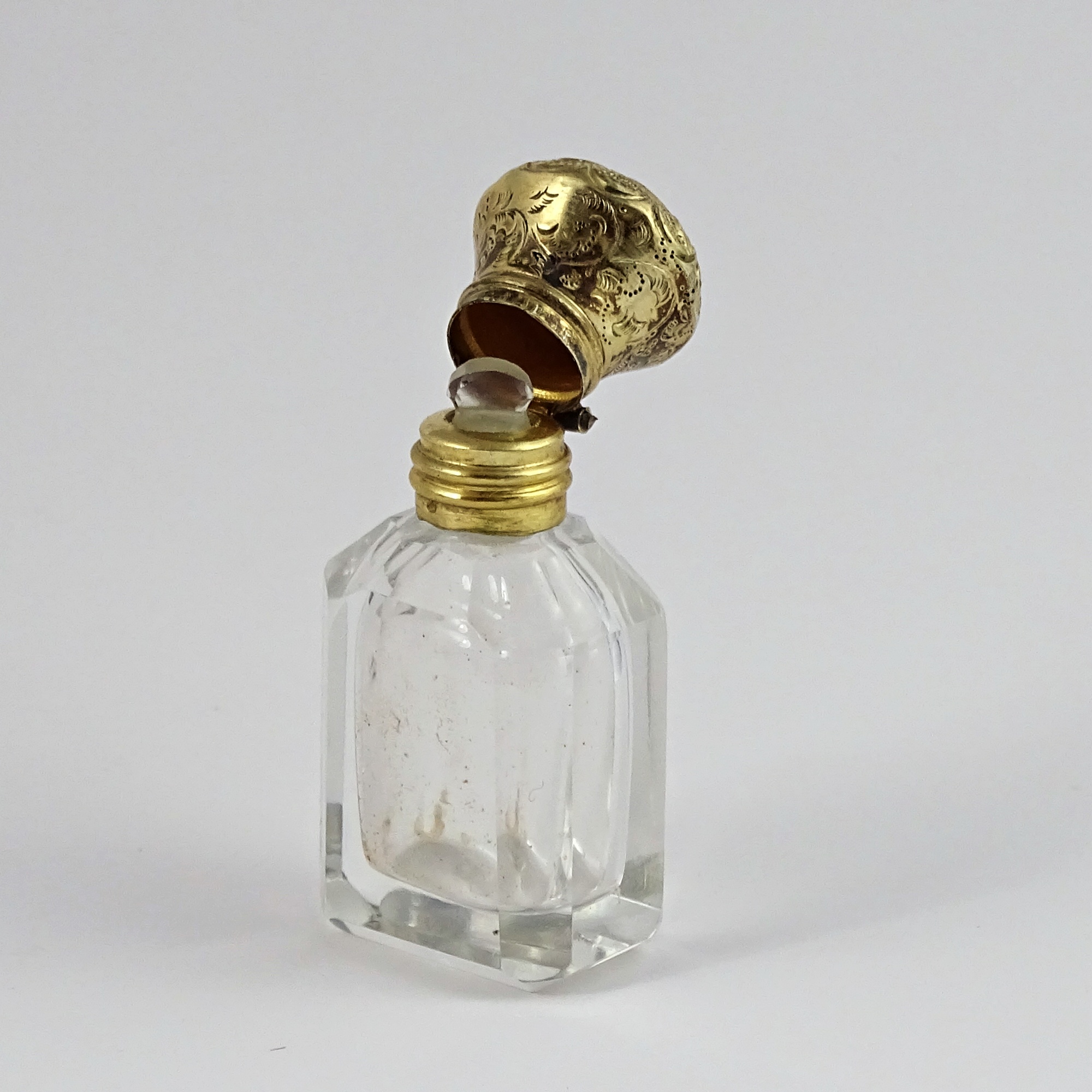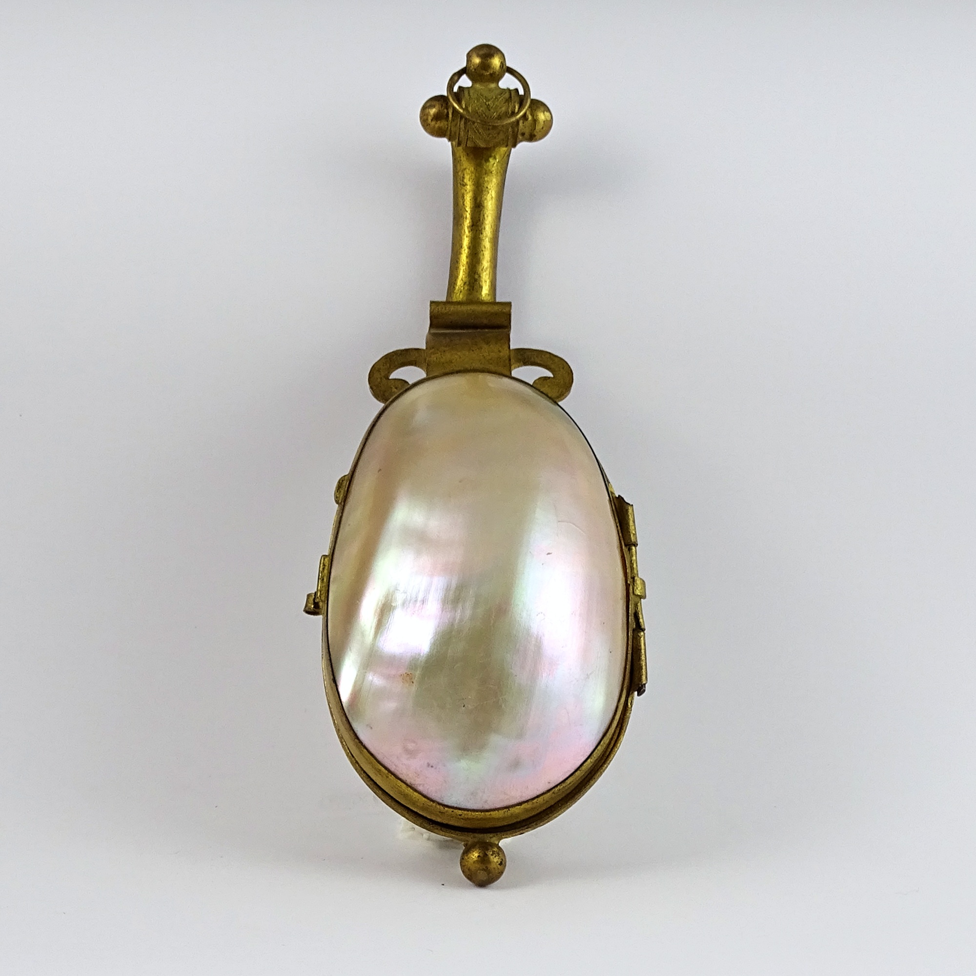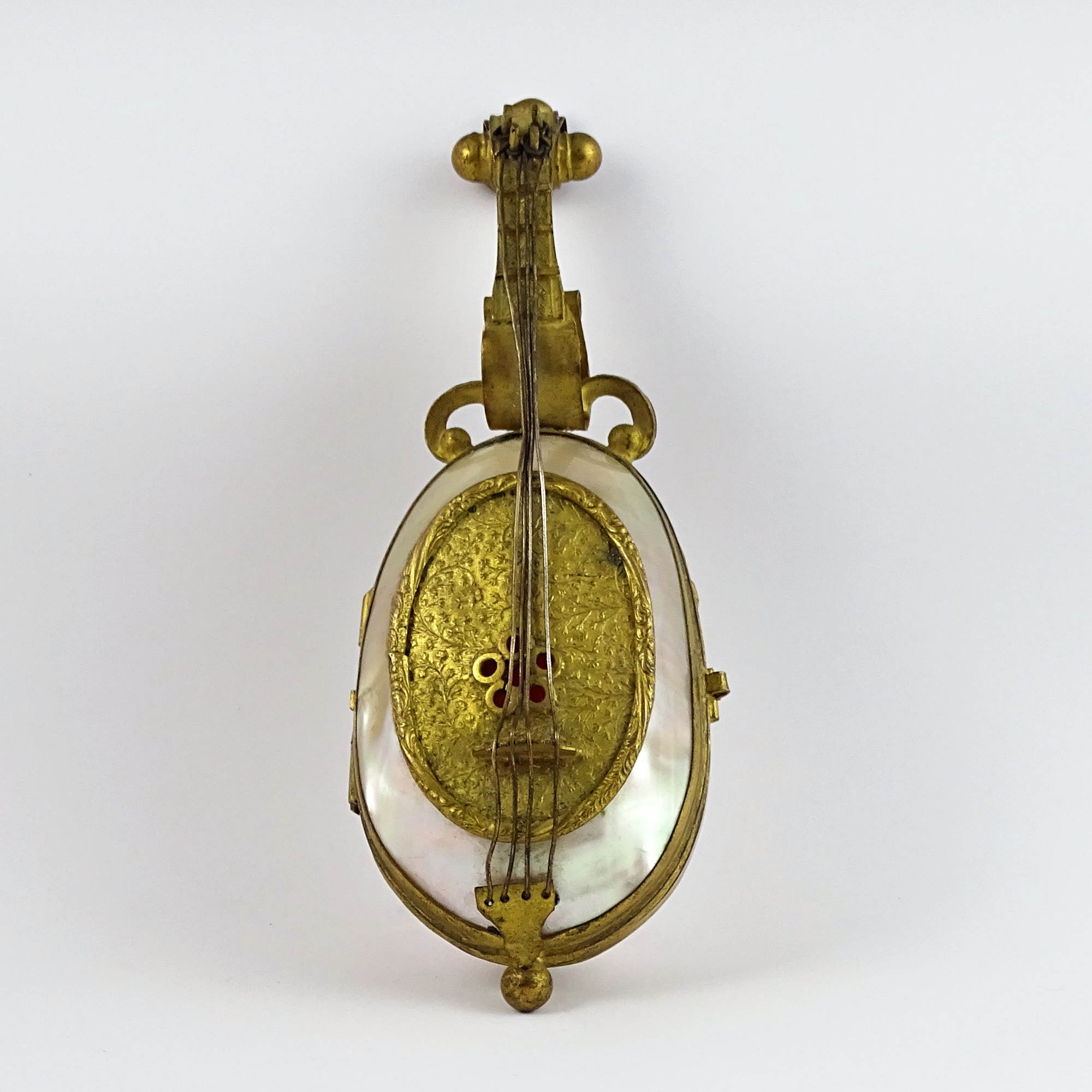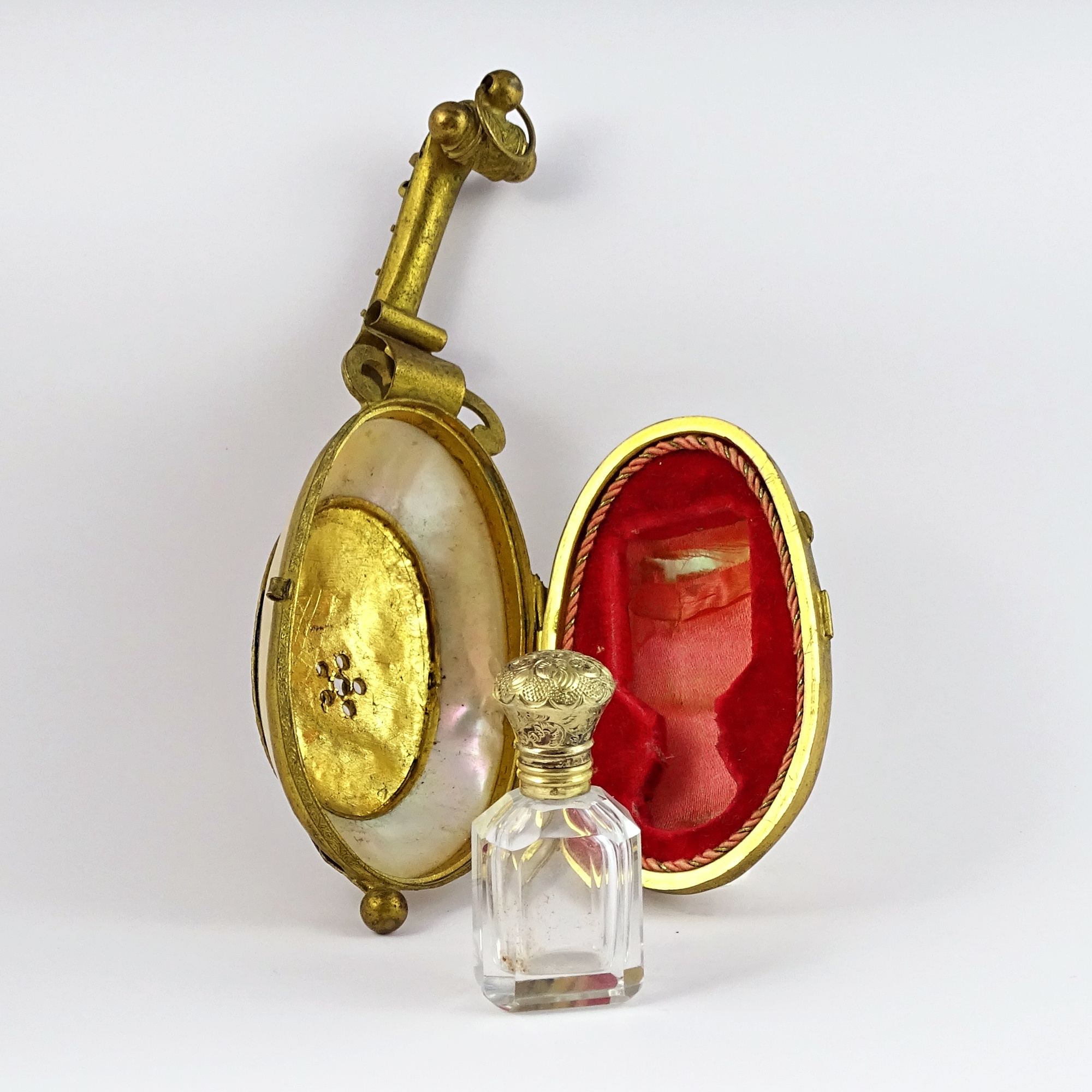 Palais Royal presentations: a mandolin-shaped mother-of-pearl vase with brass trim and handle, ending in a suspension ring. The mandolin opens to reveal a vermeil glass perfume bottle with a hinged cap and an internal glass stopper. Curiously, the bottle, nestled in a red velvet base surrounded by a cord, hangs upside down.
