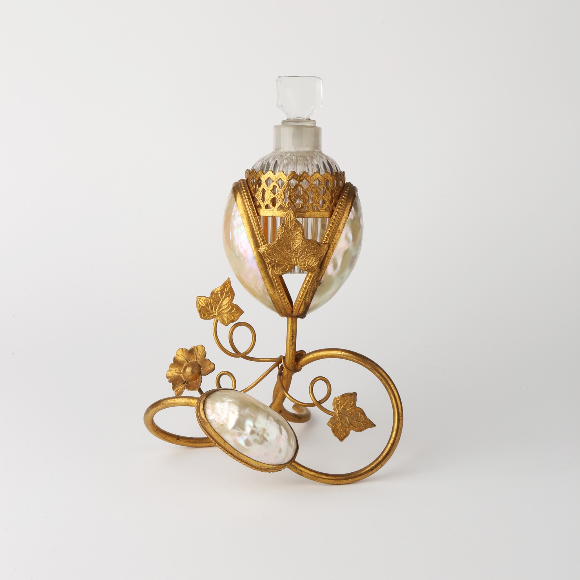 Palais Royal presentation, showing a cylindrical faceted clear glass bottle enclosed in an open mother of pearl “egg” supported by a sinuous brass ivy branch in bronze dorè, completed by another nacre valve. Glass stopper.
